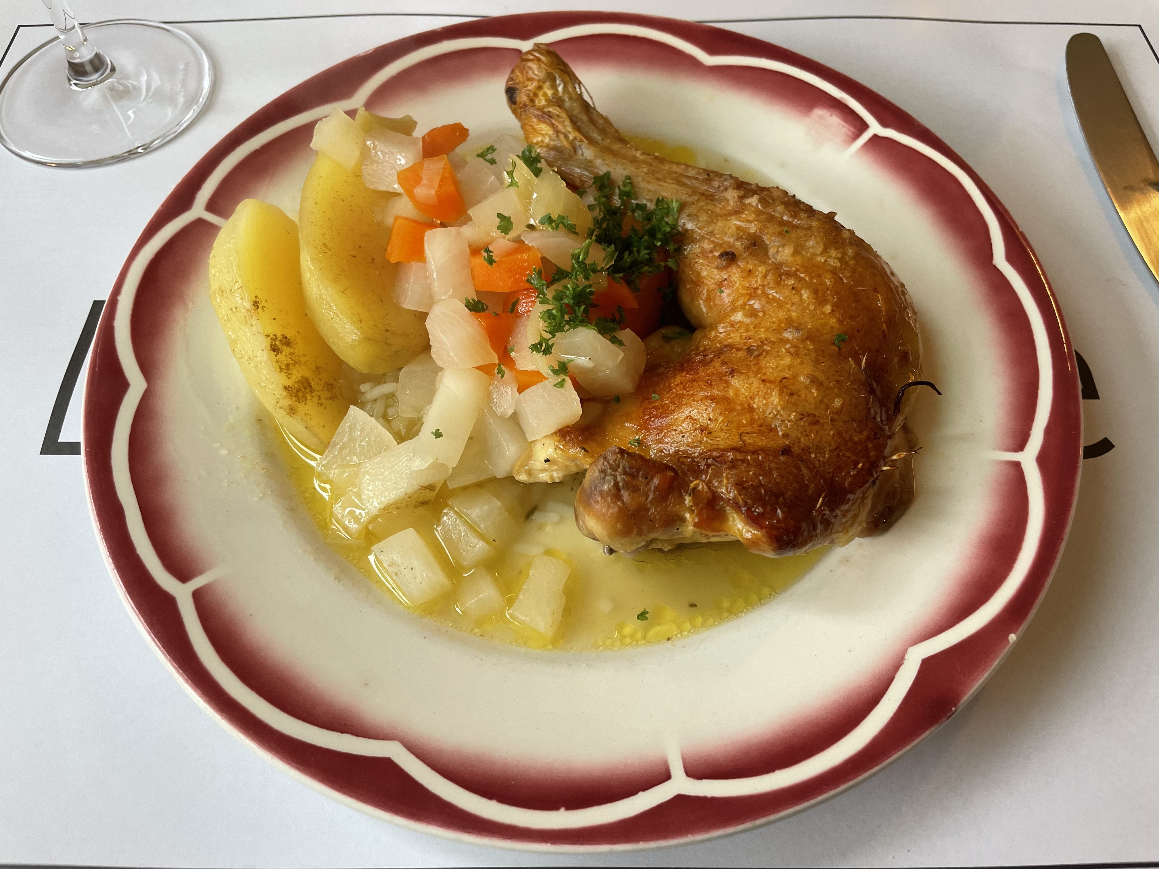 Recommandation absolue ! Je suis arrivée ici par hasard et ce fut un succès absolu : l'accueil et le service du propriétaire étaient tout simplement exceptionnels. Je donnerais sept étoiles si cela était possible. La nourriture est une cuisine maison savoureuse. 2 à 3 plats sont proposés par plat, changeant quotidiennement. Entrée, plat, fromage et dessert. Tous les cours ont des prix fixes, vous pouvez choisir si vous souhaitez suivre un cours et si oui lequel. Vous pouvez également y déguster d'excellentes boissons locales, que ce soit du champagne, des sodas ou de la bière. En plus de l'excellent service, l'ambiance est également géniale : une salle à manger agréable et lumineuse avec de nombreuses petites tables. Le grand bar et le buffet avec des marqueteries magnifiquement restaurées sont impressionnants. Le restaurant, y compris les toilettes, est accessible aux personnes à mobilité réduite. Il est conseillé de parler français avant de visiter. Et enfin: Le rapport qualité-prix ne pourrait pas être meilleur !
