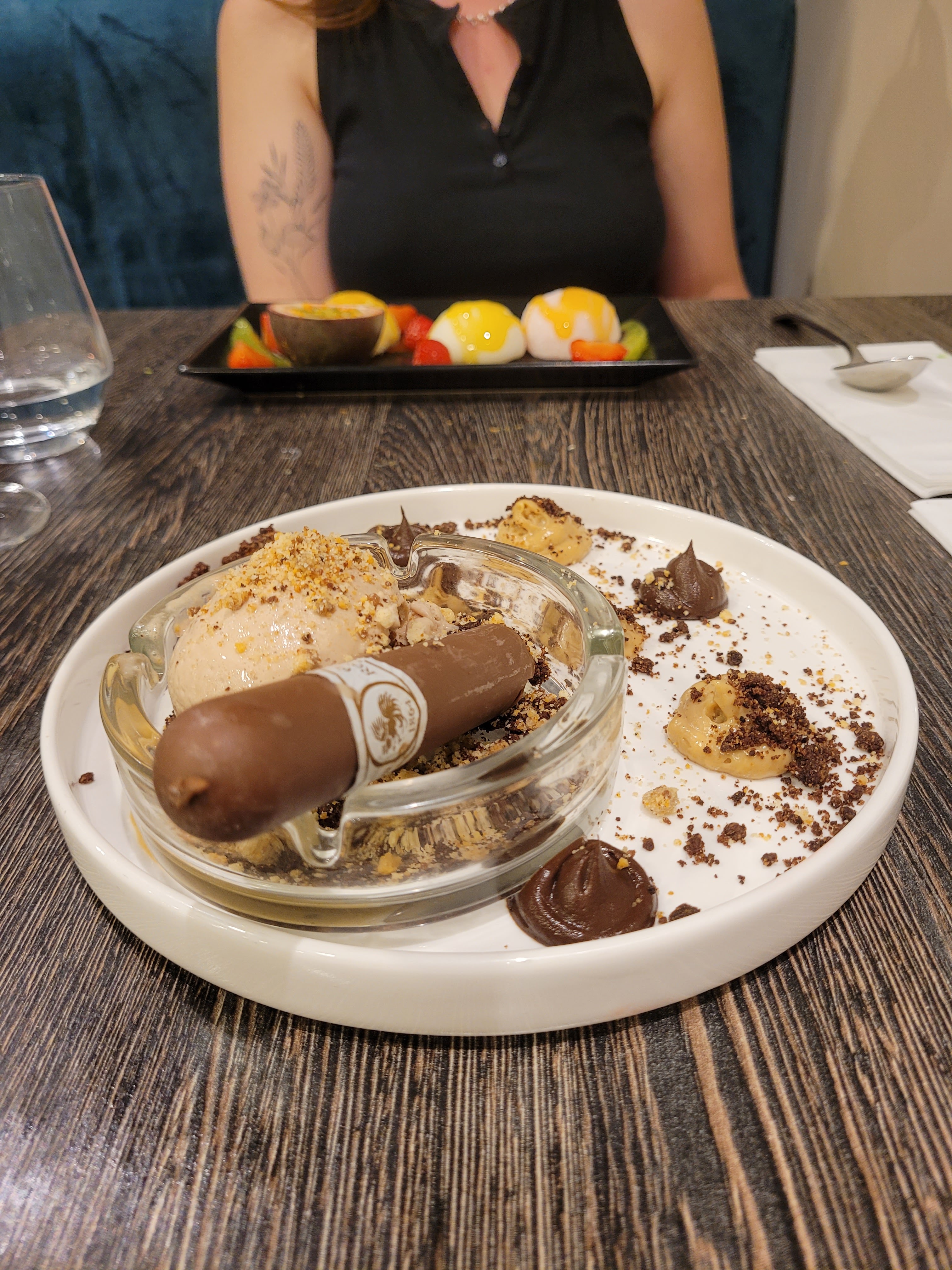 Repas du soir , restaurant avec un personnel sympathique , mais les prix sont bien trop élevés pour la nourriture proposée. Le summum est atteint avec les desserts où la on flirte avec l’arnaque culinaire. 13€ Leur “boîte au chocolat”, dessert censé imiter une boîte de cigare, arrivant fumante sur la table, et on découvre à l’intérieur une petite imitation de cigare au chocolat, impossible à manger avec des couverts, sans saveur …. À fuir absolument.