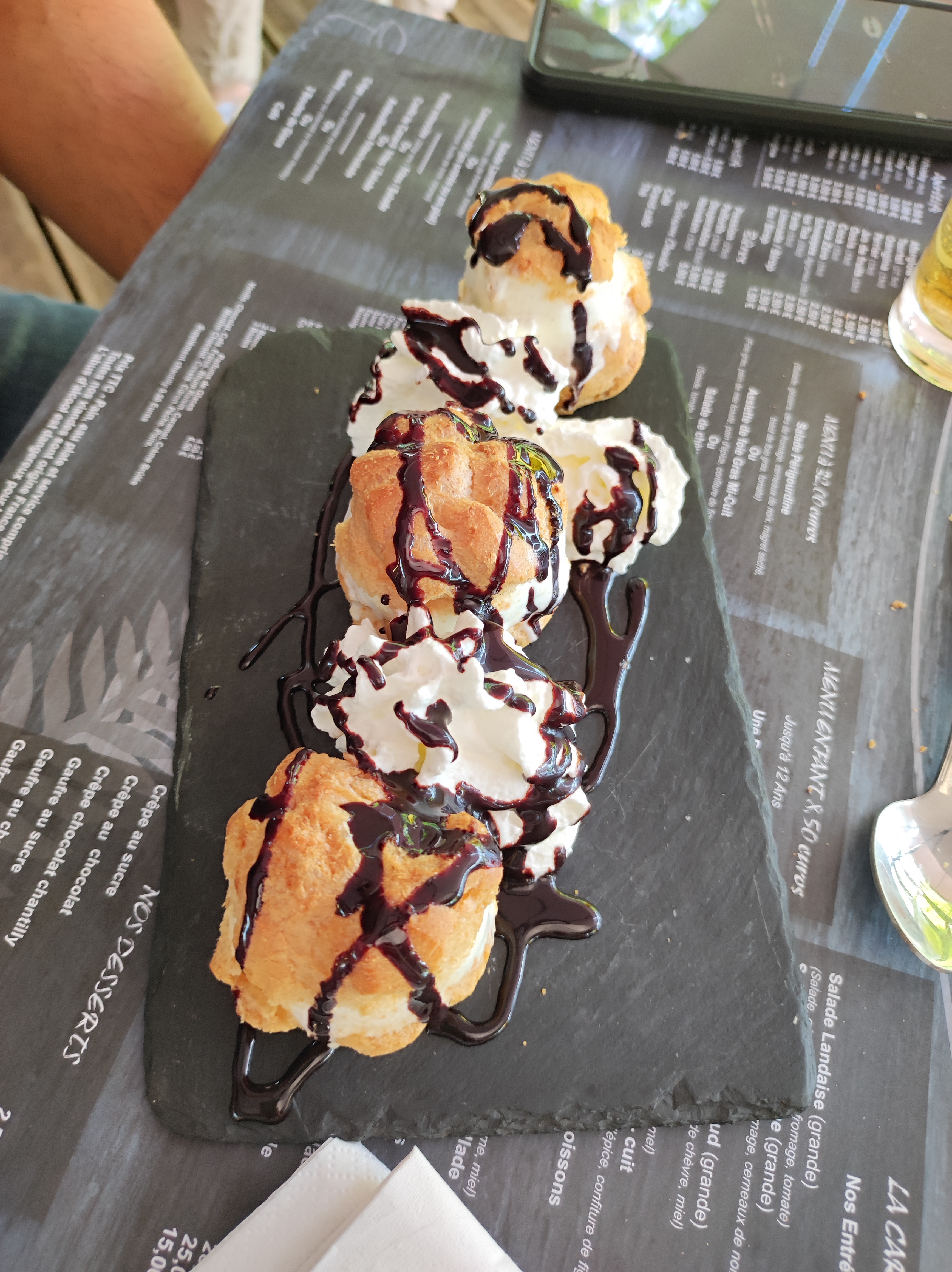 La nourriture était délicieuse, il y avait plein de choses à manger si vous avez un gros appétit. Beaucoup de choix. Si vous êtes anglais, soyez prêt à utiliser vos compétences pour parler et comprendre le français, mais nous avons réussi. Cadre magnifique au bord d'un lac, si nous restons dans cette région, nous y retournerions