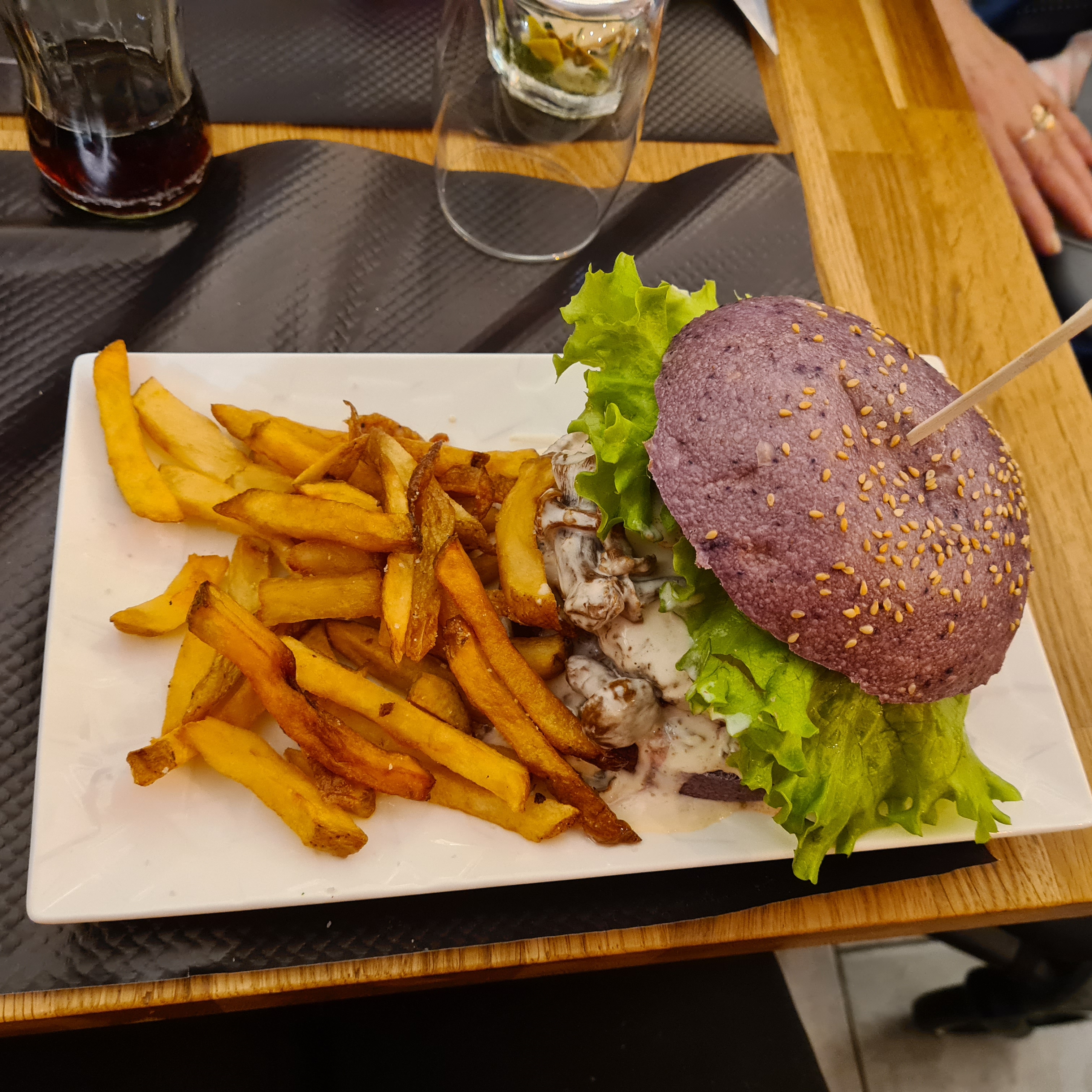 Plats assez chers au vu du lieu. La terrasse ressemble à un parking aménagé, elle n’est pas très agréable. J’ai pris un burger veggie a 21€ qui s’est révélé très fade, le « steack » n’était pas très bon, j’aurais préféré une galette de légumes. On ne sentait pas du tout la sauce aux olives que j’avais hâte de goûter… et en accompagnement j’ai dû me contenter de pomme de terre parce que les frites sont cuites à la graisse de bœuf! Quel dommage de proposer un burger veggie sans avoir les frites qui vont avec… en plus celles de mon conjoint étaient très grasses et molles. Merci tout de même à la serveuse qui a eu la présence d’esprit de me prévenir pour les frites! Ce n’est pas une adresse que nous retiendrons.