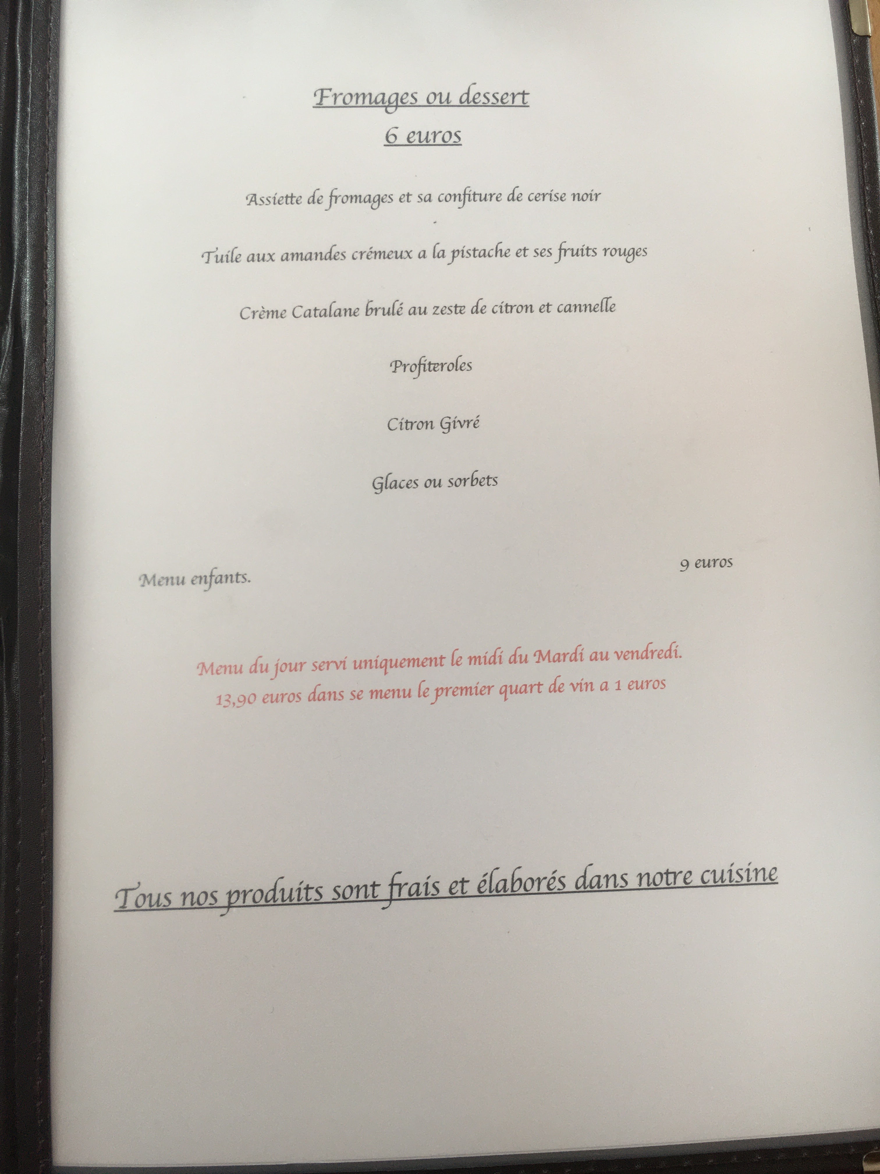 Repas qui ne vaux pas son prix . Pas le choix sur les groupes menus imposés avec 2 tranches de jambon en entrée , une vilaine tranche de lumo avec des pommes de terre et une crème catalane trop liquide. Tout ça pour 25 euro . Une honte