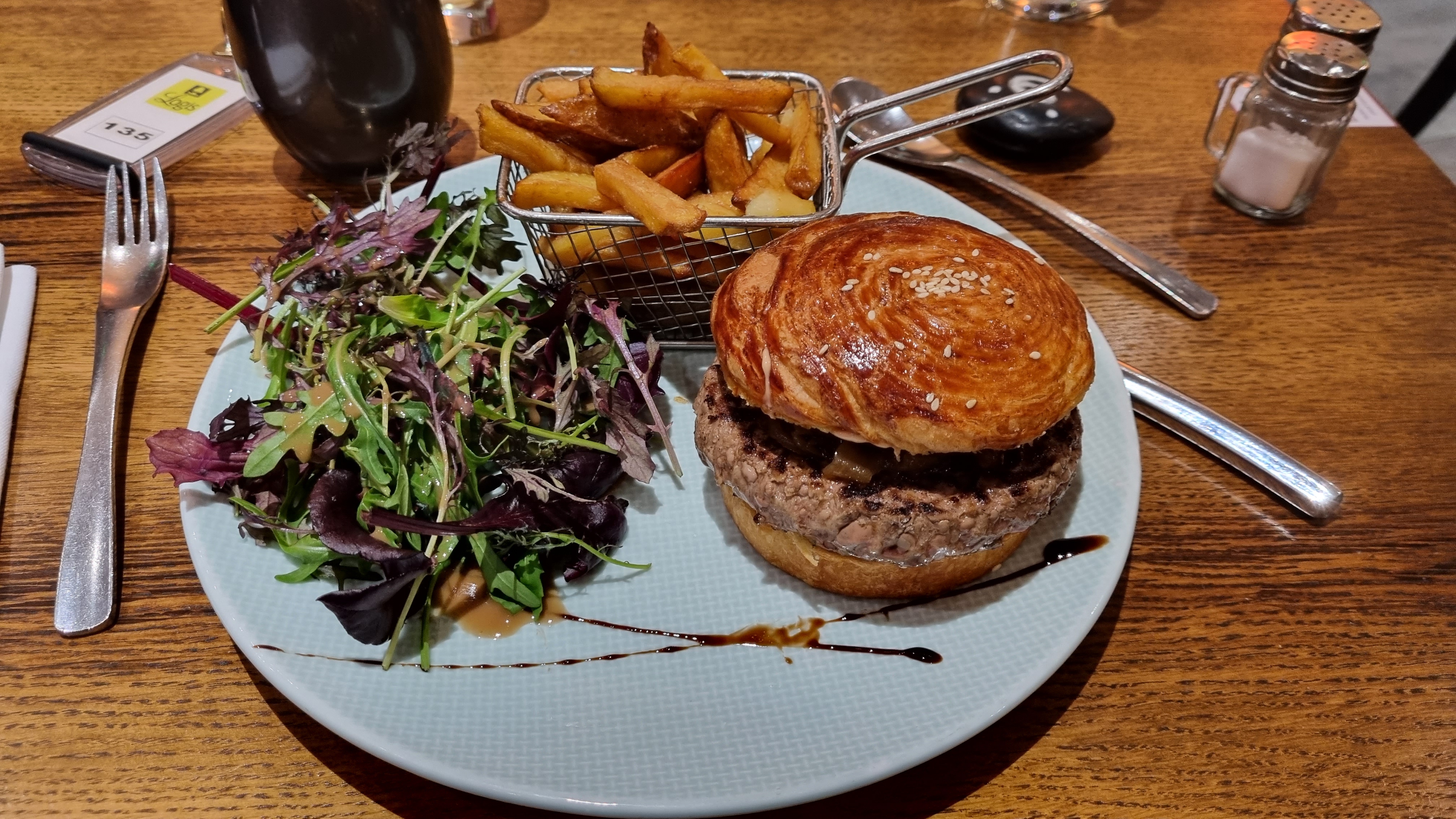 Très bonne expérience dans ce restaurant qui fait hôtel également. Nous avons pris le menu à 17 € (plat + dessert) avec une boisson pour 20,50 € chacun. Le burger était parfait, et très bon.😋 J'ai adoré également la mousse au chocolat entourée d'un craquant de chocolat.