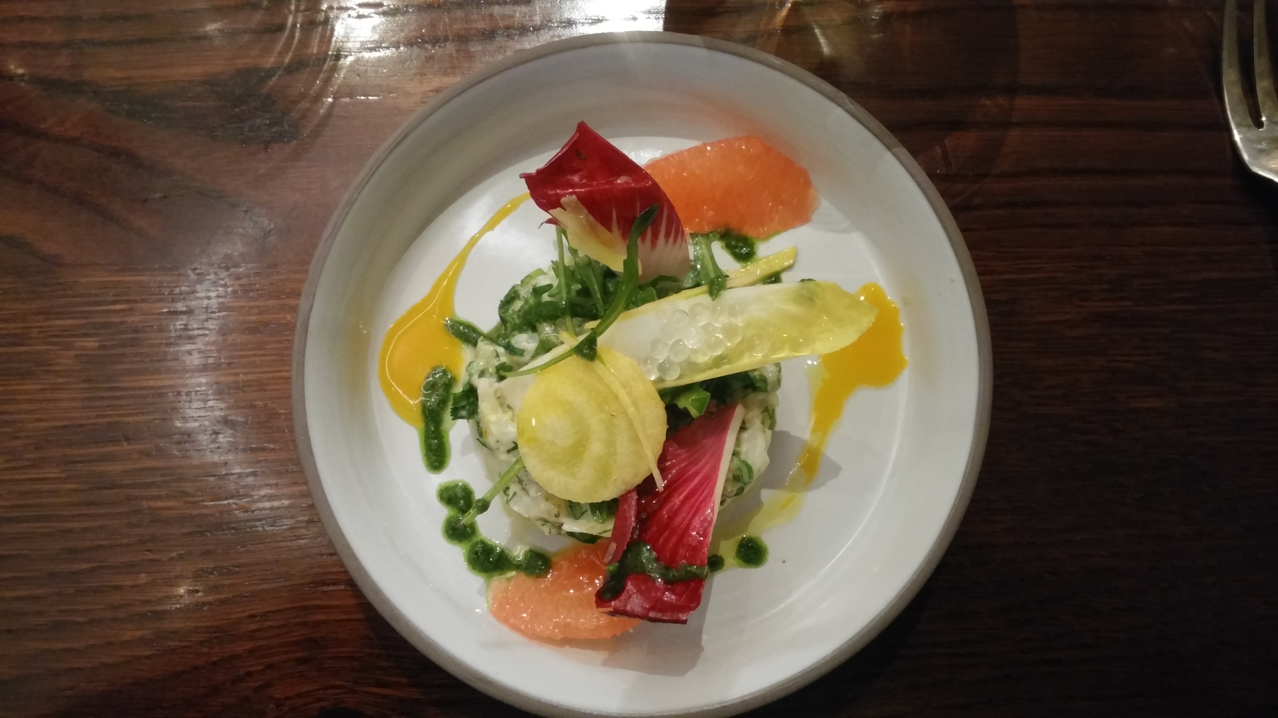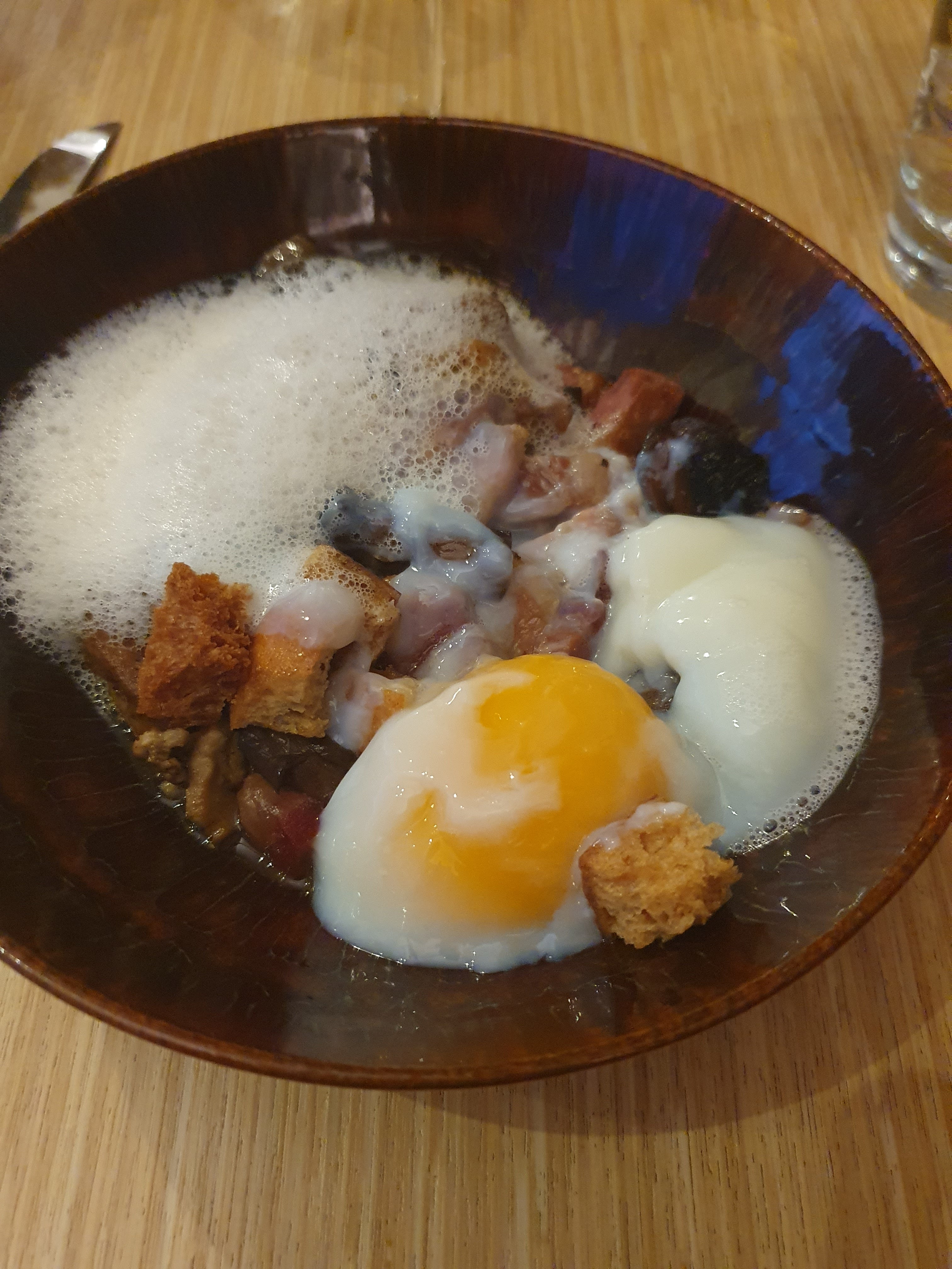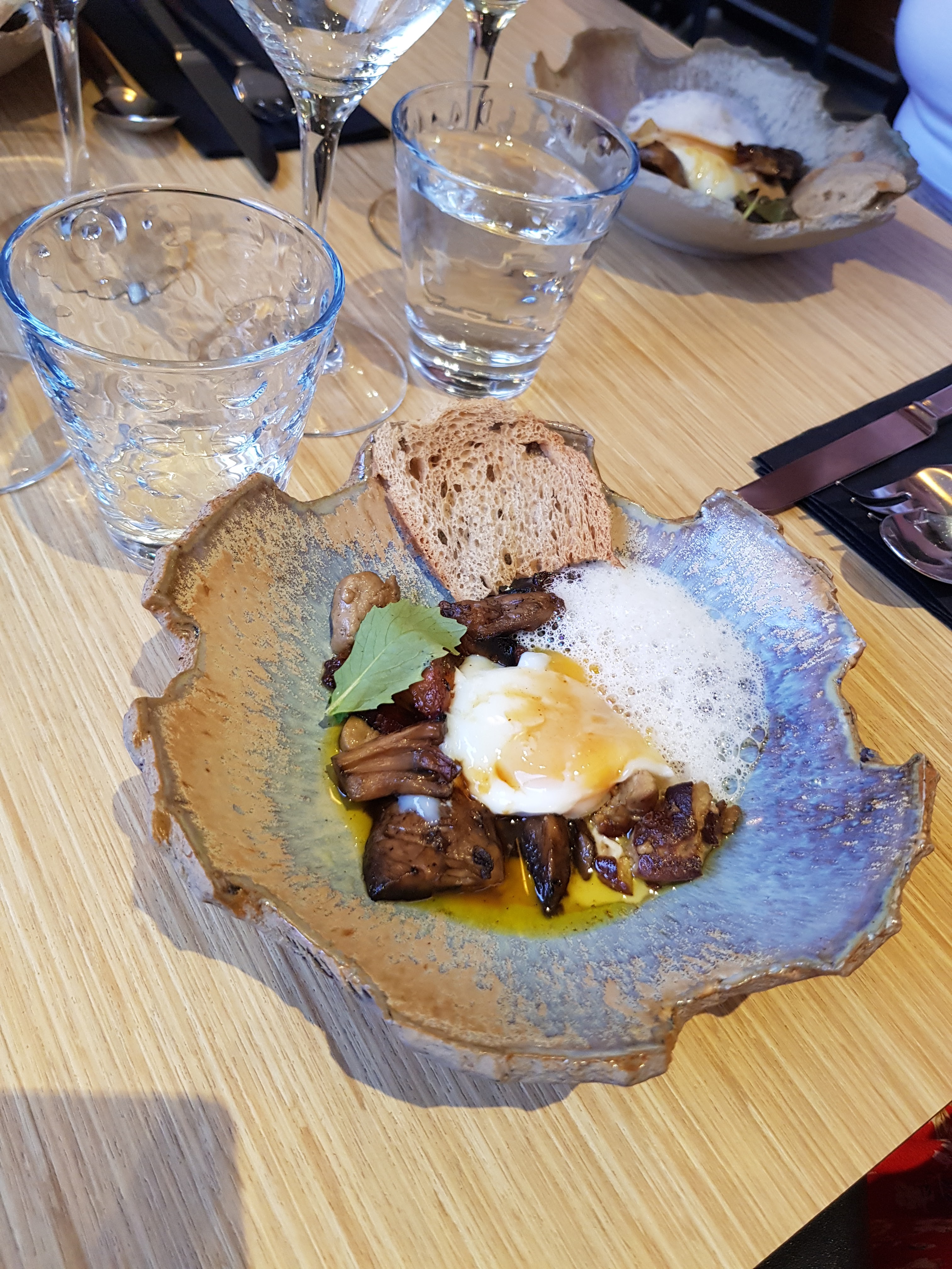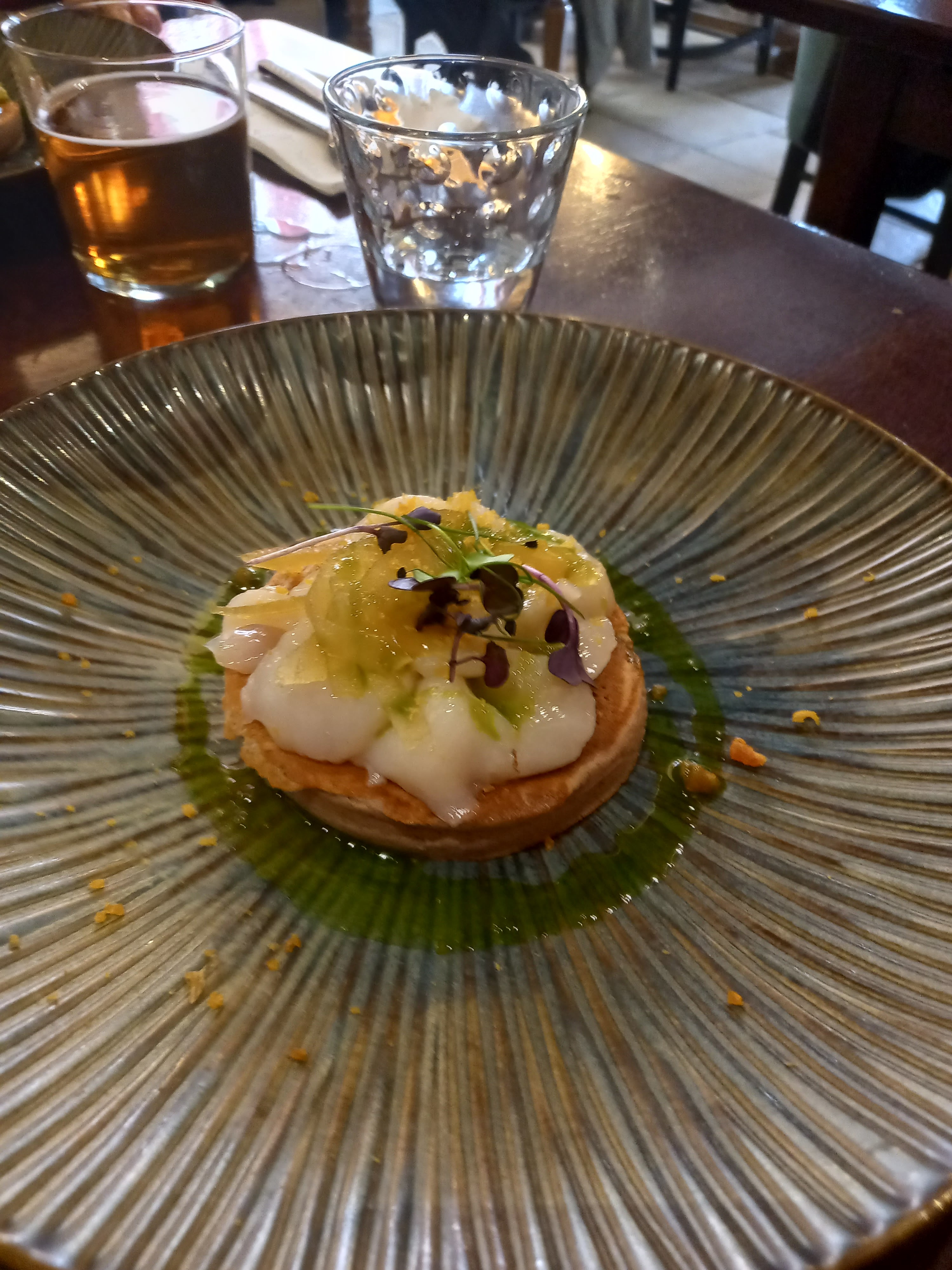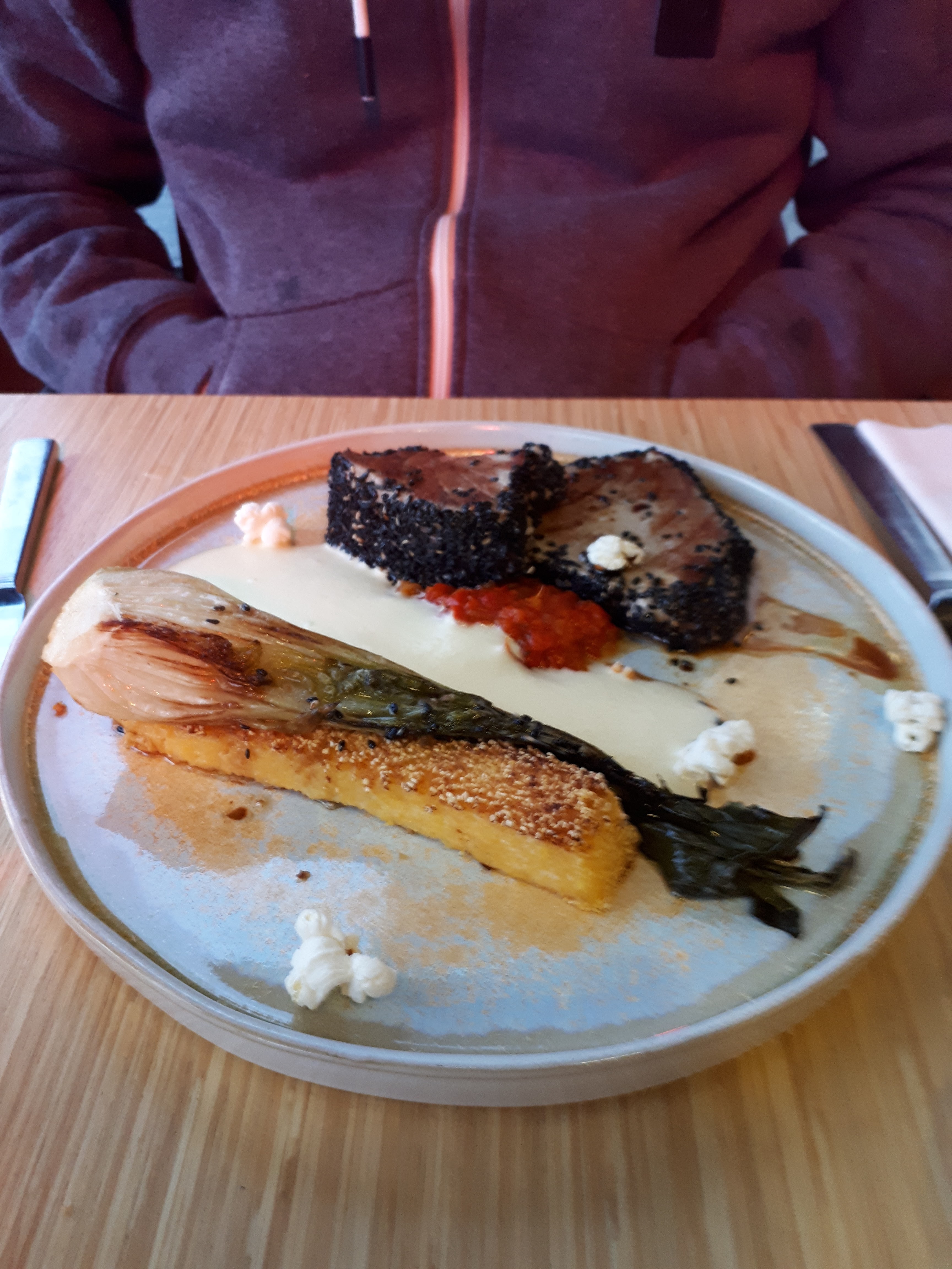 Petite découverte en amoureux d'un restaurant autour d'un menu surprise dégustation. Ceviche de daurade, Oeuf cocote et son foie gras poêlé accompagné de sont toast jambon de Bayonne, Le plat, un maigre de ligne et sa purée de patate douce accompagné de légumes, Le dessert, pomme/poire caramélisées. Succulent