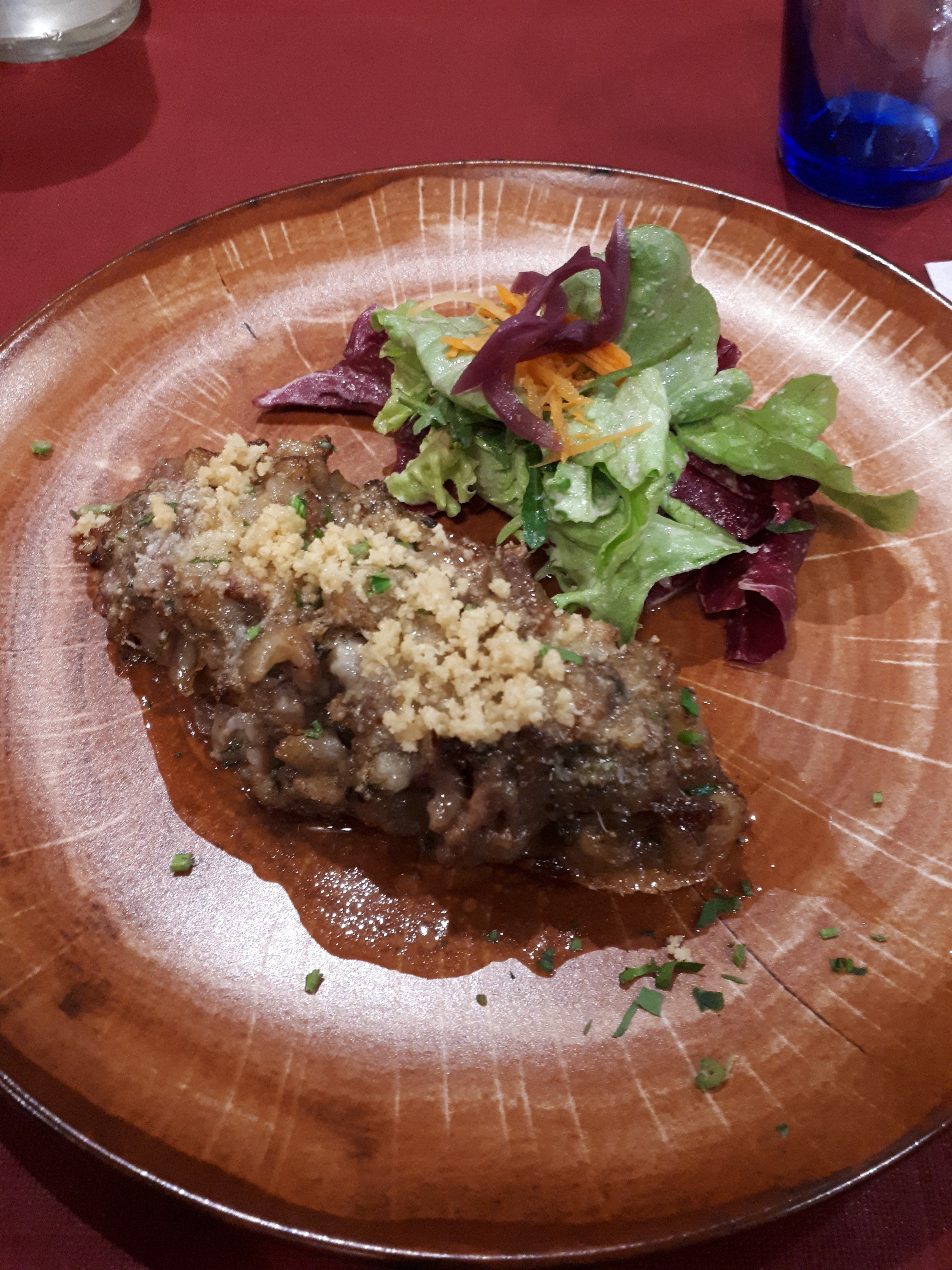 C’est sans doute la quatrième fois que je reviens, toujours avec plaisir, dans cet établissement qui pratique un menu original qui change tous les mois, avec des propositions créatives. J’ai pris en entrée une excellente cervelle de canut à l’ortie, sumac et haddock fumé, et un succulent Pastrami de boeuf aux épices de Montréal. Le tout servi sur une terrasse qui contemple la basilique d’Avioth. Le menu propose pour chaque plat un vin au verre soigneusement choisi. Le tout à un tarif modéré pour la qualité proposée. Une excellente adresse dans la région.