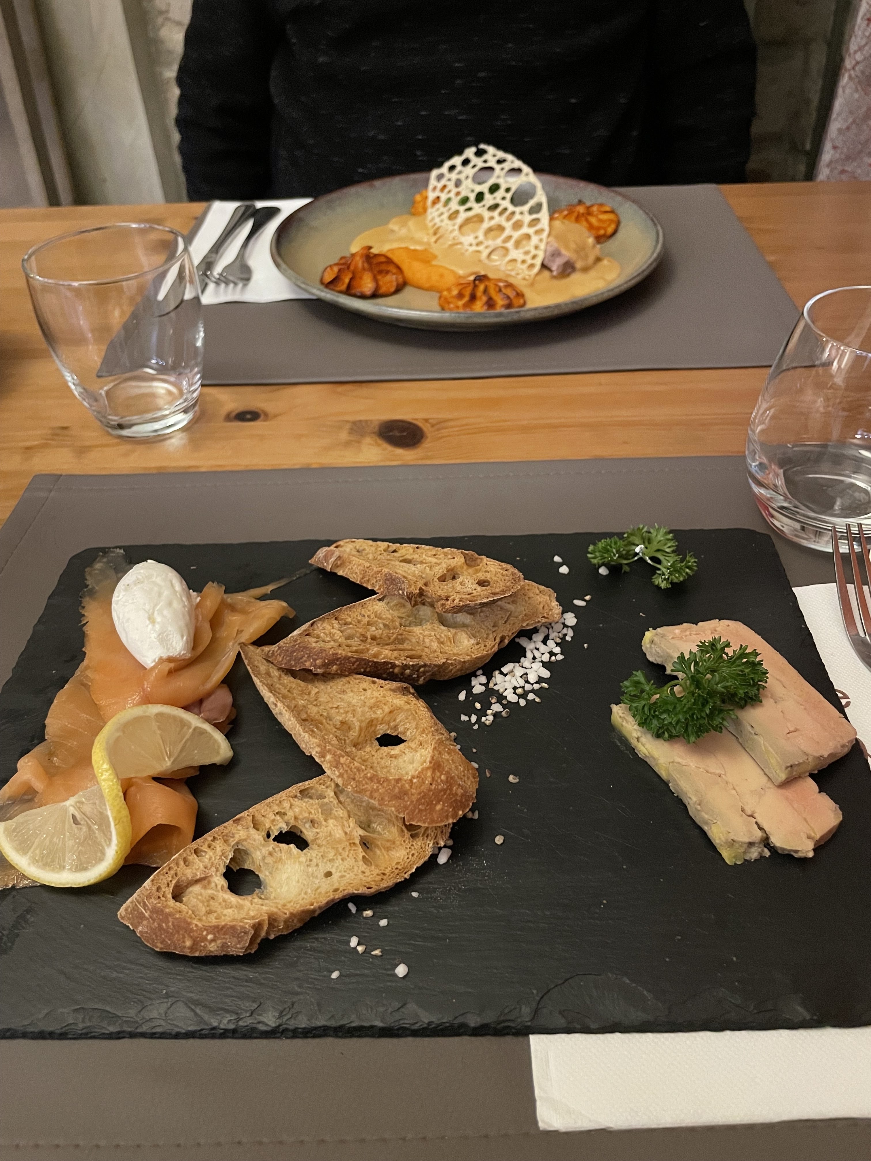 Bonjour, Duo de fois gras saumon Filet de saint-pierre sauce champagne Et les célèbres new banane chocolat Mon épouse a pris le menu Salade magrets farcis fois gras Langouste piment d'Espelette Magnifique un très bon moment
