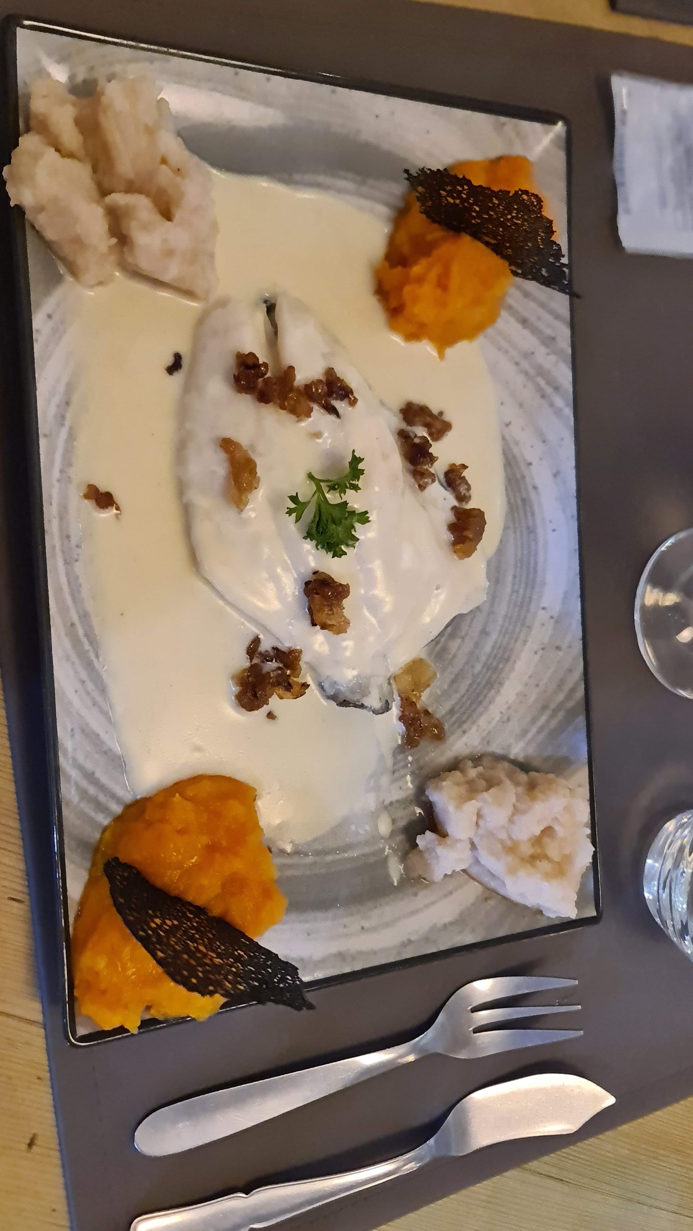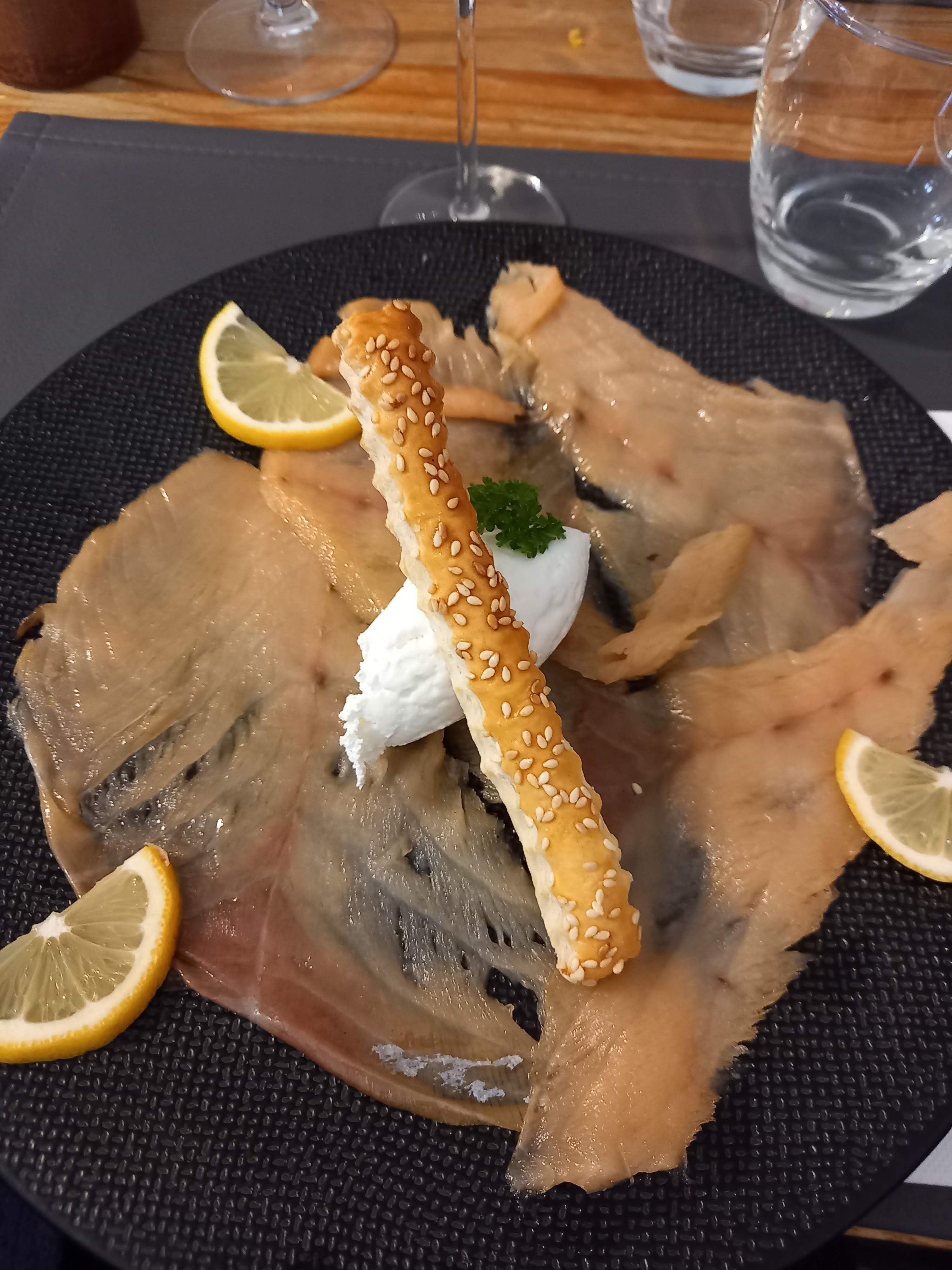 Âprès avoir vu les avis déposés, peut être en attentions un peu trop. Si l'accueil est irréprochable, déçus de s'installer autour d'une table en bois avec de simples sets de table et des serviettes en papier. Si mon mari a été enchanté de son entrée, et bien que mon croustillant de camenbert était parfait, il était accompagné de bien trop de salade assaisonnée depuis trop longtemps. Le plat chaud a été servi alors que mon mari n'est pas à table, donc avons mangé tiède, non, nous n'avons pas demandé à ce que l'on réchauffe les assiettes, cela aurait au détriment de la cuisson du poisson. Une très belle portion d'aile de raie et une sauce vanillée excellent, pourquoi ajouter autant d'olives noires ? Le dessert parfait pour nous deux. Un service irréprochable de la part du jeune serveur. Très belle salle aux tables bien séparées qui permet de discuter en toute discrétion. Mais s'il vous plait un peu plus de chauffage. La jeune femme nous a bien raccompagnée jusqu'à la porte. Bref un repas en demi-teinte. Il y a encore beaucoup de choses à améliorer pour mériter une note plus élevée