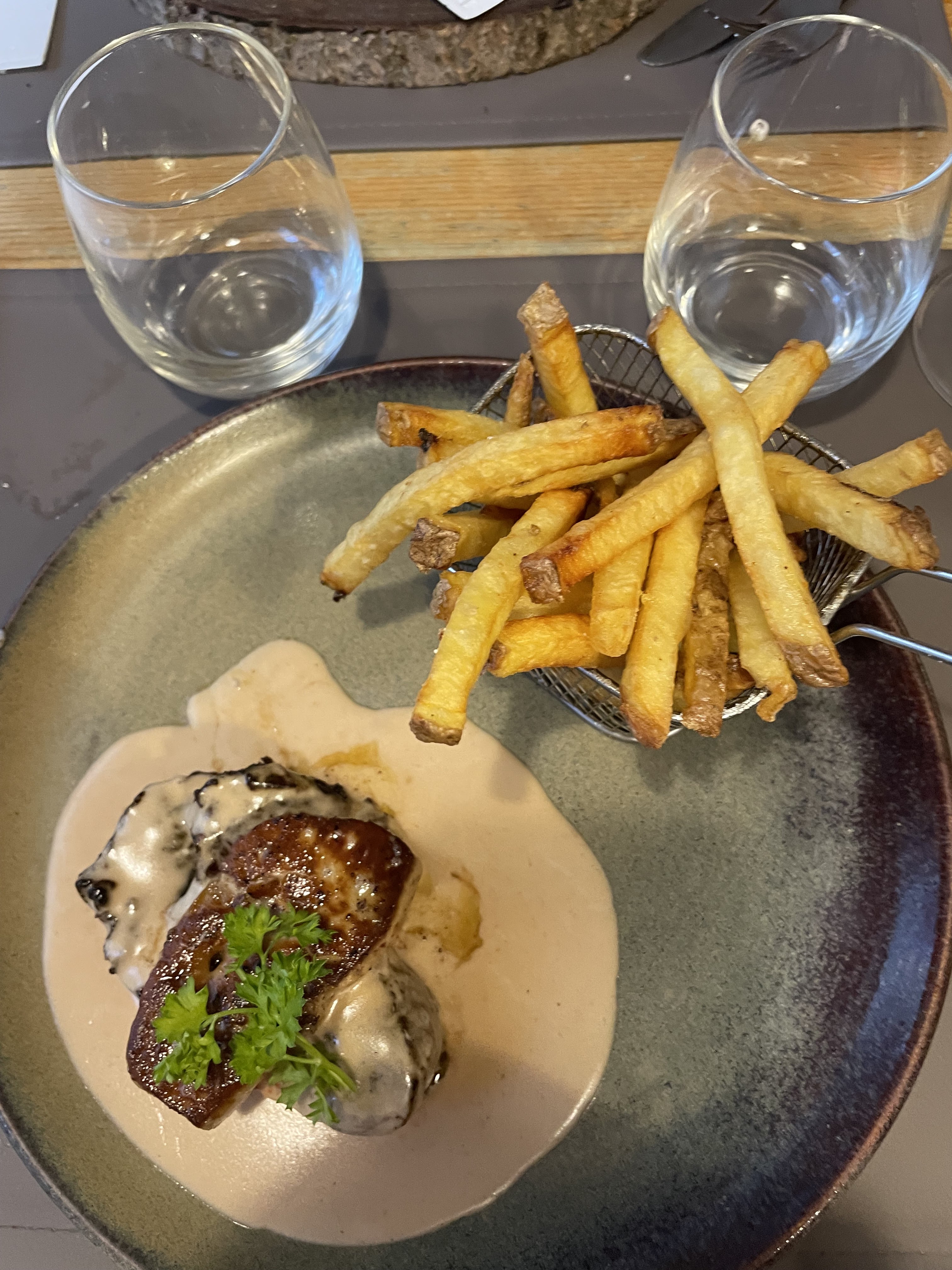Restaurant dont le cadre est beau - le serveur agréable et à l écoute. Les repas ont été fades-pas de légumes proposés ou mis pour rendre l assiette plus delicieuse - frites surgelées trop cuites et servies dans un panier telles que dans les brasseries. Franchement déçus.....