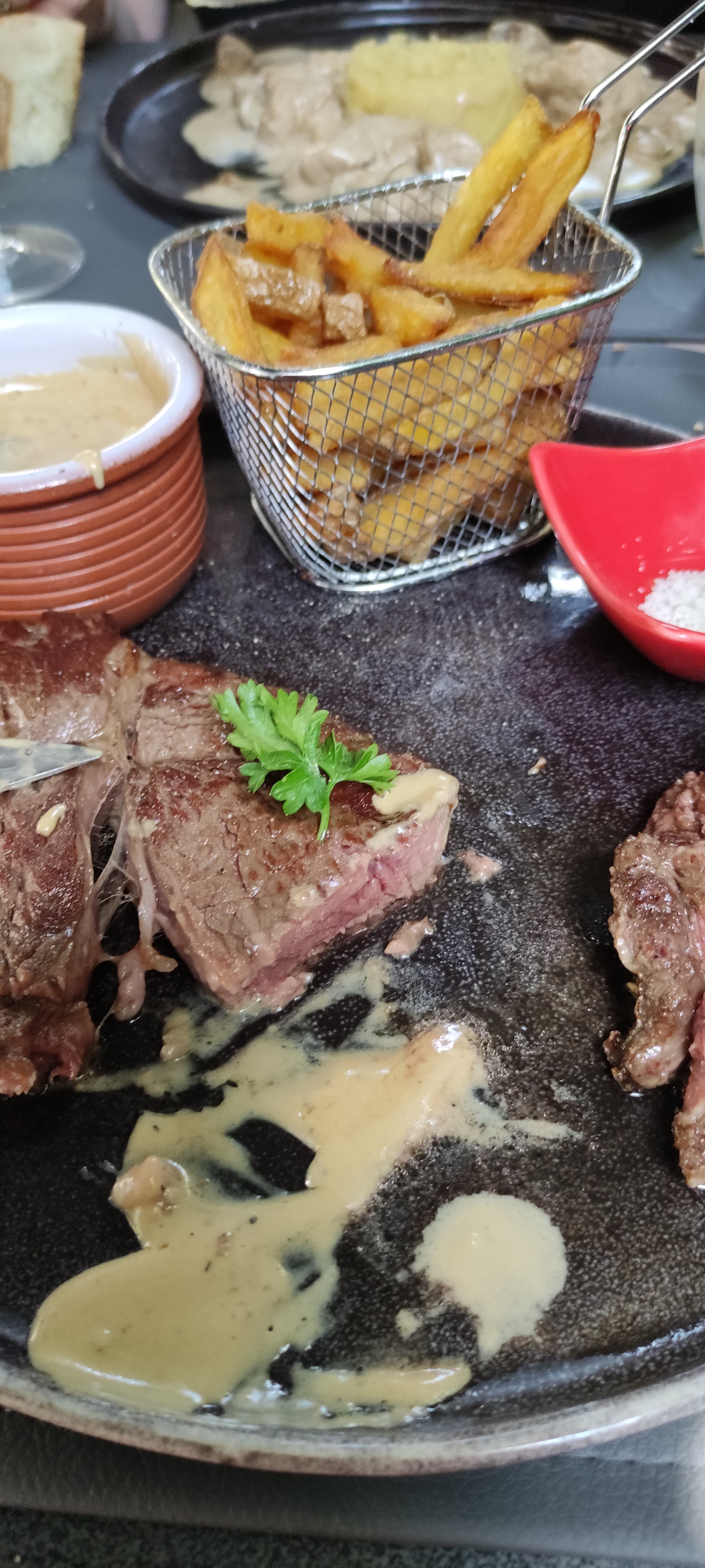 Ambiance niveau musique agréable a l arrivée, après entrée saumon pour moi il manquait un petit morceau beurre en accompagnement, saumon pas terrible..après les frites aspect noir, steak bleu. Sauce au poivre a désirer plutôt pâle et sans goût..dommage..dessert j'ai aimé quoique boule de glace très gelée .