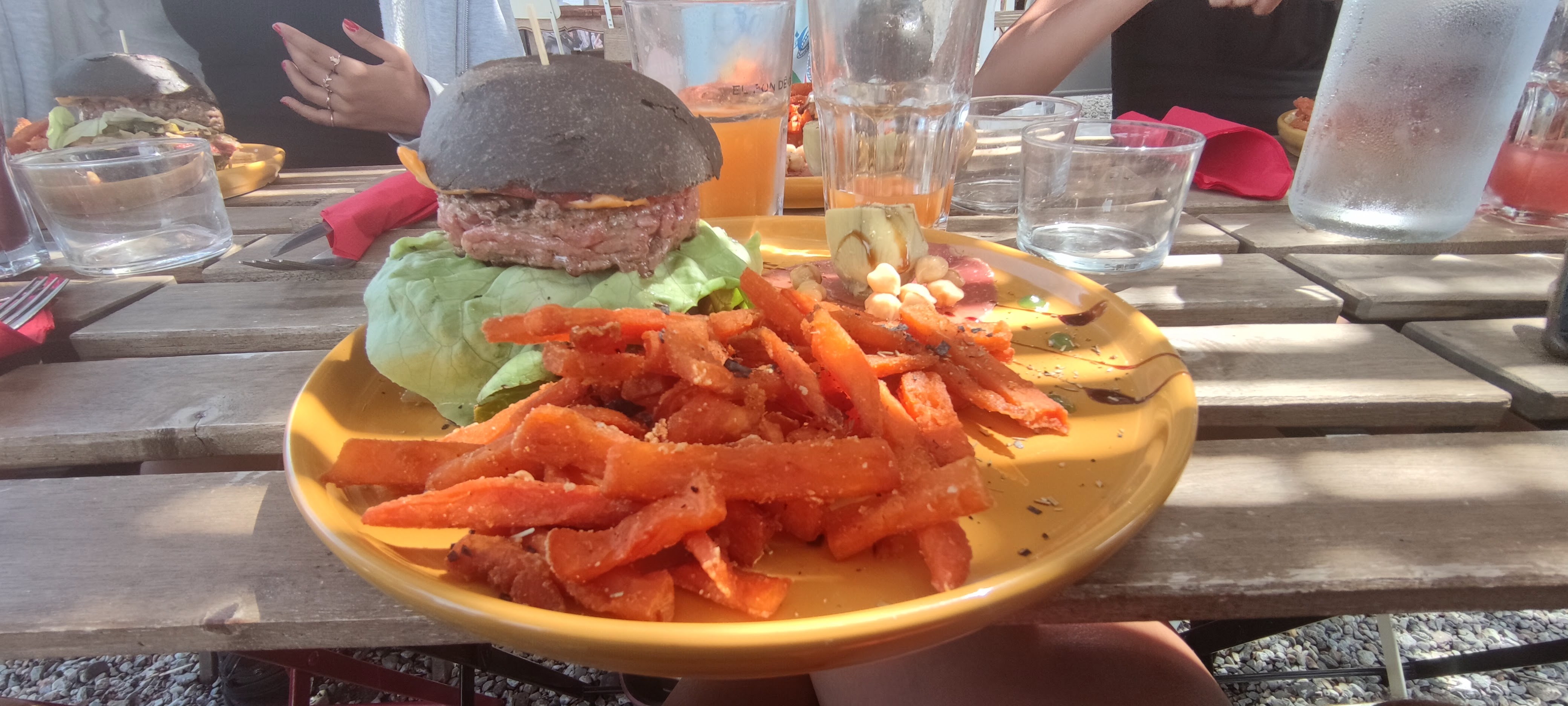 Le lieu est des plus original, le personnel très sympa, mais je vois dans les autres avis carte super, alors que nous n'avons pas eu de choix et nous nous sommes retrouvés avec une addition salée pour un hamburger et des frites aux patates douces à 18 euros par personne y compris pour les enfants de six et sept ans... En entrée il n'y avait qu'un petit bol de gaspacho à la tomate à 8 euros , ce qui fait un total de 26 euros par personne sans dessert... Bref on se souviendra du lieu mais surtout pas de ce que l'on y a mangé !