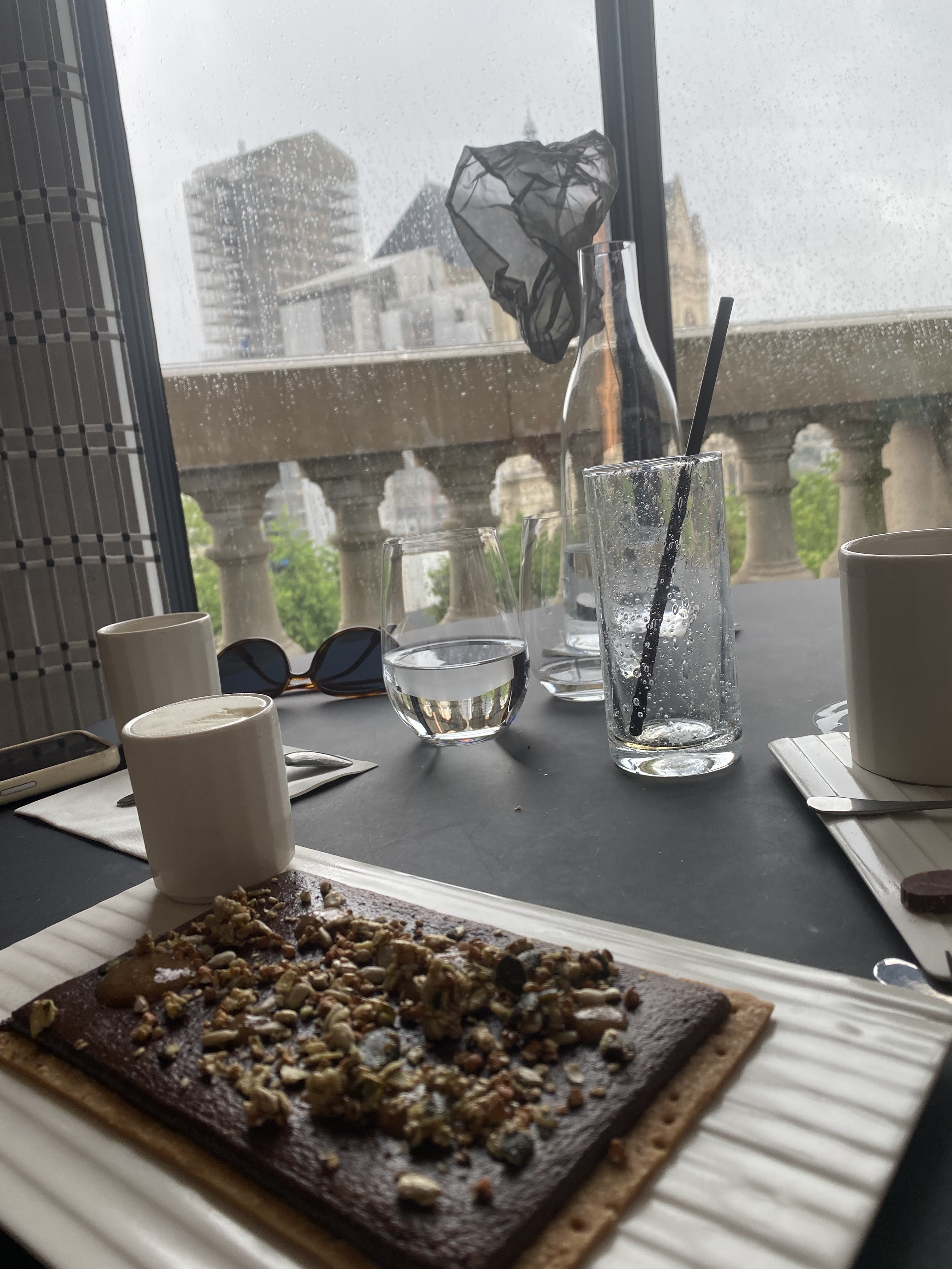 Le cadre est incroyable, on voit l’intérieur de la bourse du commerce d’un côté, et de l’autre une vue surélevée de Paris. Le service est impeccable, les serveurs sont à l’écoute et essaye de nous arranger au mieux. En ce qui concerne la nourriture, je suis très mitigée. Le sandwich au butternut était fade, alors que la petite sauce à côté était délicieuse, elle aurait du être ajoutée dans le sandwich. Quand aux desserts, ils étaient tous très bons, mais peut être que la portion est un peu trop grosse. Aussi, je n’ai pas trop aimé le cracker utilisé pour la tarte.
