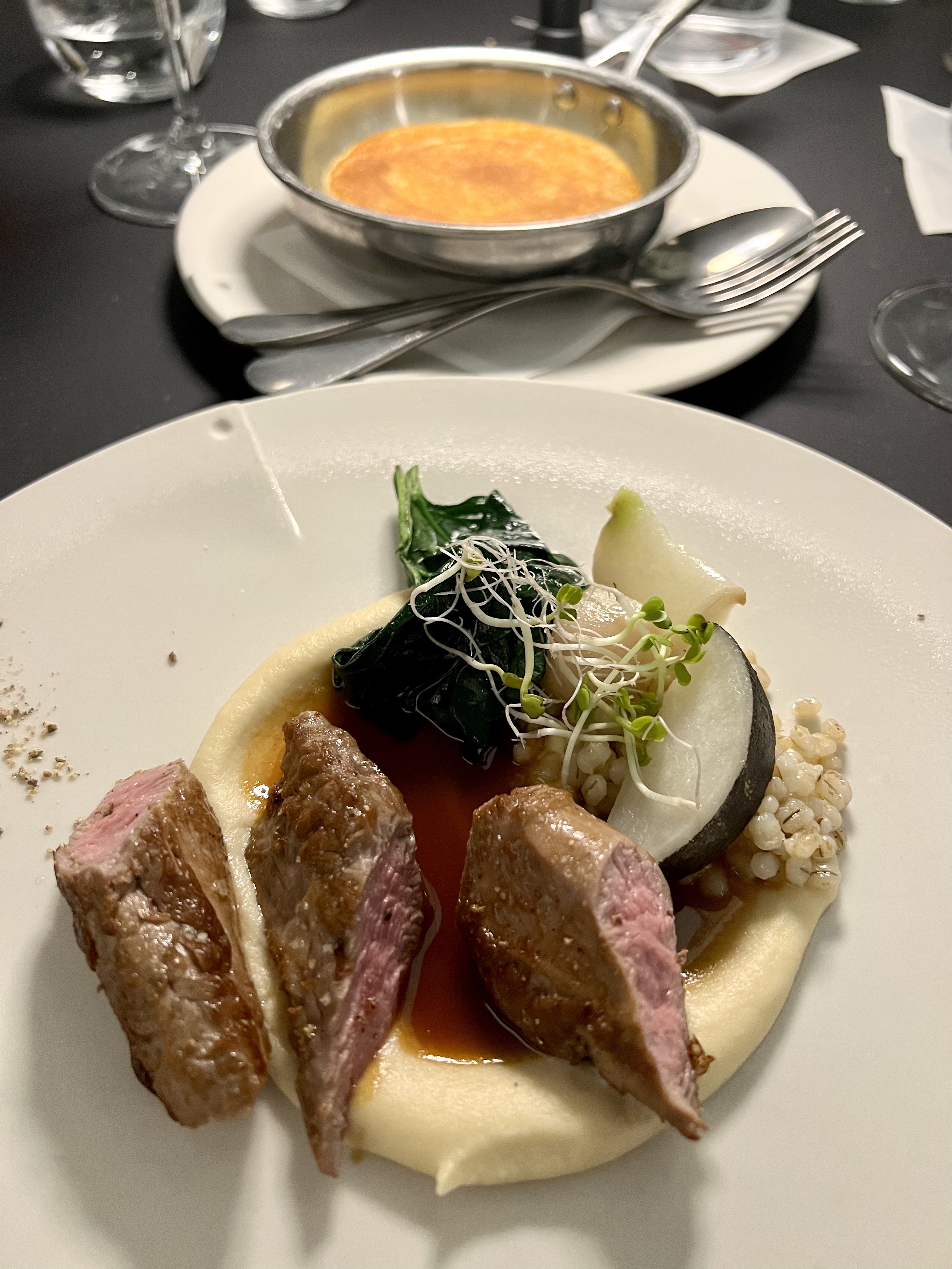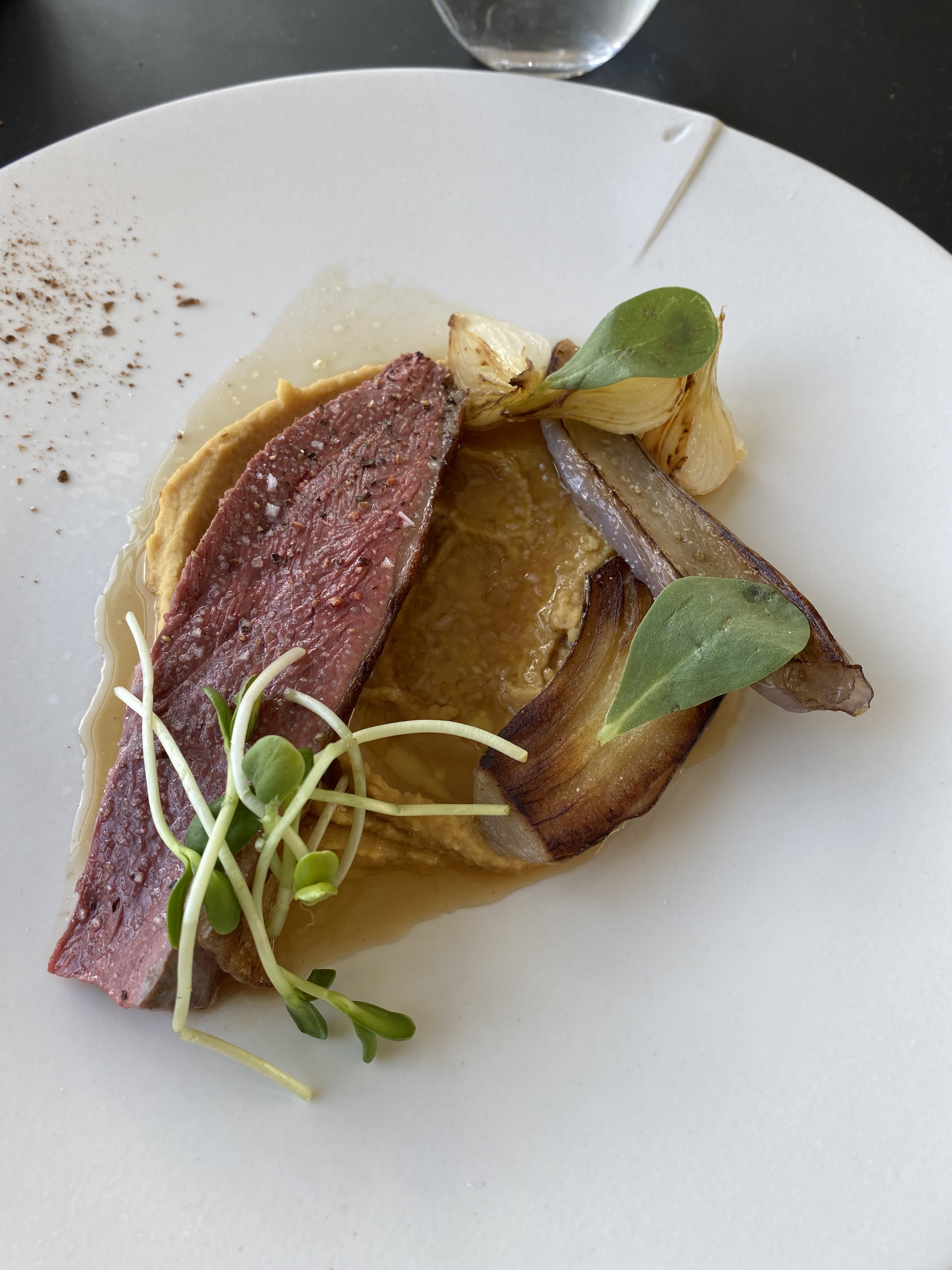 Excellent menu dégustation aux saveurs originales. Les portions étaient satisfaisantes et le service très agréable. La vue est superbe et l'endroit vraiment beau. Un peu cher mais ça vaut le coup. Dommage de ne pas avoir pu remplacer le fromage cru par une option pasteurisé ou bien par un autre plat salé mais le dessert proposé en remplacement était incroyable donc c'est tout pardonné 😉