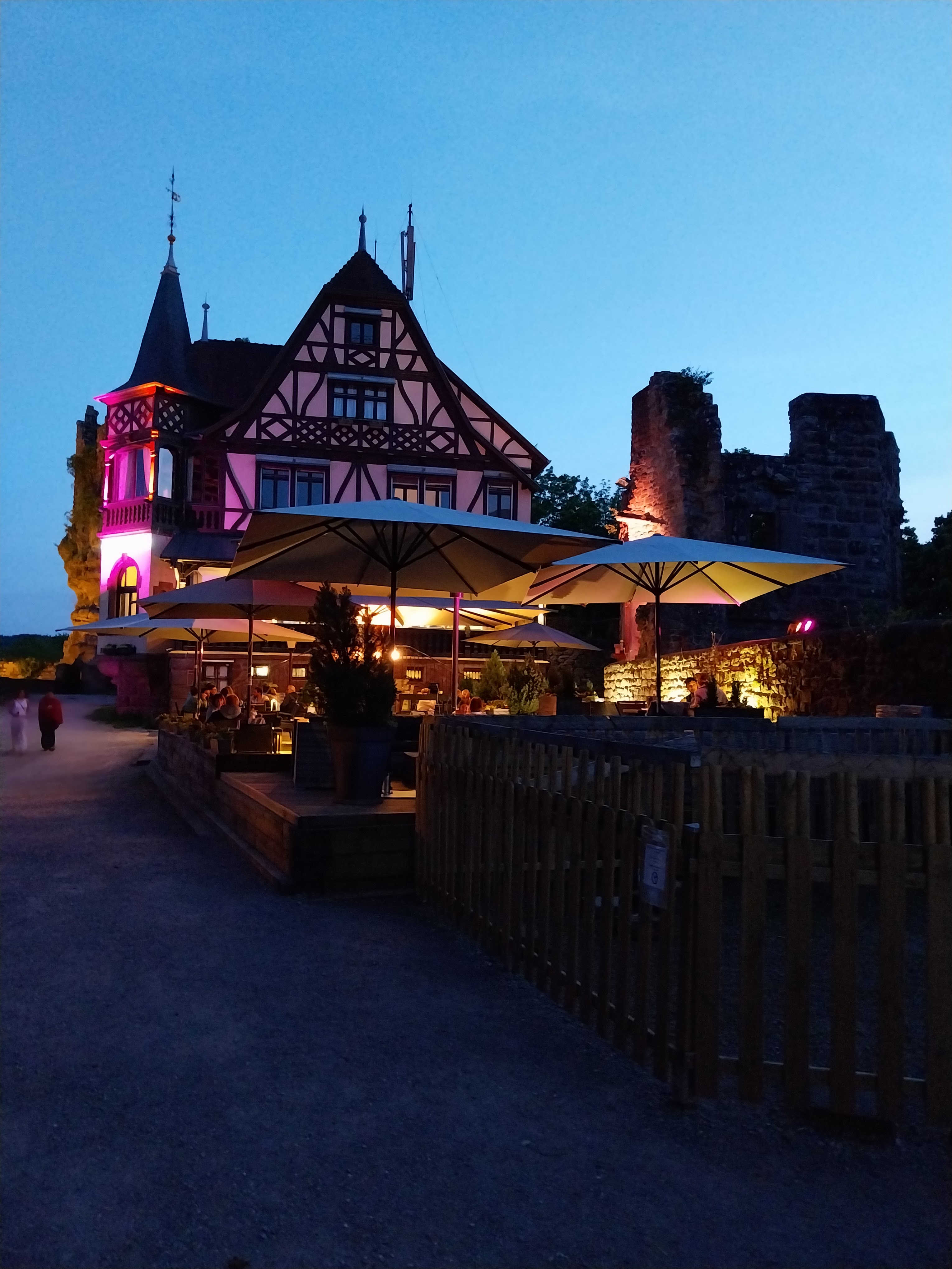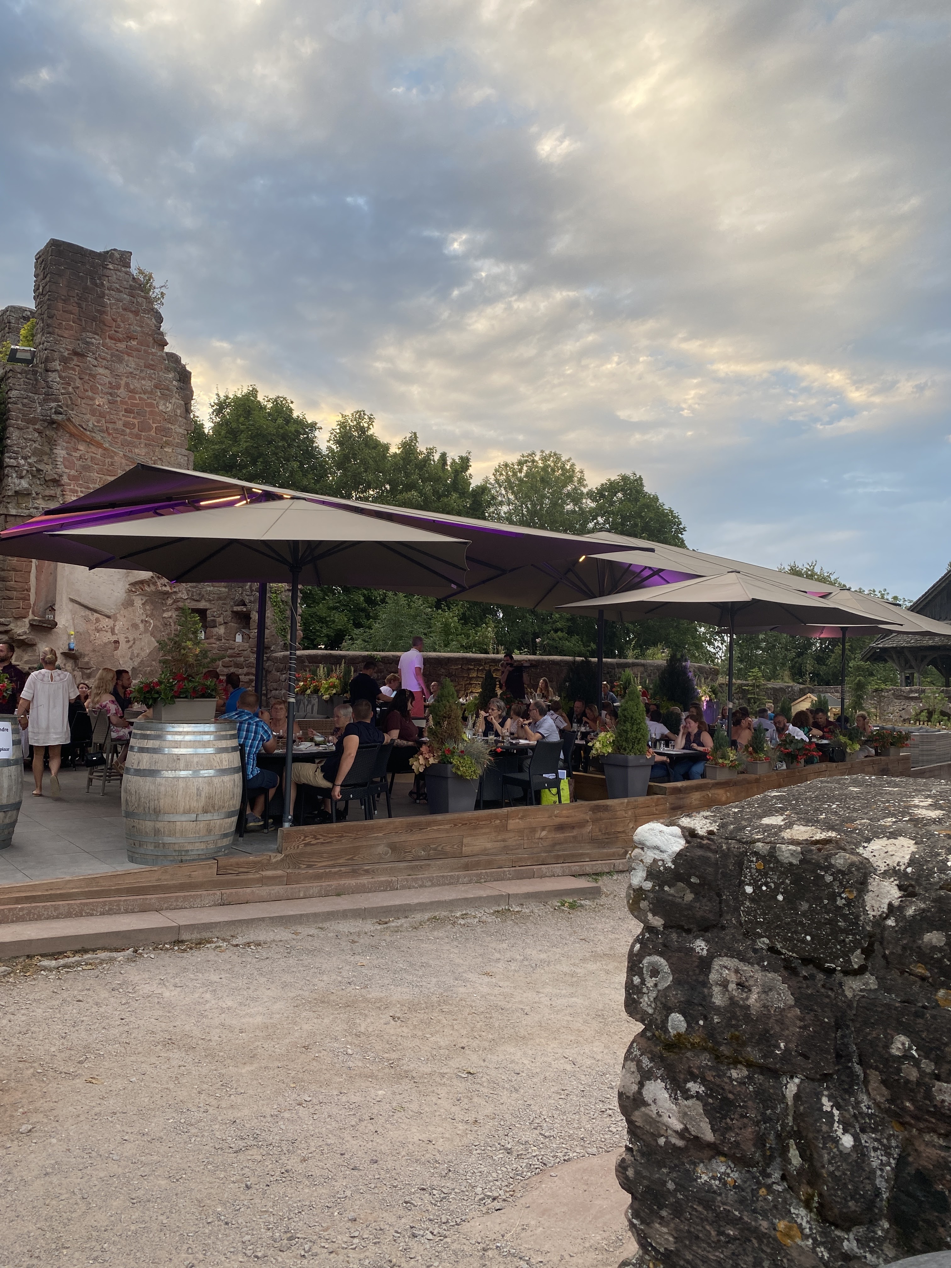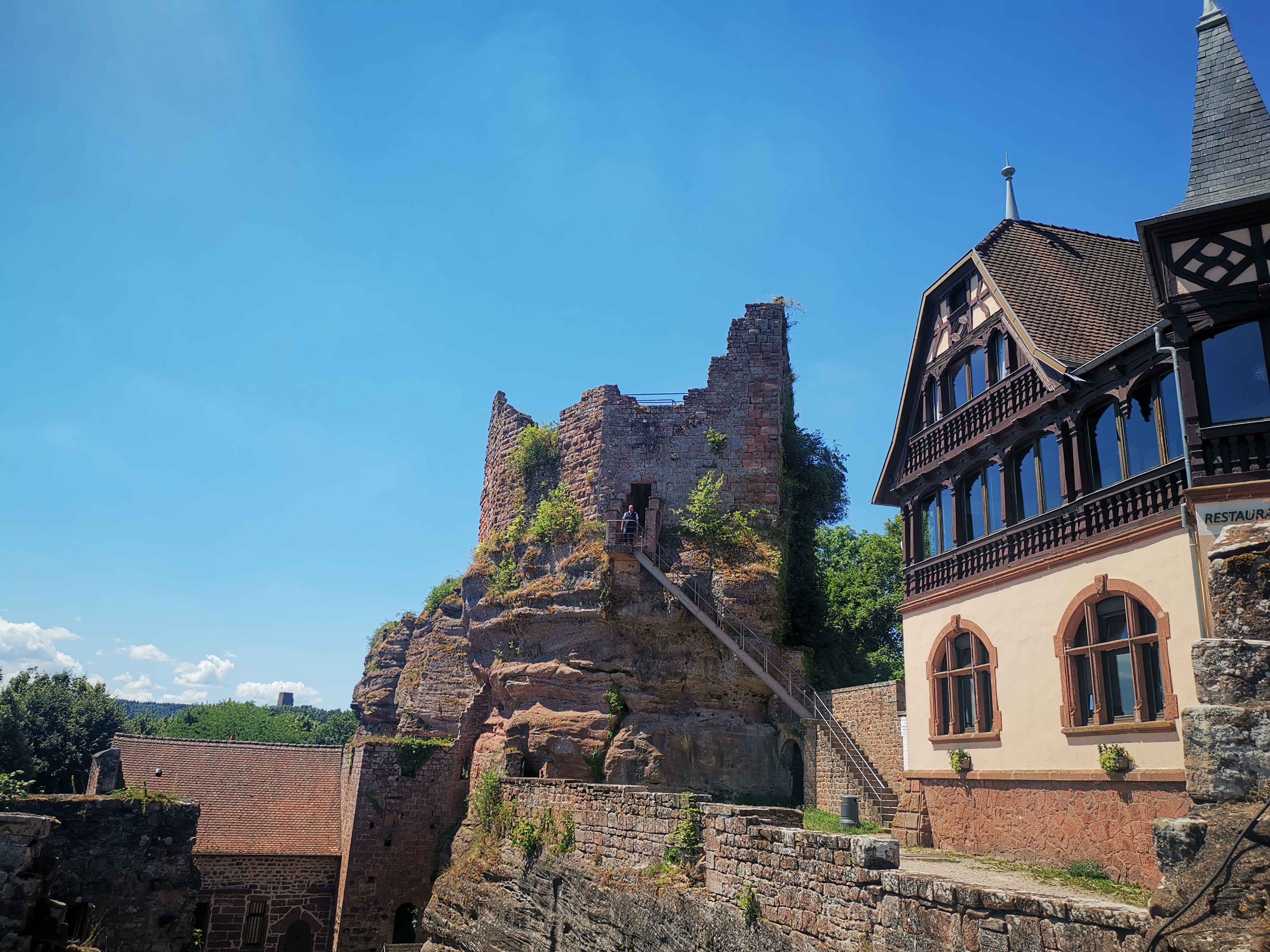 Superbe Cadre perché tout là haut dans les ruines du château, balade et vue imprenable. Service efficace et rapide. Personnel attentif et très efficace. Réservation recommandée si en groupe. Choix de spécialités, tarte flambée délicieuse...très belle découverte. Y revenir c'est sûr.