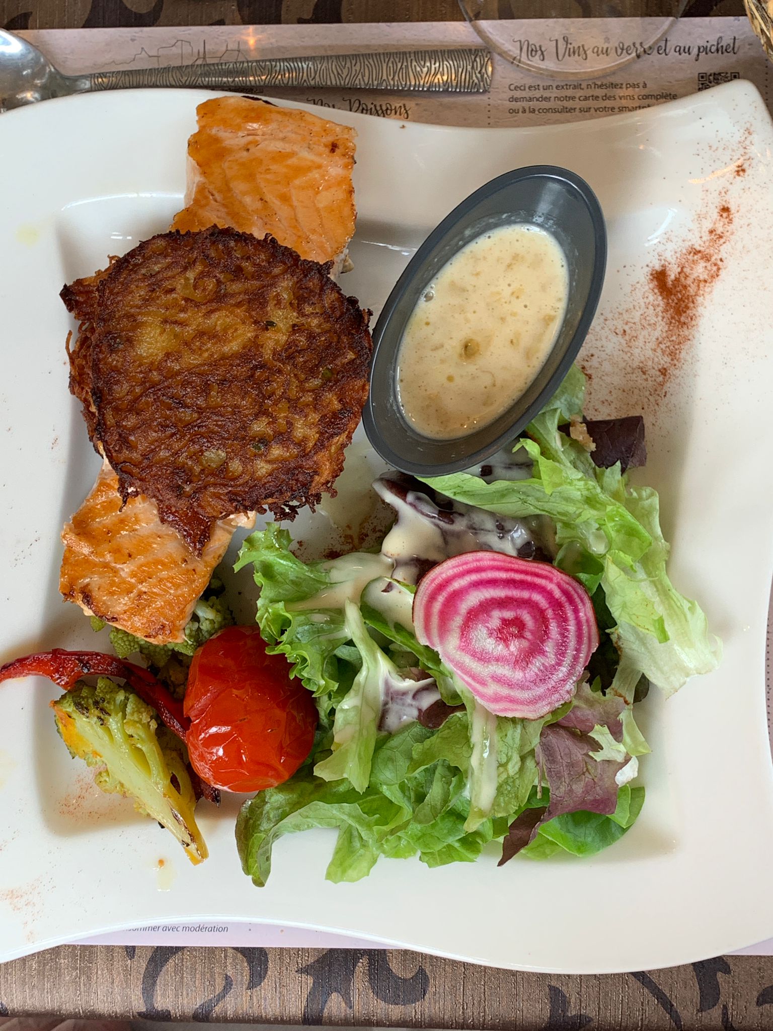 Menu correct ,portion généreuse ,service un peu peu trop rapide , beau cadre , bien dans l.ensemble