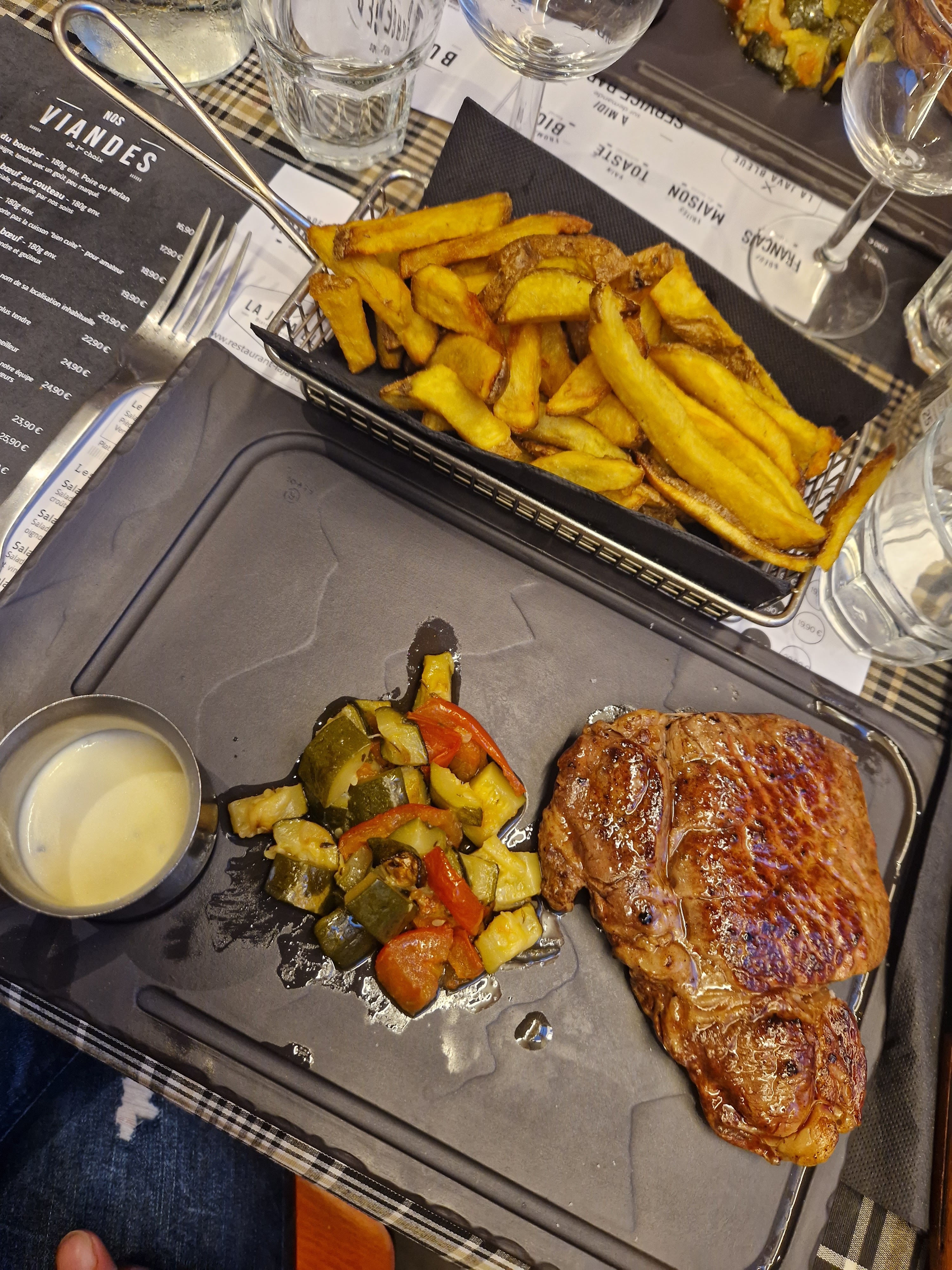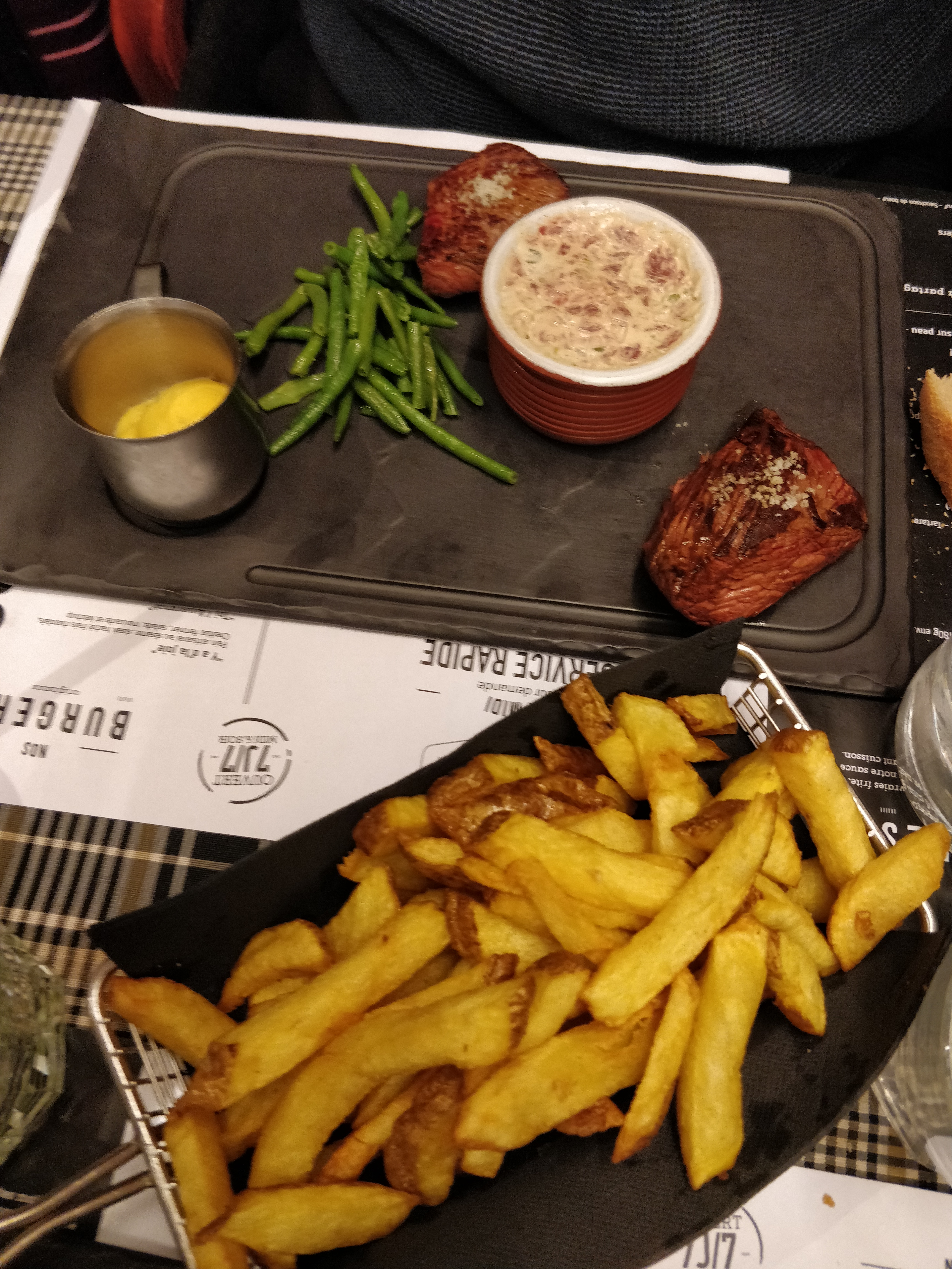 Nous avons dégusté la planche de charcuterie à partager qui était un vrai régal ! En repas côte de bœuf de 500g qui était succulente, la viande était très tendre, les sauces sont elles aussi très bonnes (manque juste en quantité sinon parfait) Les frites sont à volontés et également très bonnes. Le service était top je recommande vraiment !