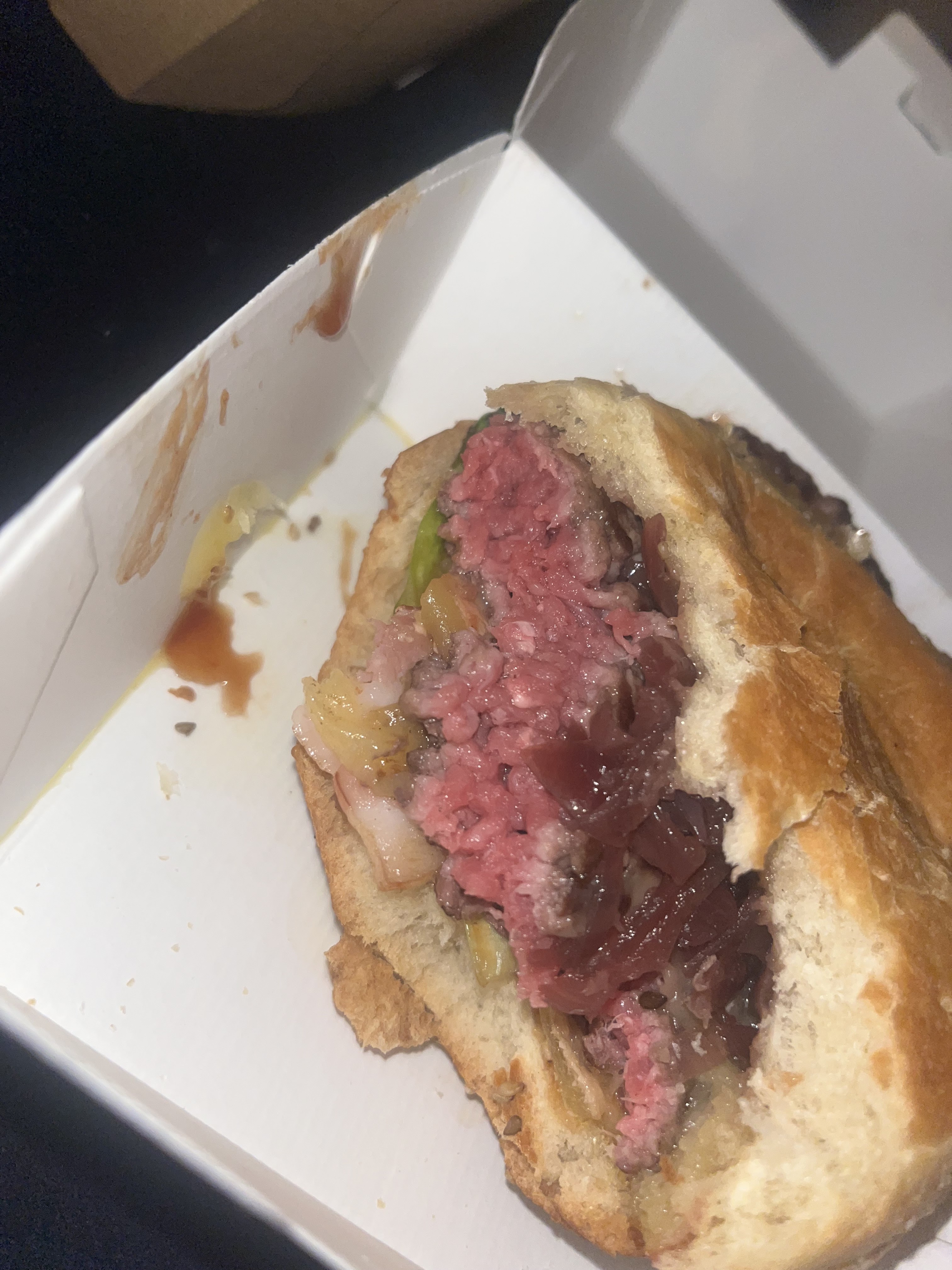 Commande passée sur Uber. Les frites et la sauce sont excellentes, par contre, demande de cuisson « à point » pour la viande du burger absolument pas respectée, comme vous pouvez le voir sur la photo, alors que je l’ai moi même repassée à la poêle à la réception..