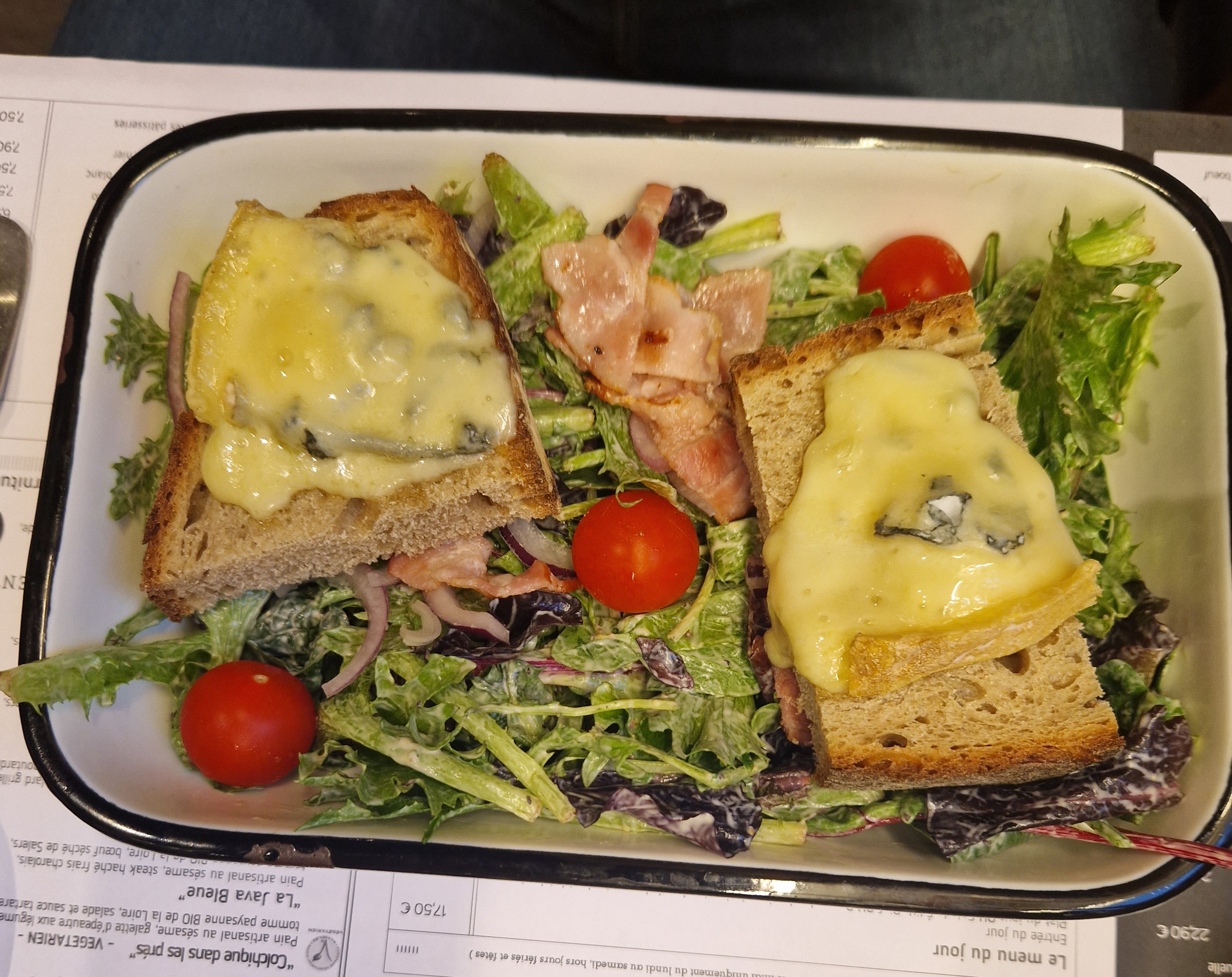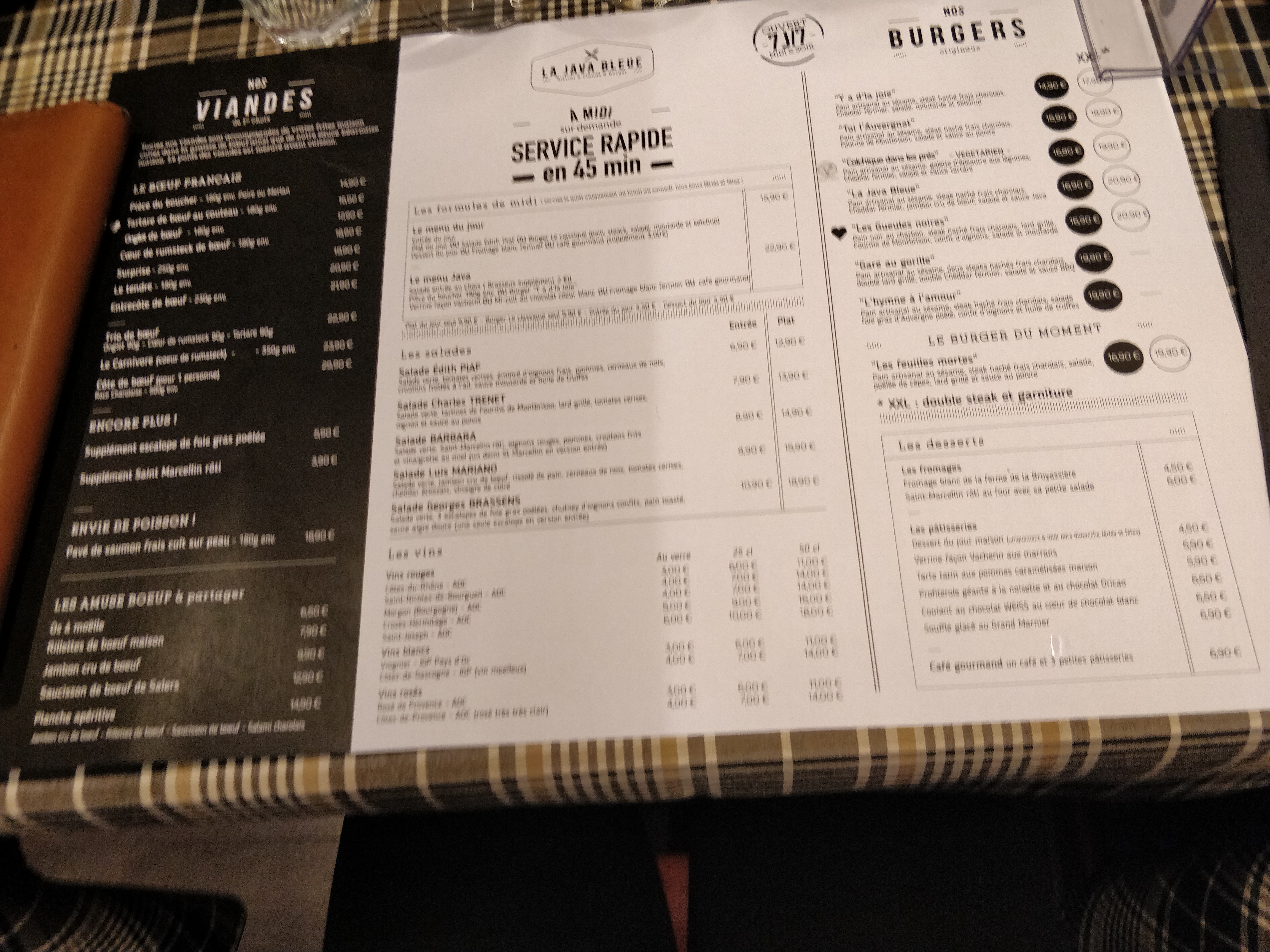 Nous avons testé la Java bleue suite à notre fréquentation très fidèle à l’autre restaurant « Madame »appartenant aux mêmes propriétaires . C’est donc grâce à une des serveuses du resto Madame que nous sommes allés tester la Java bleue et leur concept reposant sur le fait d’être ouvert toute la journée et 7/7 jours même le dimanche. Concernant la cuisine cela est très différent mais convivial du resto Madame car c’est du bistronomique avec principalement des burgers mais il y a d’autres choix pour les viandards. Prix un peu élevé pour un burger surtout si vous prenez en plus un dessert (~7€50), et une boisson mais il faut reconnaître que la qualité des produits tous locaux et très bons est au rendez-vous en plus vous pouvez redemander des frites maisons à volonté. Le cadre est sympa on a l’impression d’être à Paris au temps de Jacques Brel, Edith Piaf… Ne pas oubliez les serveurs très sympas et avenants.