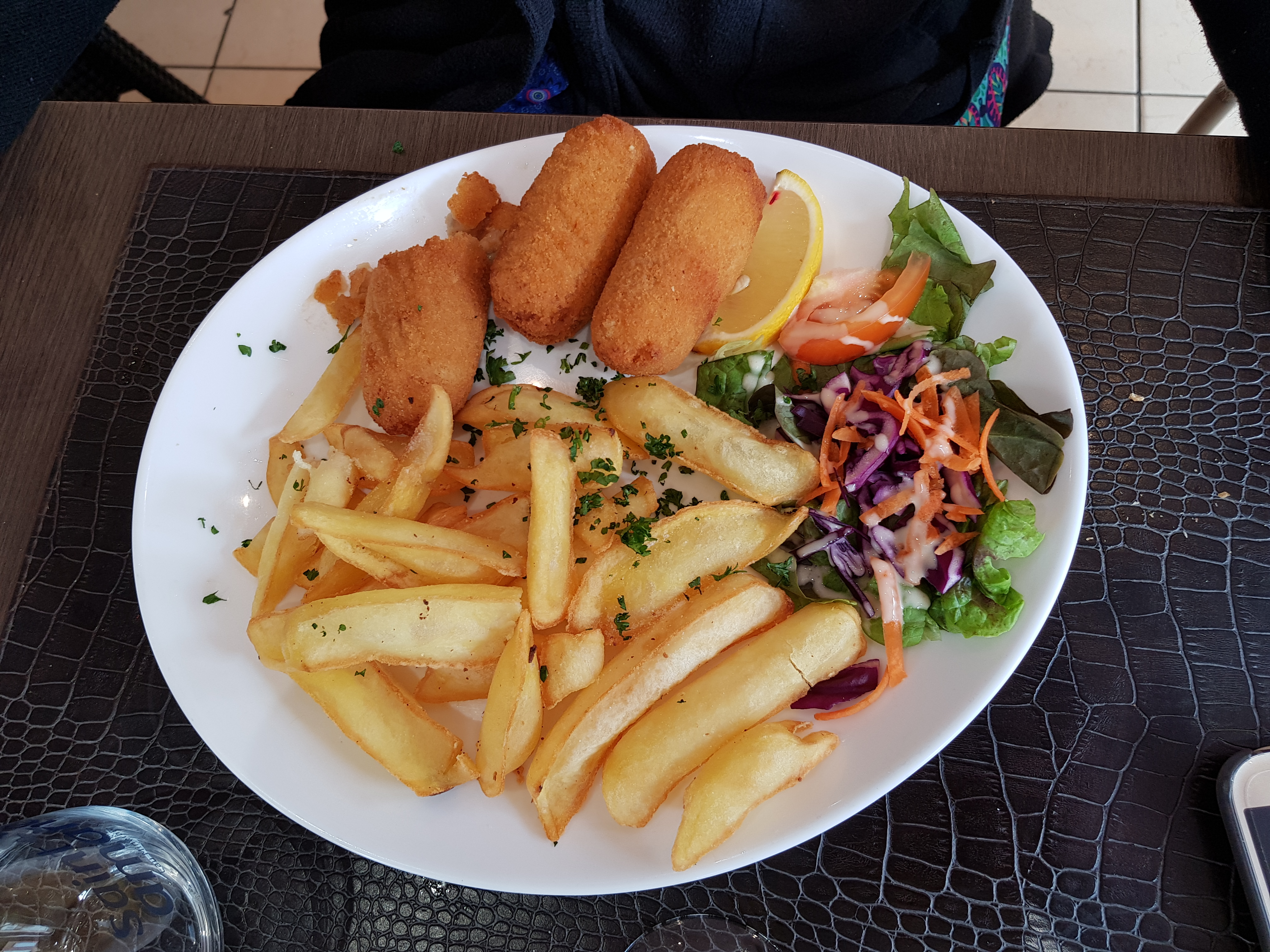 Arrêté ici sur le chemin de Louvain en Belgique. Bon poulet et frites avec salade. Le personnel était vraiment serviable et a pardonné mes mauvaises tentatives de français.