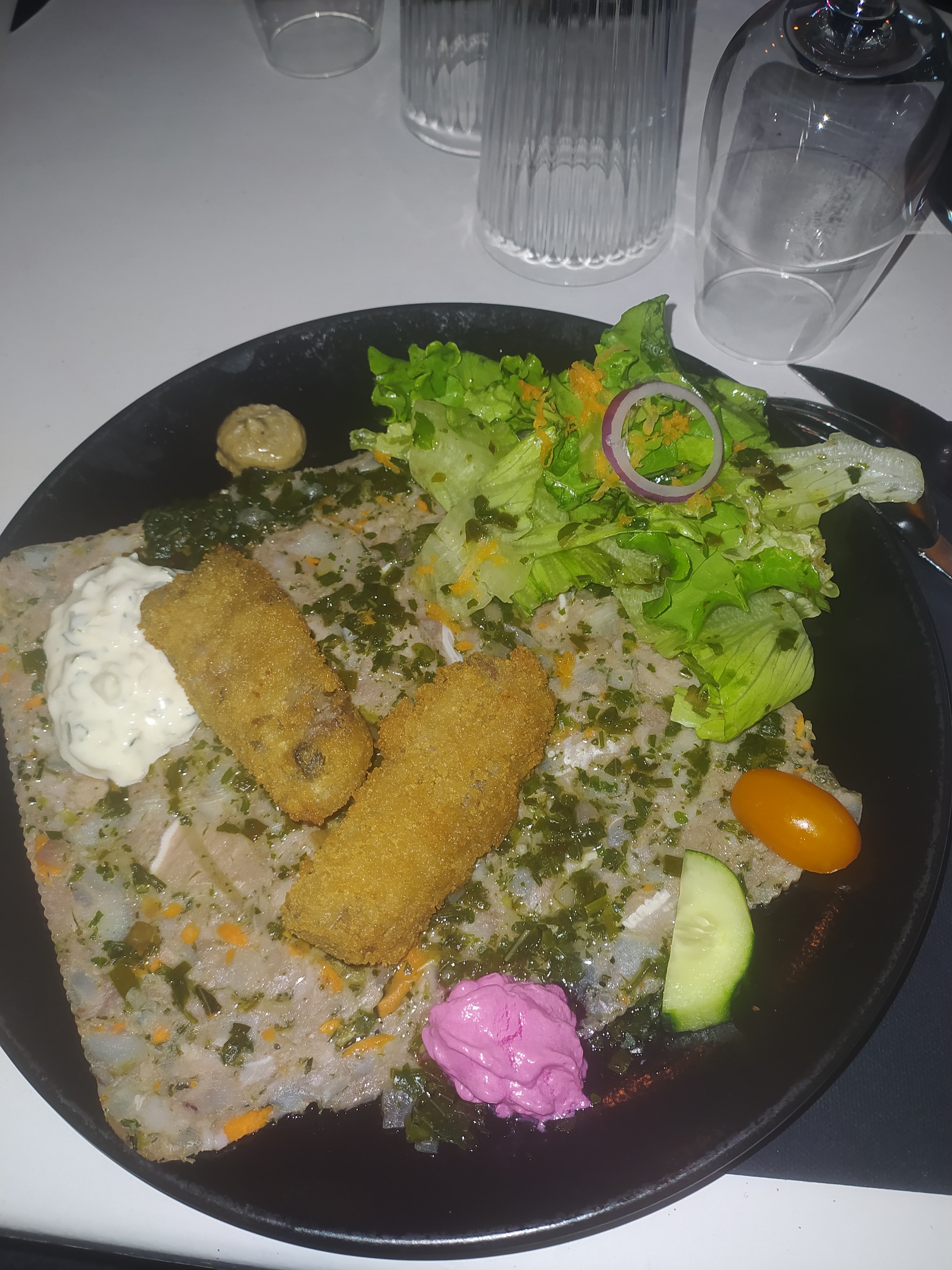 Beau décor personnel froid repas moyen avec une viande immangeable bref très déçu appartement on est juste de passage on ne les intéresse pas