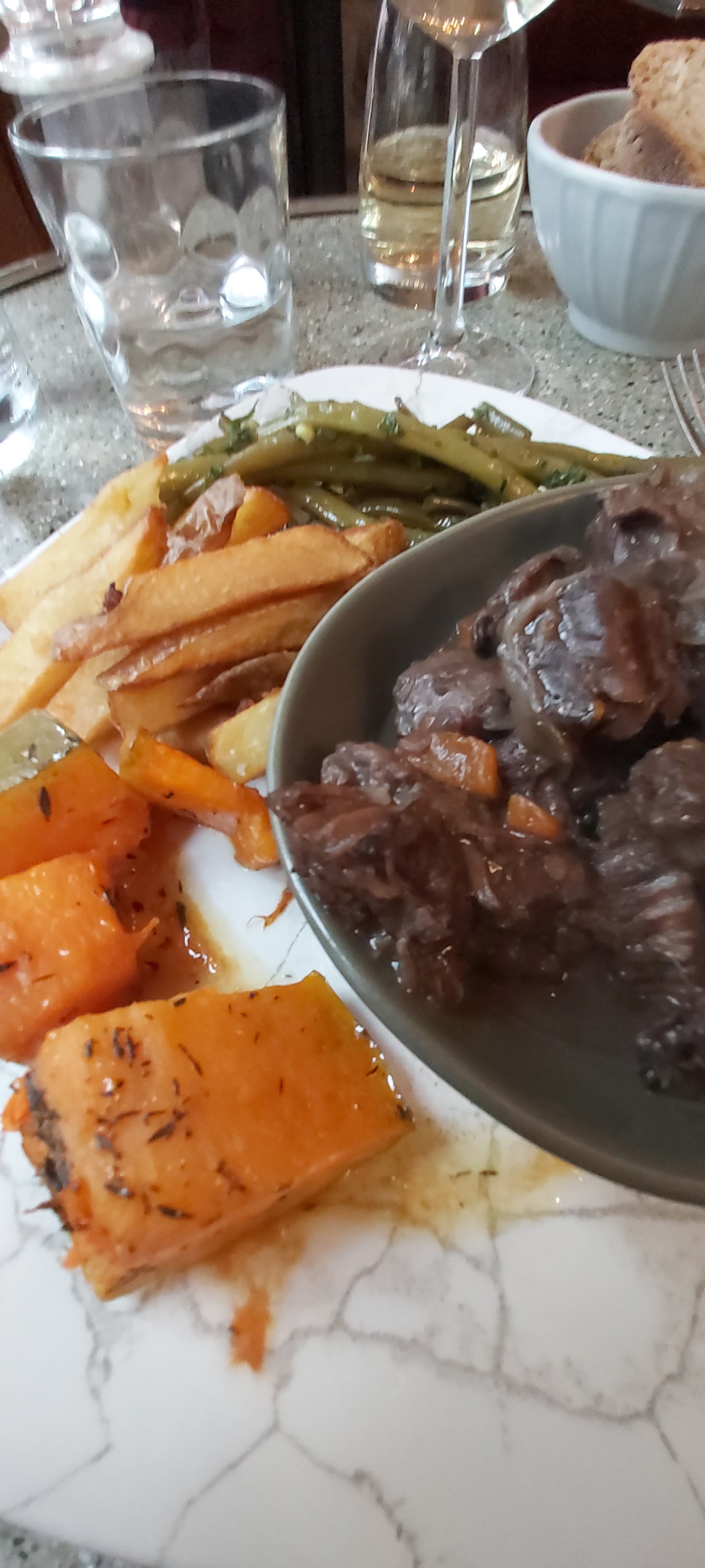 Très bonne soirée, menu délicieux (carpaccio, escargot, daube, encorne,...). On a failli être déçu par le café gourmand mais en l'indiquant à la serveuse que n'avions pas été entièrement satisfait, elle a été chercher un autre dessert à emporter pour nous. Geste très appreciable. Allez y, le client est vraiment considéré...