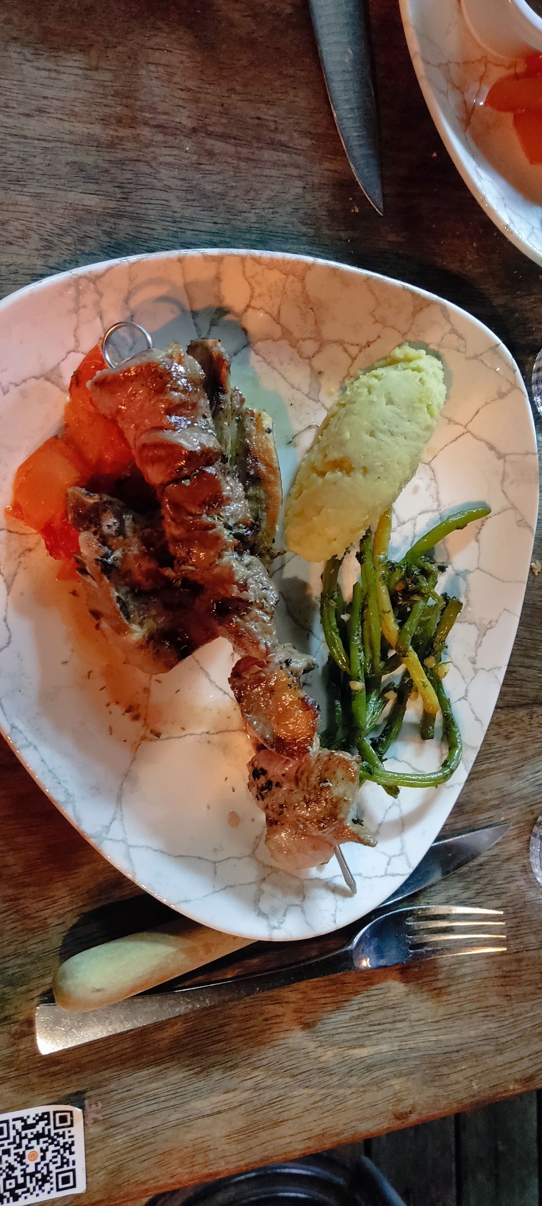 Menu sur tablette ou alors il faut télécharger le QR code, terrasse extérieure trop sombre mais mignonne, repas convenable mais seulement 2 côtes de mouton dans l'assiette ....une 3eme aurait été la bienvenue. Bon service, petits légumes bien appréciés, cadre intérieur très joli.