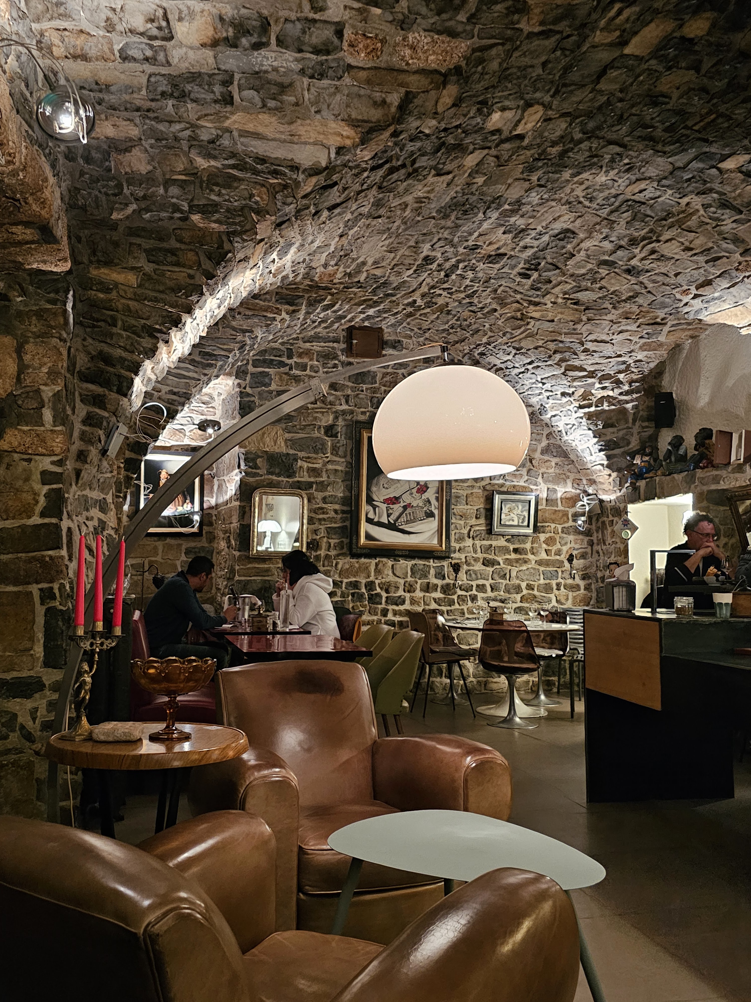 Repas en famille, accueil correct ni plus ni moins. Restaurant plus sombre que intimiste. Décoration particulière mais ça chacun ses goûts. A mon sens trop de tableaux et miroirs partout (on se voit en train de manger !?...) ça gâche la pierre naturelle qui est pourtant magnifique dans ces salles voûtées. Les tableaux sont a vendre, on confond resto et galerie au dépend de l ambiance et la beauté de ce restaurant. Le passage est trop encombré avec des consoles, des meubles de présentation, des vitrines etc... Compliqué de circuler. Niveau service, de la bonne volonté mais pas vraiment de sourire c est dommage. Pour la cuisine, c est plutôt pas mal au niveau des plats avec une viande tendre et une sauce roquefort vraiment très bonne et maison a ne pas douter. Mais nous sommes allés prendre les desserts ailleurs car la carte n était pas fameuse pour les gourmands que nous sommes. Pas une mauvaise expérience mais je ne pense pas que nous y retournerons connaissant la concurrence sympa qu il y a dans le coin
