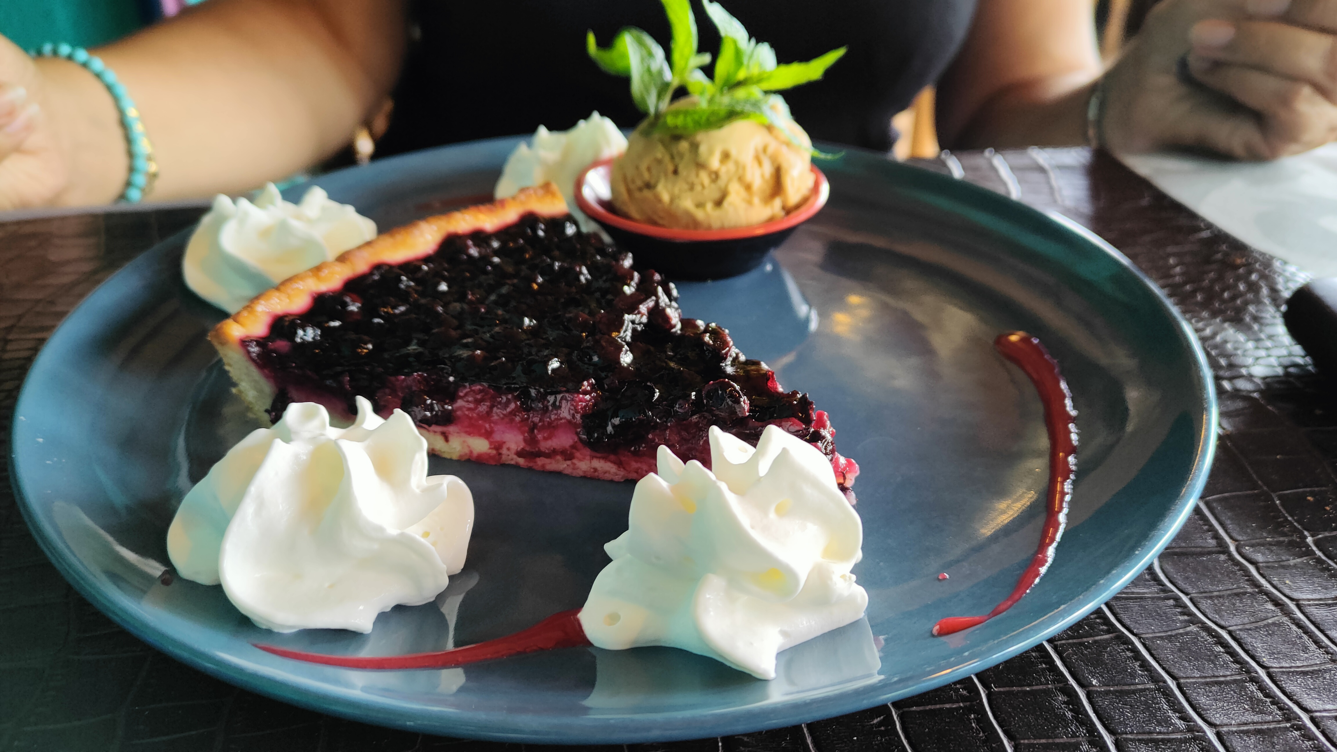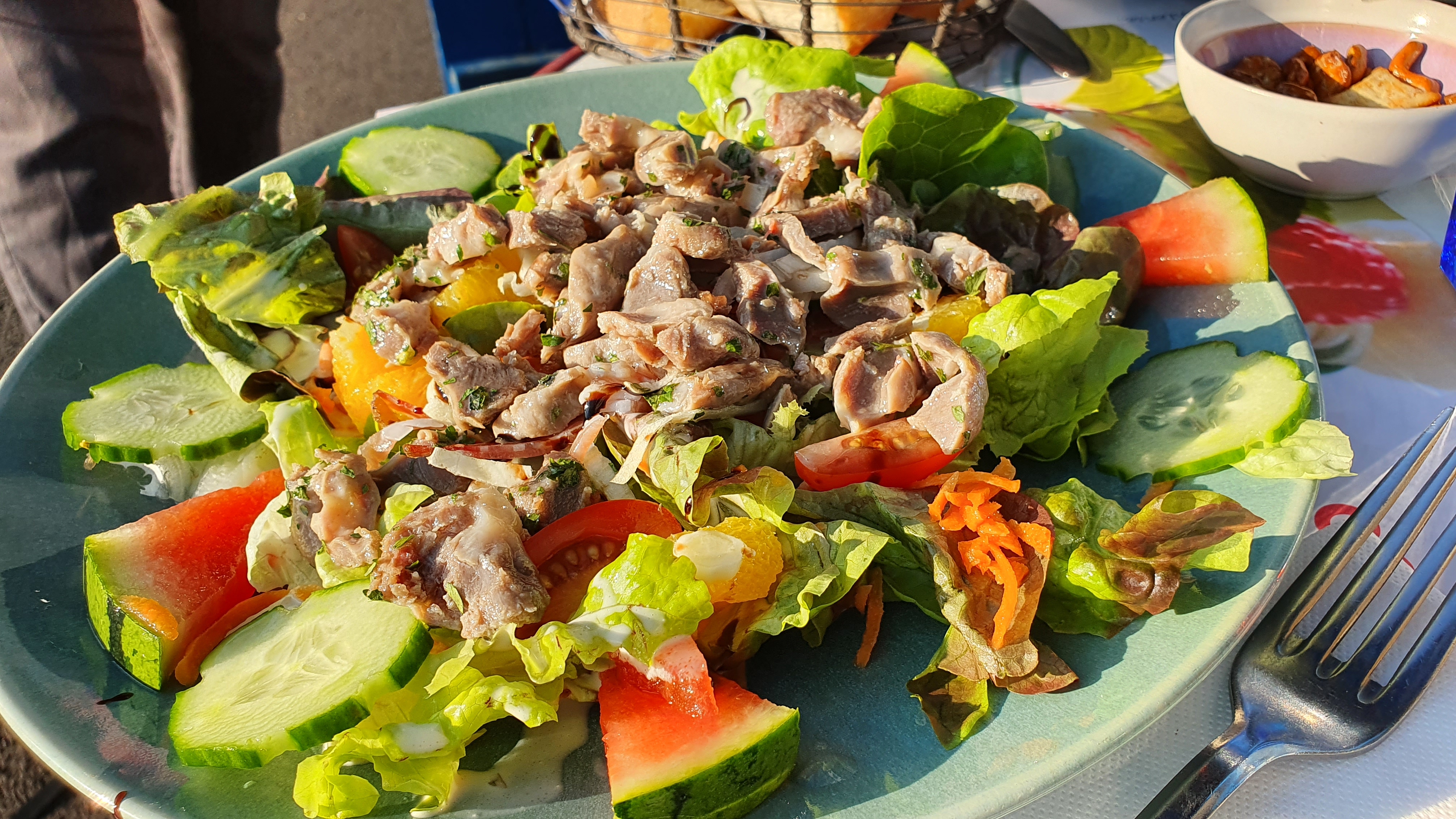Un repas au bord de l’eau… pour notre arrêt moto, c’était super. Nous avons tous pris une assiette avec du rosbif froid, salade et frites, et c’était parfait. Pour le dessert, que ce soit les glaces ou la tarte aux myrtilles, il n’y avait rien à redire. L’accueil est super avec une petite serveuse très aimable et sportive 😜. Le patron ne manque pas d’humour également.