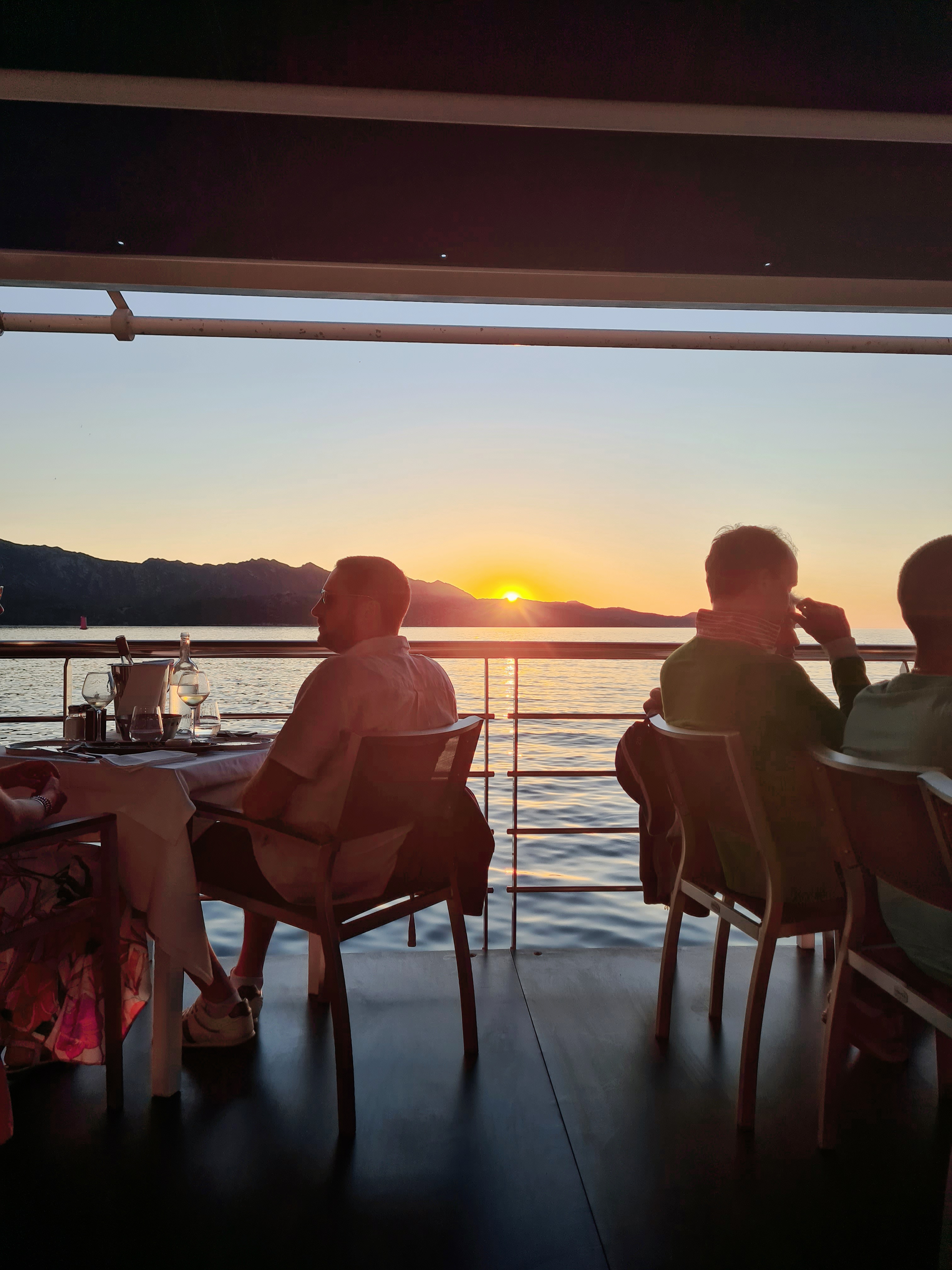En couple, soirée Fin Avril 2018 lors d'un voyage en Corse. Tout deux satisfait. Le foie gras au figues était tout simplement terrible ! En plats des gambas, très bon également. Le cadre : en soirée tout simplement magnifique, parmi mes meilleurs souvenir. Service : impeccable, une pointe d'humour pour plus de proximité et mettre à l'aise. Le chef : impliqué, communiquait beaucoup avec les serveurs pour rendre compte de la satisfaction client. Que demander de plus... je vais même mettre une photo de la vue depuis la terrasse !