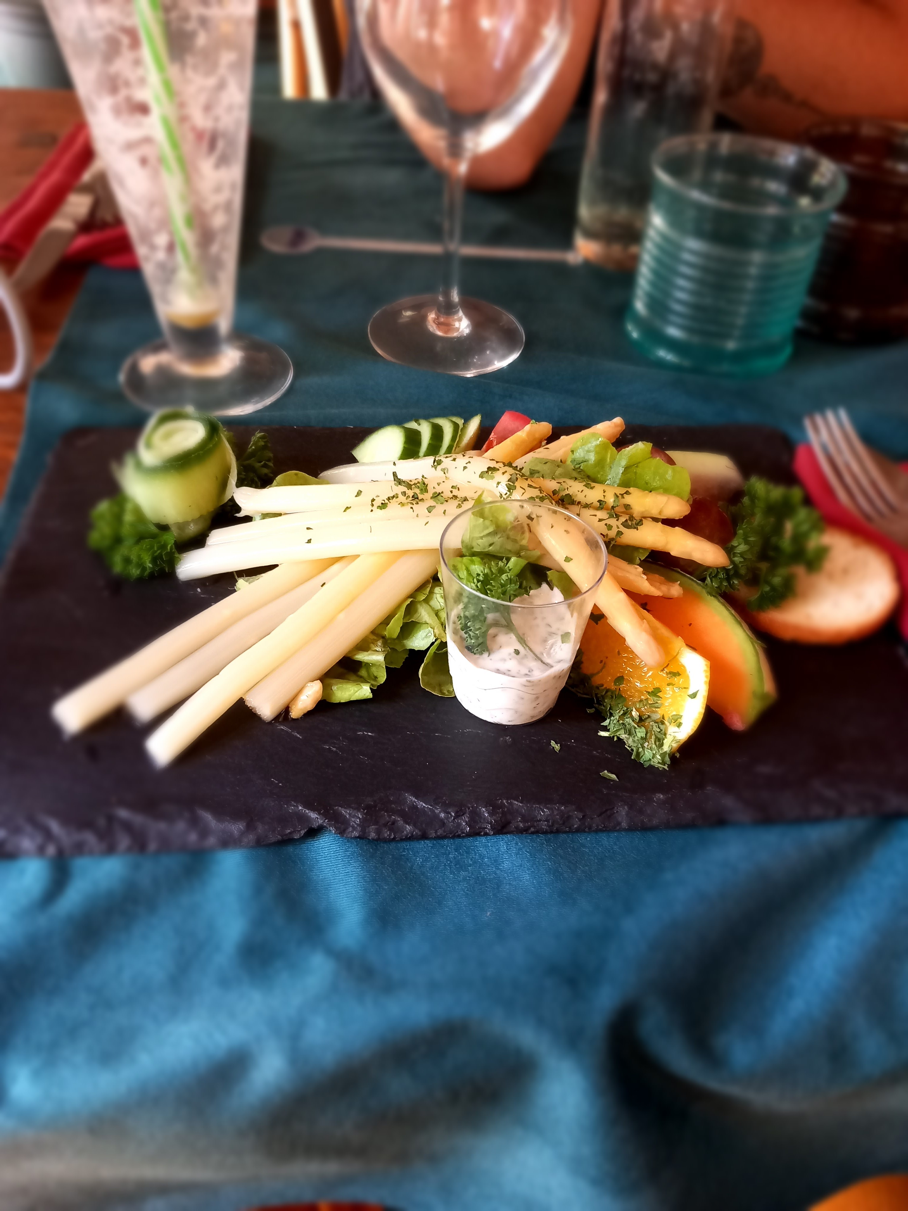 Retour vers le passé : asperges en boîte, persil sur les oranges sur tous les plats, frites surgelées pas cuites, verres avec les traces des bouches précédentes etc. Les toiles d'araignée sur les plantes en plastique cassées en disent long... Points positifs un extérieur pour les enfants, service cordial