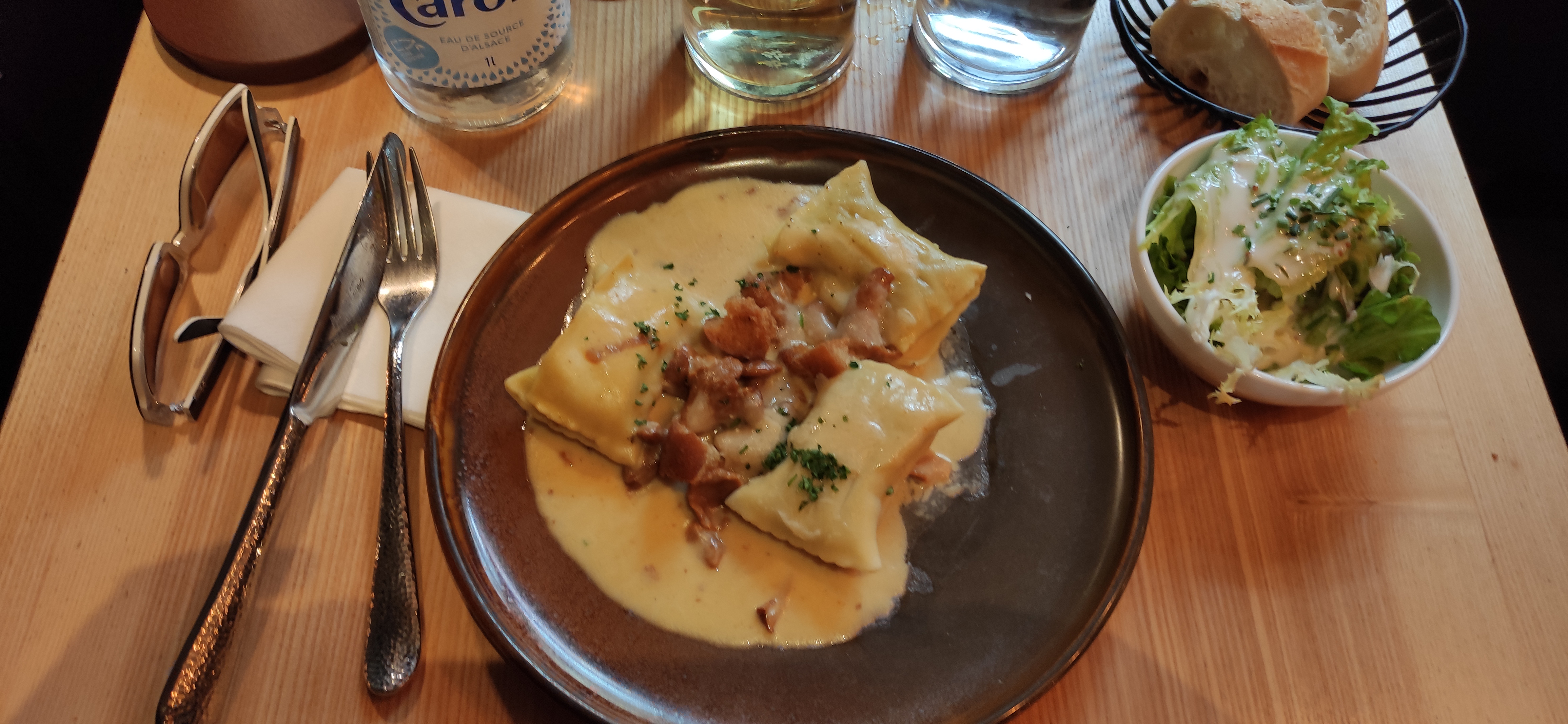 On nous a trouvé un endroit pour manger alors que nous n’avions pas réservé, salade de chèvre et carpaccio de bœuf très bons, très bon service, ambiance tranquille alors que le restaurant est plein, et puis déco très sympa , bravo à leurs équipes