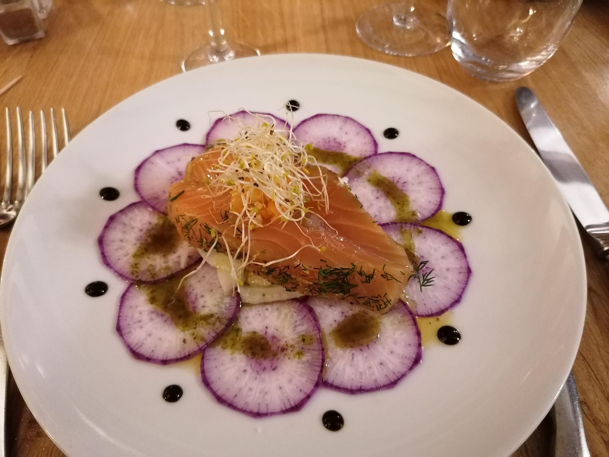 Délicieux saumon, délicieuses pommes de terre sautées-champignons, délicieux gratin framboises-crème citronnée, le tout arrosé d'un très bon vin. Un accueil et un service parfaits ! Merciiii !