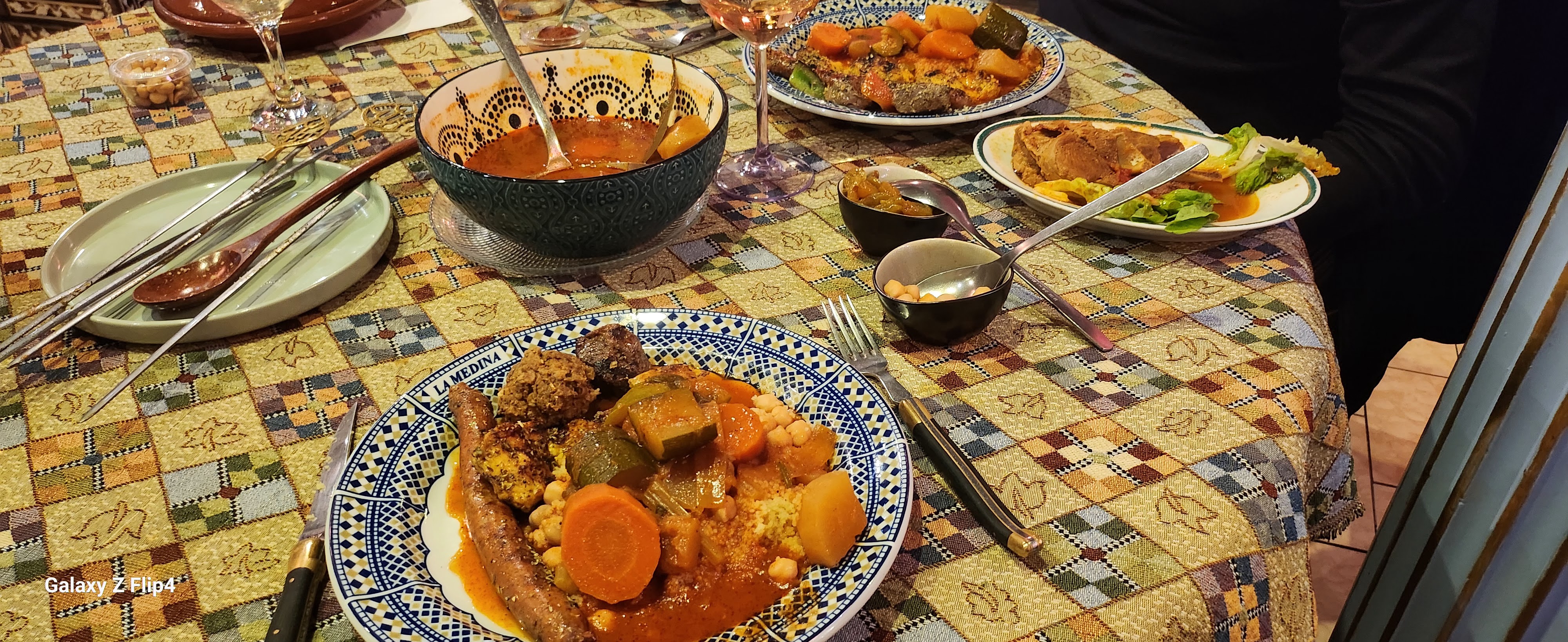 Nous y partageons d'agréables moments et repas depuis 3 générations. Que cela soit en famille, avec des amis, entre collègues ou avec des clients, le résultat est toujours le même, on réfléchit déjà à la prochaine fois, où nous viendrons sentir dès l'entrée, ces bonnes odeurs de la vieille ville de Marrakech ! Que vous veniez seul(e), en couple, en famille ou pour un événement à 20 et même plus, les avis seront toujours les mêmes, c'est délicieux!!! L'accueil et le service, comment dire, le sourire, la gentillesse et la bonne humeur font place au sein de cet établissement. On s'y sent bien, dans une autre atmosphère, tout simplement... Je dirais qu'il est assez rare d'être accueilli de la sorte dans un restaurant. Je vous conseille l'assiette de piment en entrée, mais jamais sans pain :p J'ai eu de nombreuses fois, l'occasion de déguster de très bons couscous, dans les Hauts-de-France ou au Maroc, loin de moi l'idée de critiquer les autres, mais c'est celui-ci que je préfère. Si vous préférez d'autres plats typiques de cette région du monde, il y a de nombreux choix différents qui vous plairont. A l'apéro, whisky, gin, vodka ou bières feront plaisir à tout le monde. Concernant les vins, qu'ils soient blancs, rouges ou rosés, il y en aura pour tous les amoureux de la bonne vigne à prix convenables. J'affectionne particulièrement le gris de gérrouanne en bouteille rosé. Les vins du Maghreb sont très bons et très adaptés aux repas servis. Pour les desserts, personnellement je n'en prends jamais. J'ai le ventre généralement trop plein en fin de repas :) Je vous suggère aussi, le délicieux thé vert en fin de repas, celui-ci vous permettra de mieux digérer vos trop nombreuses assiettes^^ (c'est le serveur Nicolas qui a la meilleure amplitude entre la théière et les verres, à voir de vos propres yeux, c'est un réel spectacle) (Ne pas reproduire chez soi, sauf si vous avez de nombreuses heures d'entrainement :D ) Et les prix dans tout cela? Je pense qu'ils sont justes par rapport à la qualité des produits, de la période actuelle post-covid, au lieu, mais aussi au service proposé. Ces personnes ne vous servent pas, ils vous apportent le bonheur à table et vous mettent dans les meilleures conditions, pour passer un moment convivial. Alors, qu'attendez-vous pour découvrir ou redécouvrir La Médina? Si vous avez encore des doutes, foncez-y, vous ne le regretterez pas !