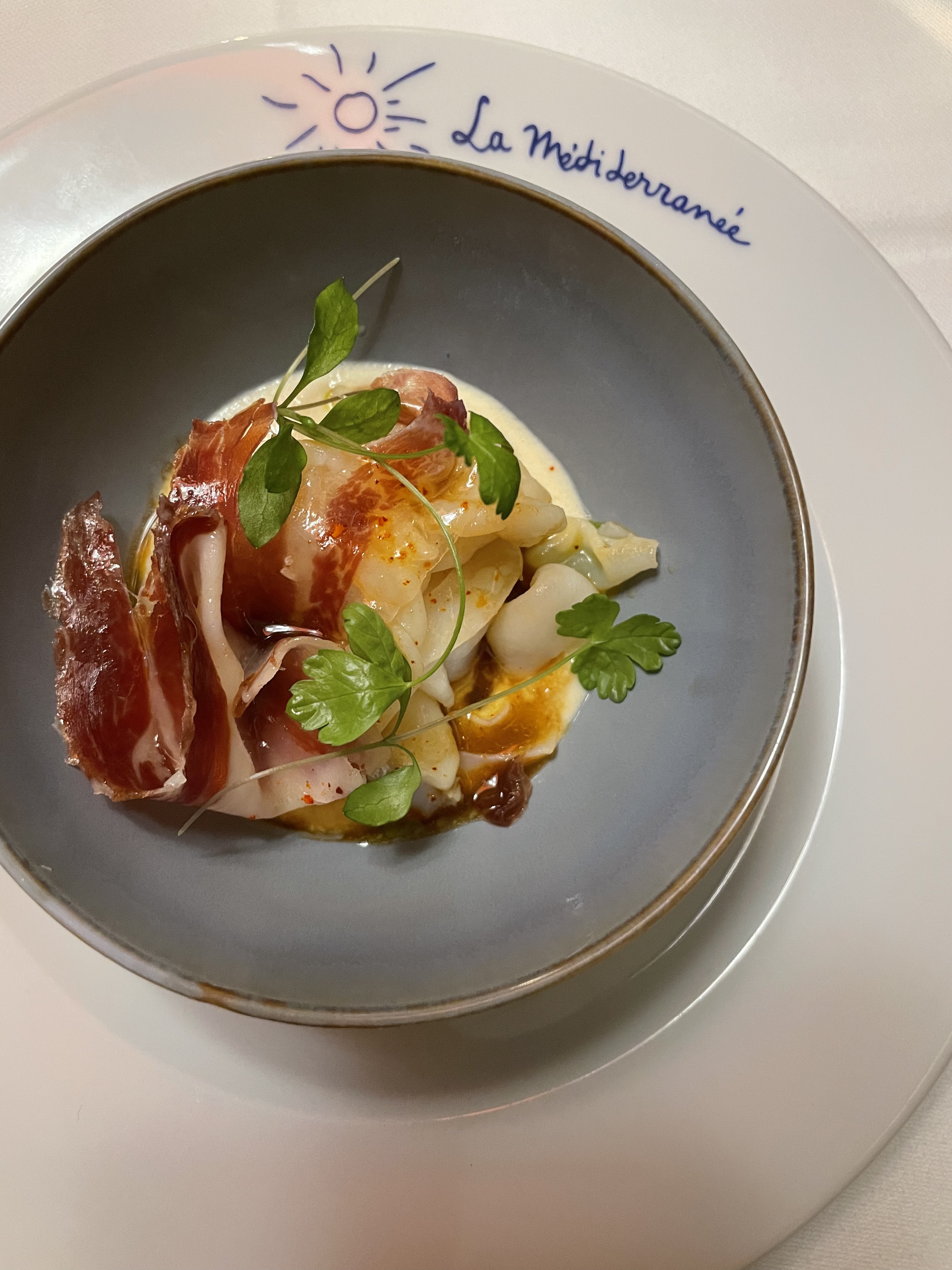 nous sommes dimanche 17 juillet. Les vacances scolaires ont démarré, c’est le weekend du 14 juillet. Il est 11h du matin et nous commençons à avoir faim. Beaucoup de restaurants sont fermés en cette période estivale. Nous regardons chacun de notre coté, elle, Tripadvisor et moi google maps. Nous repérons le restaurant La Méditerranée. Ma compagne me dit que ce restaurant est au guide Michelin. Les notes des précédents clients montrent que l’adresse semble intéressante. Nous réservons via The Fork. Nous voilà arrivés sous un soleil de plomb à l’aube d’une canicule de quelques jours. L’accueil est très poli et cordial. On nous dirige vers notre table. Tout se passe très bien pour le moment. Le menu nous est donné. Il tient sur une feuille presque A4. “intéressant” me dis-je. Je suis friand des cartes ultra réduites qui m’indiquent que le restaurant ne travaille que ces produits et devrait les travailler à la perfection. Nous prenons 2 menus, l’un à 31 euros (entrée + plat) et l’autre à 37 euros (entrée + plat + dessert). Un bémol : la serveuse ne nous a pas annoncé le poisson du jour, poisson du jour qui n’est indiqué nulle part. Je demande et j’ai la réponse. Nos entrées furent excellentes, gouteuses, fournies et raffinées. La soupe de poisson a plu à mon compagne ainsi que les croutons maison à l’huile et la rouille. Pour ma part, j’avais pris une piperade avec un oeuf parfait. L’ensemble avec une touche de coriandre m’a ravi. Cela démarre bien ! Nos plats du jour arrivent ensuite : cabillot avec sa polenta crémeuse. Nous nous sommes régalés avec ce coté rond et gourmand de la polenta, la fraicheur de la grenade et le coté filandreux du poisson. Un bémol mais vraiment personnel : trop de beurre ou d’huile. Encore une fois, cela dépend des goûts. Le dessert est classique : 3 boules de glace. Aucune information particulière donc pas maison. Pas de problème à ce sujet. L’addition se porte à 76 euros incluant la badoit à 8 euros. Globalement, c’est un vrai coup de coeur pour nous deux. Nous avons d’ores et déjà recommandé ce restaurant à notre entourage. Nous reviendrons. Merci de garder cette cuisine de qualité ! Votre mention dans le Michelin est pleinement justifiée.