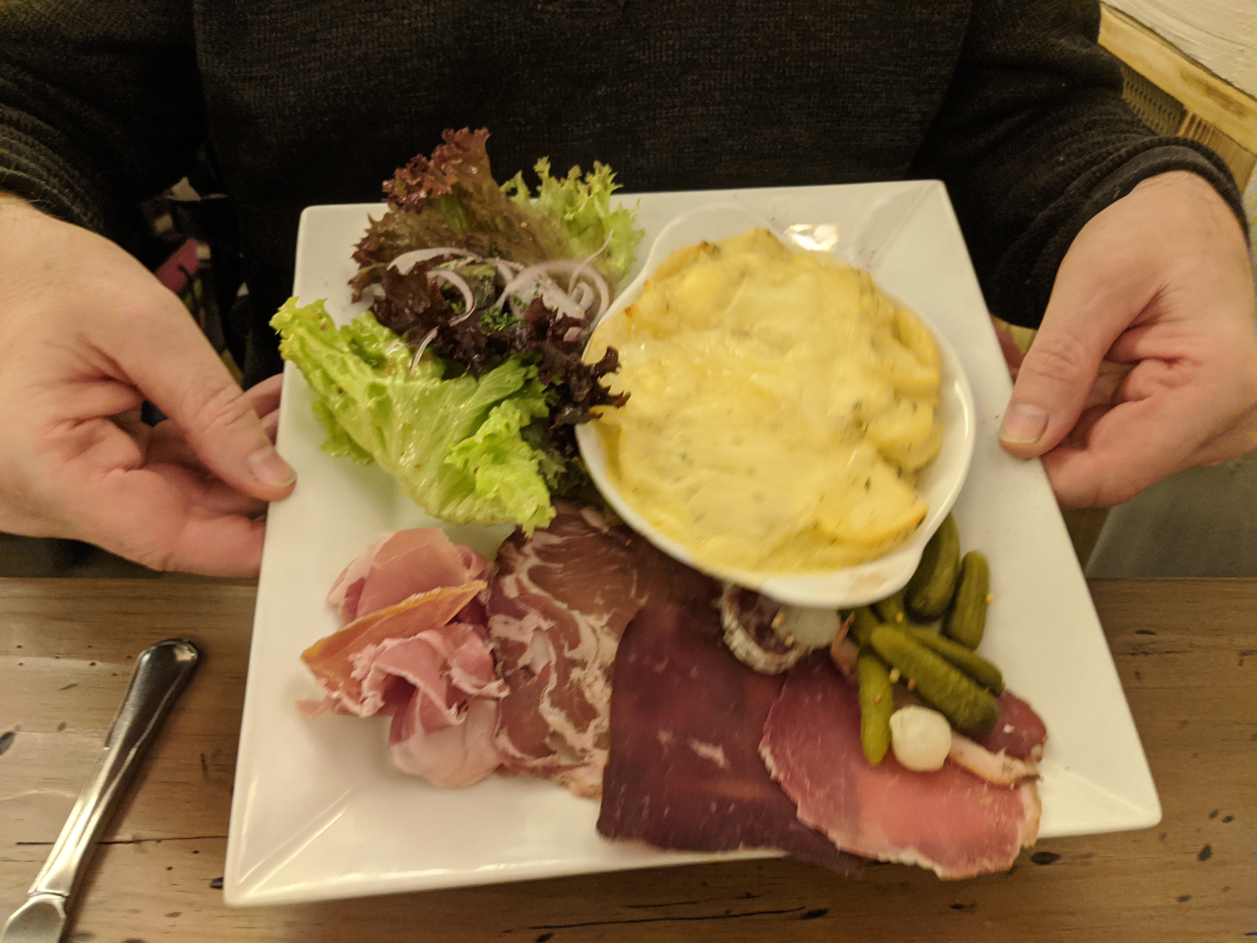 Très décevant, la charcuterie, sans doute coupée à l avance, etait sèche et sans saveur. Les pommes de terre au fromage et la charcuterie en très petite quantité, le tout au prix de 18 euros.