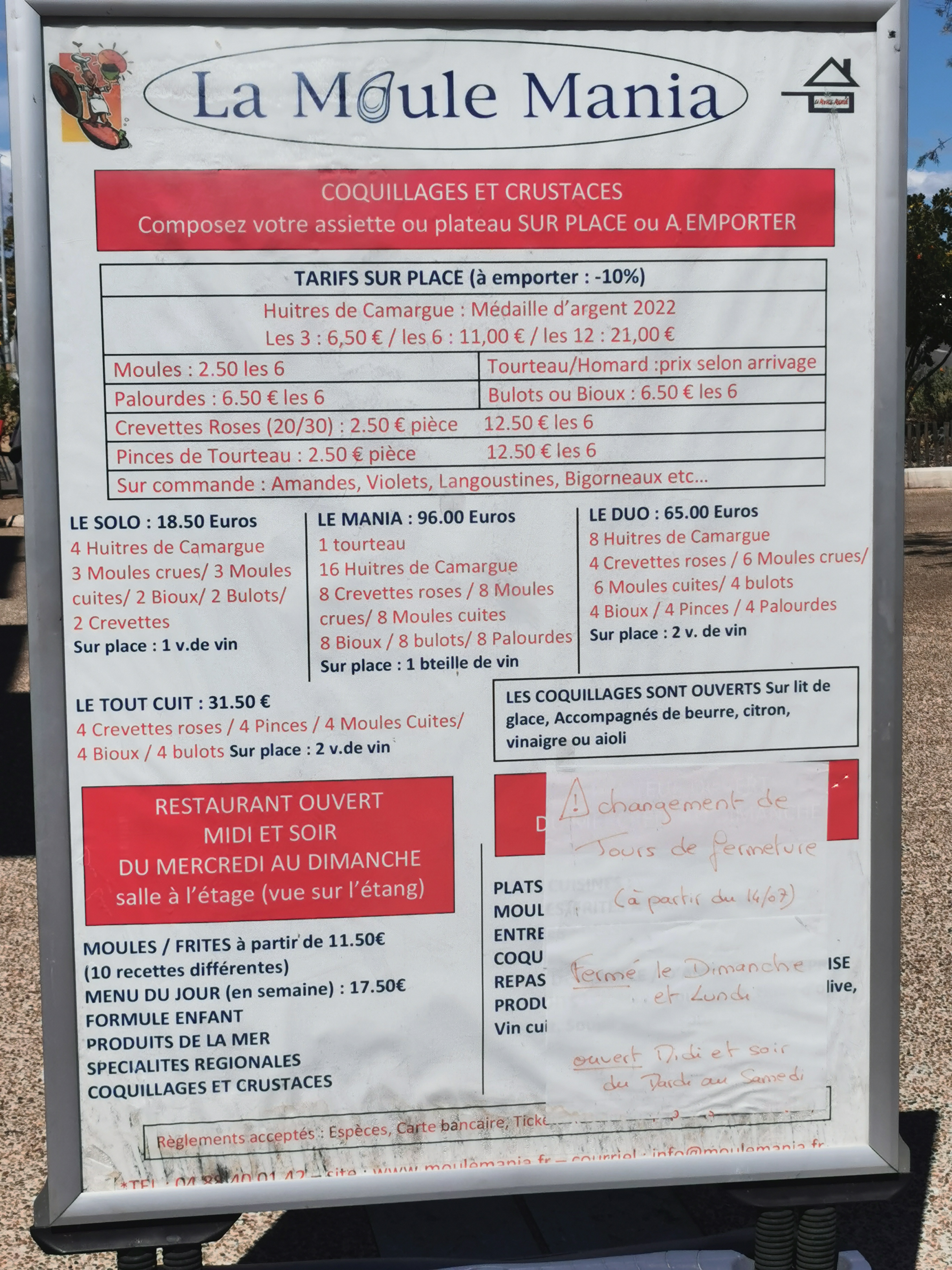 Des recettes de moules originales et pleine de saveurs. Ils se font démonter toute la semaine... Pensez à réserver. Je recommande c'est vraiment délicieux et les prix sont correctes. Produit locaux.
