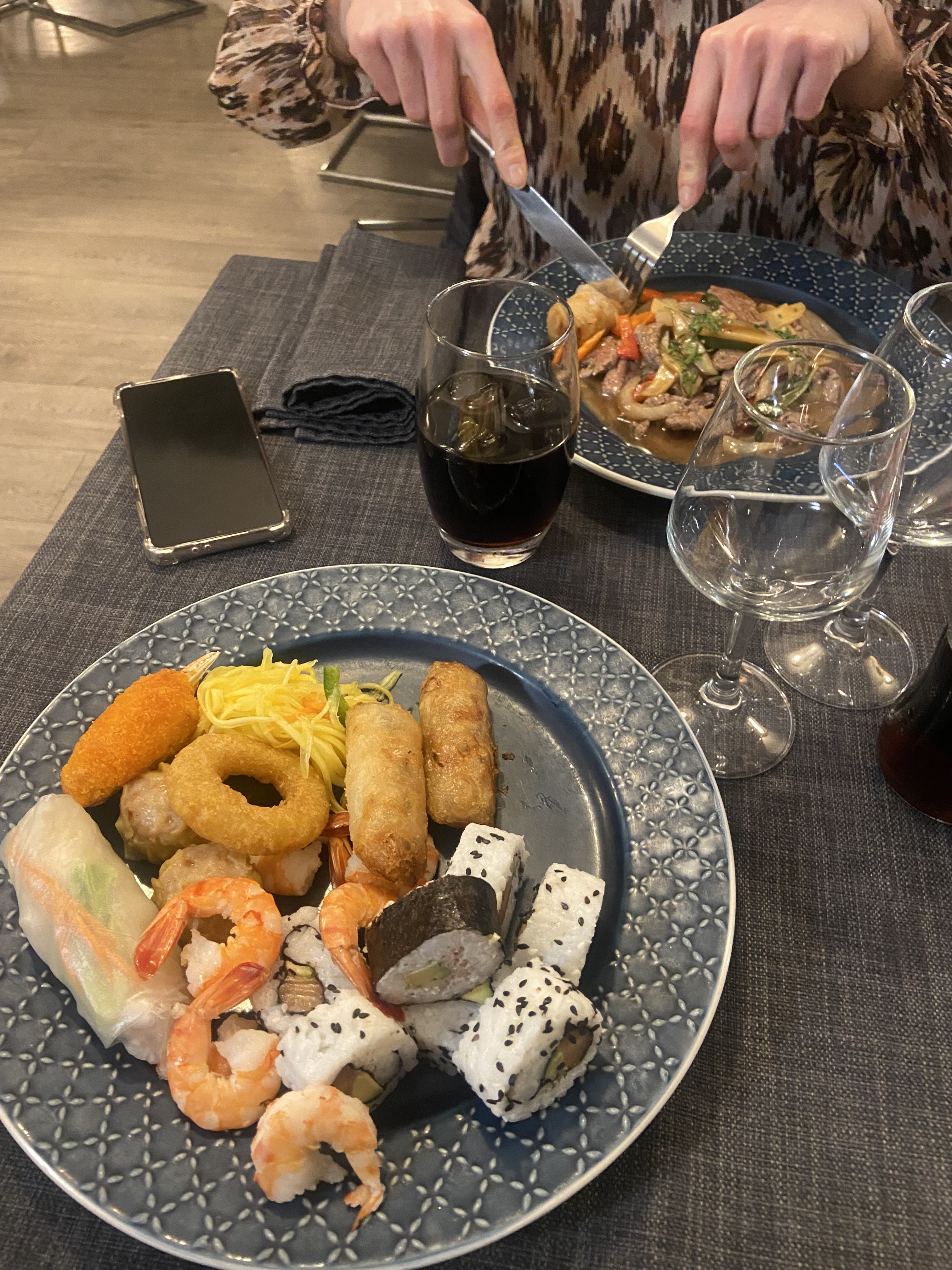 Première fois dans ce super restaurant avec une amie. Nous avons pu arriver à 20:30 et il y avait encore beaucoup de choix. En effet nous pouvons prendre à la carte ou bien choisir le buffet. Rien à voir avec les buffets classique le choix est assez limité , pas beaucoup de japonais plus centré sur du chinois , un buffet dit d entrée un buffet de plats chauds avec 8 choix de plats cuisinés en sauce tous délicieux la viande très bien cuite que ce soit côté buffet ou le choix à la carte. Nous avons fait exprès de choisir plat à la carte et buffet. Un choix de desserts également été présent mais déjà plus faim pour y allé. Je recommande vivement cette jolie découverte !! De plus le service est impeccable d’une gentillesse inouïe. Merci pour cette soirée j’espère revenir très vite