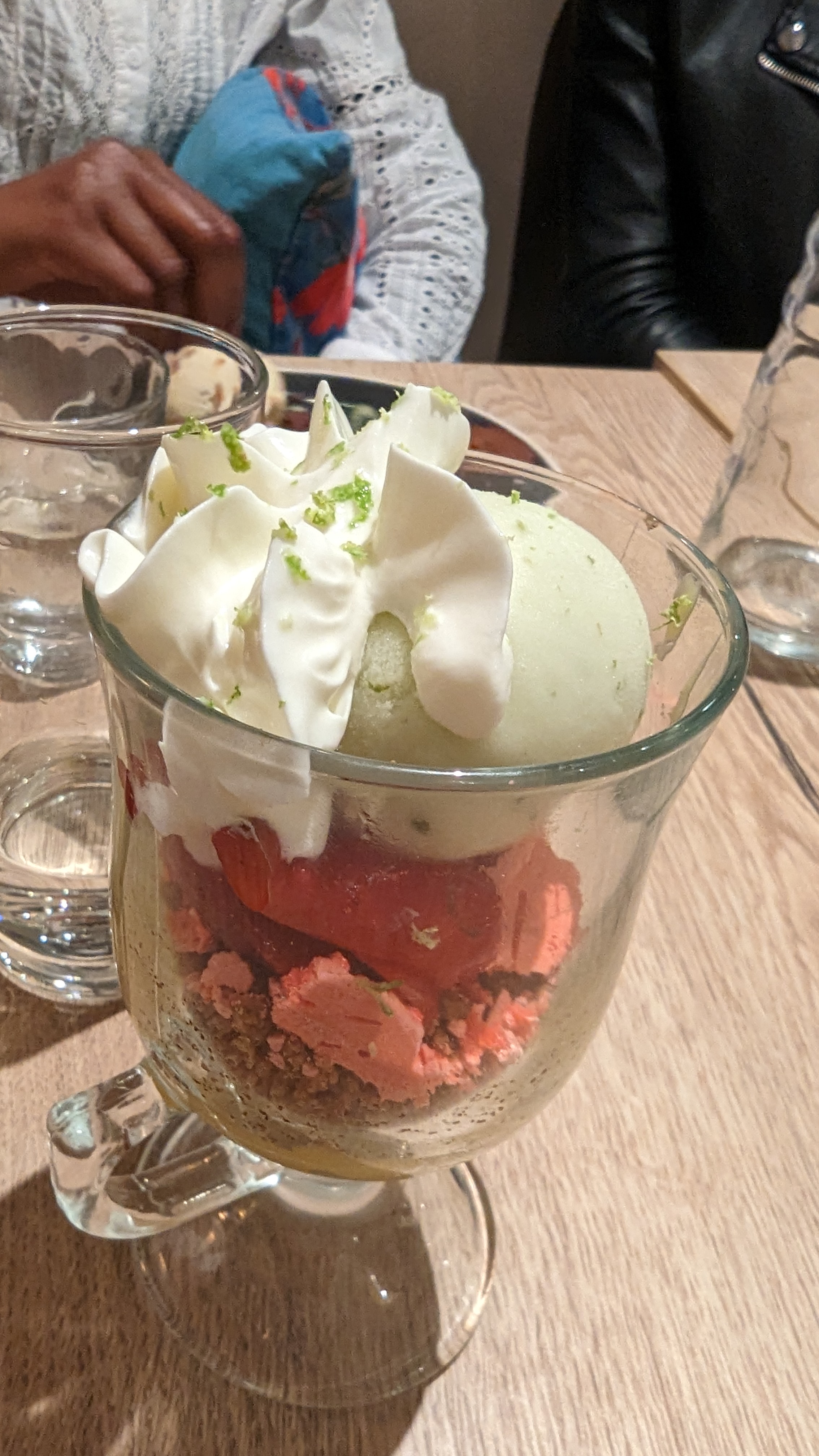 Bon accueil , personnel souriant. jolie présentation des plats. Mais déçue. Le feuilleté tomate mozzarella bon mais garniture peu généreuse. Filet de merlu - Ratatouille riz : nous n'avons pas eu de chance, le poisson n'était pas assez cuit le serveur l'a ramené en cuisine et on nous a ramené une autre assiette, le poisson était un peu plus cuit, le riz réchauffer et sec comme si il était passer au four... J'aurais apprécié d'avoir au moins le même volume de ratatouille que de poisson, j'aime les légumes et la petite portion servie est frustrante. Donc grosse déception . La soupe de mangue avec la boule de sorbet framboise est original mais décevant, je n'ai pas aimé la soupe de mangue, j'ai eu l'impression de manger de la mangue pas assez mûre. Je ne parle pas du peu d'espace entre les tables. Dommage.