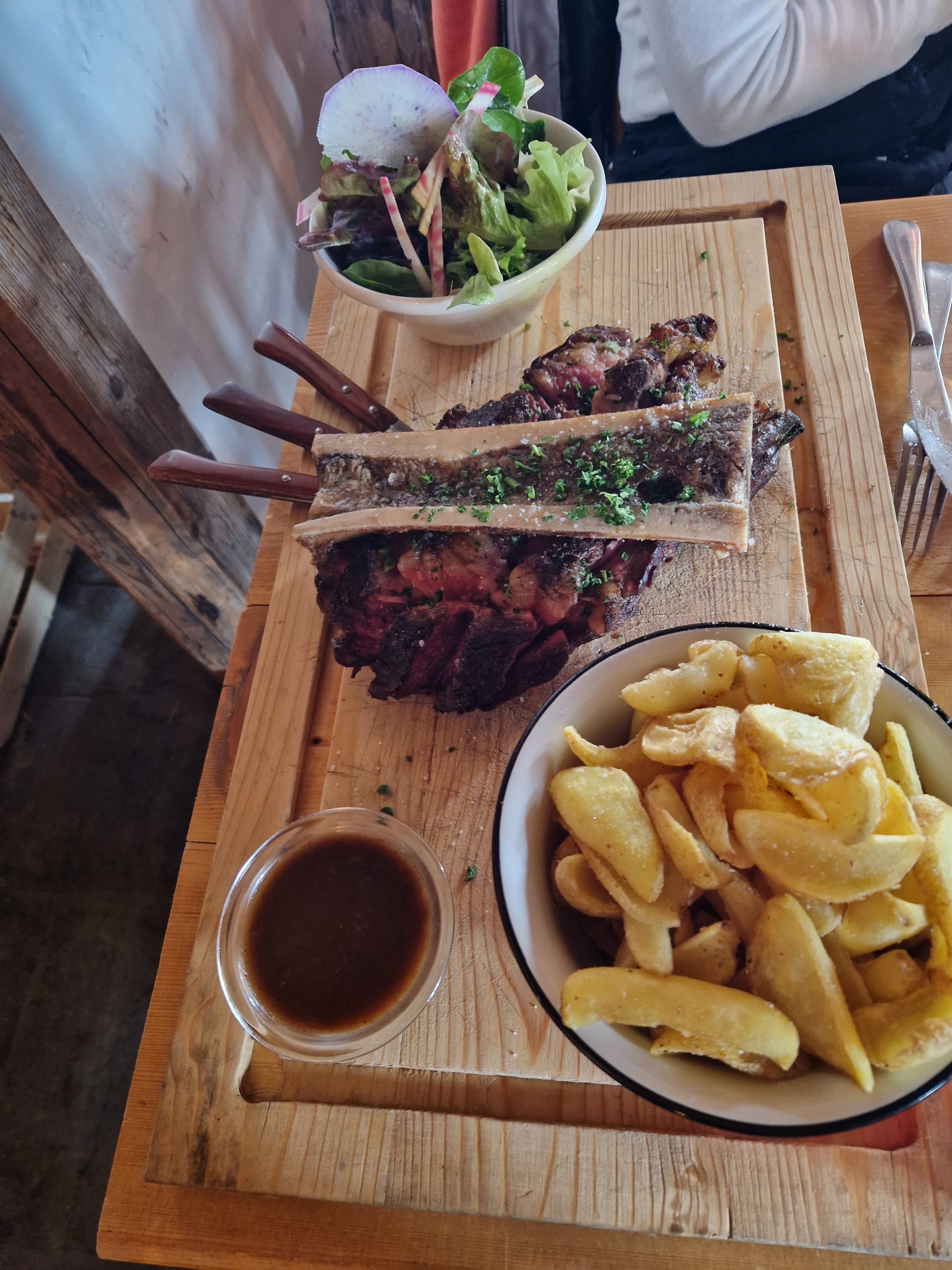 Une très belle adresse sur les pistes. Des grillades de qualité et une côte de bœuf très bien cuite, on a apprécié l'os à moelle pour accompagner et la sauce poivre aux épices. Dessert toujours maison et délicieux 😋