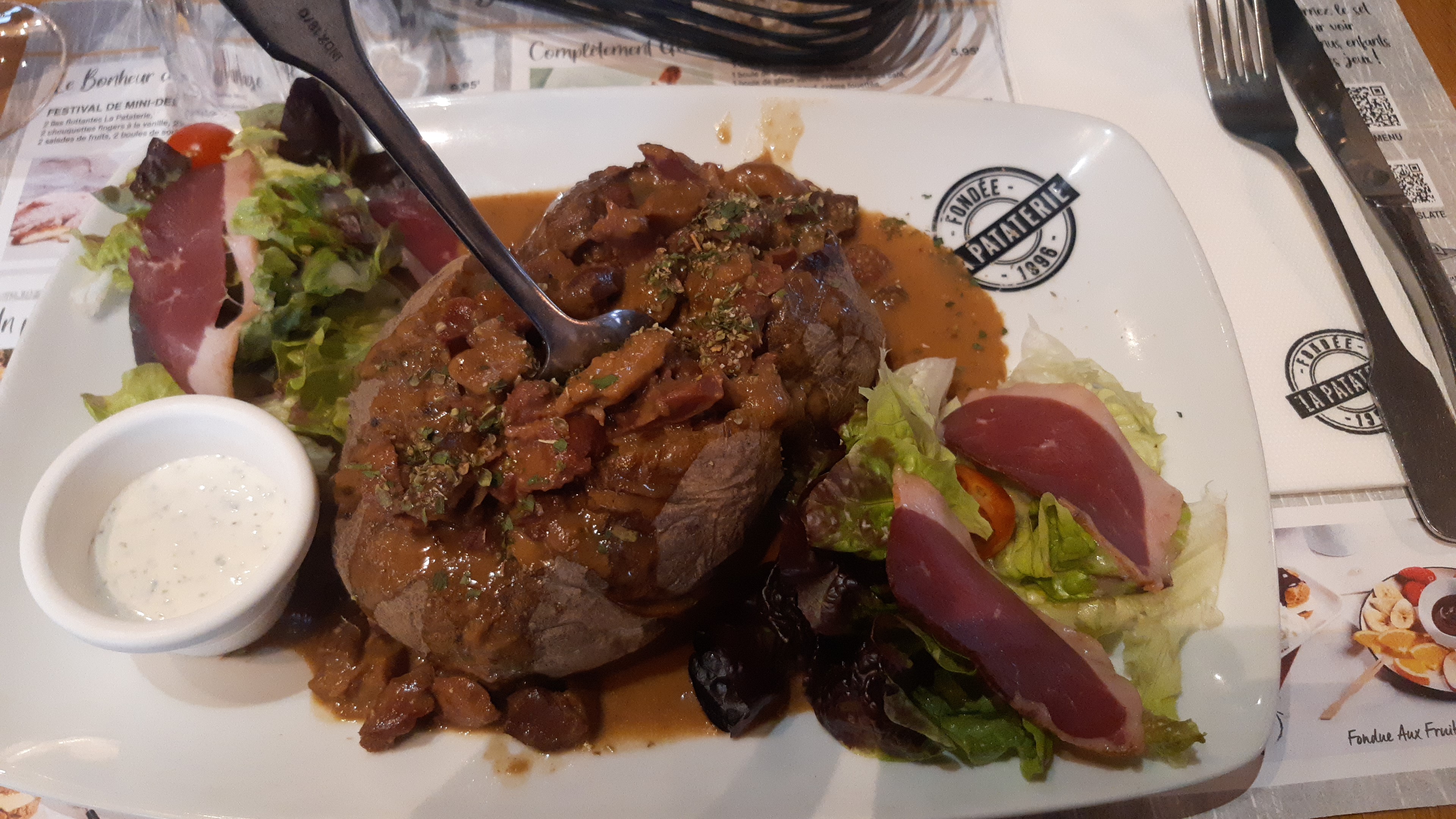 Une première a la pataterie avec une Perigourdine ou plutot son échantillon : 4 mini tranches de magret, 3 feuilles de salade (pour de vrai !) et une tomate cerise 🧐 une grosse patate bien sur! Mais a ce prix la digestion est difficile. Le serveur était gêné mais nous a expliqué les nouvelles restrictions de quantités. Dommage, le cadre est sympa et le service agréable. La dernière...