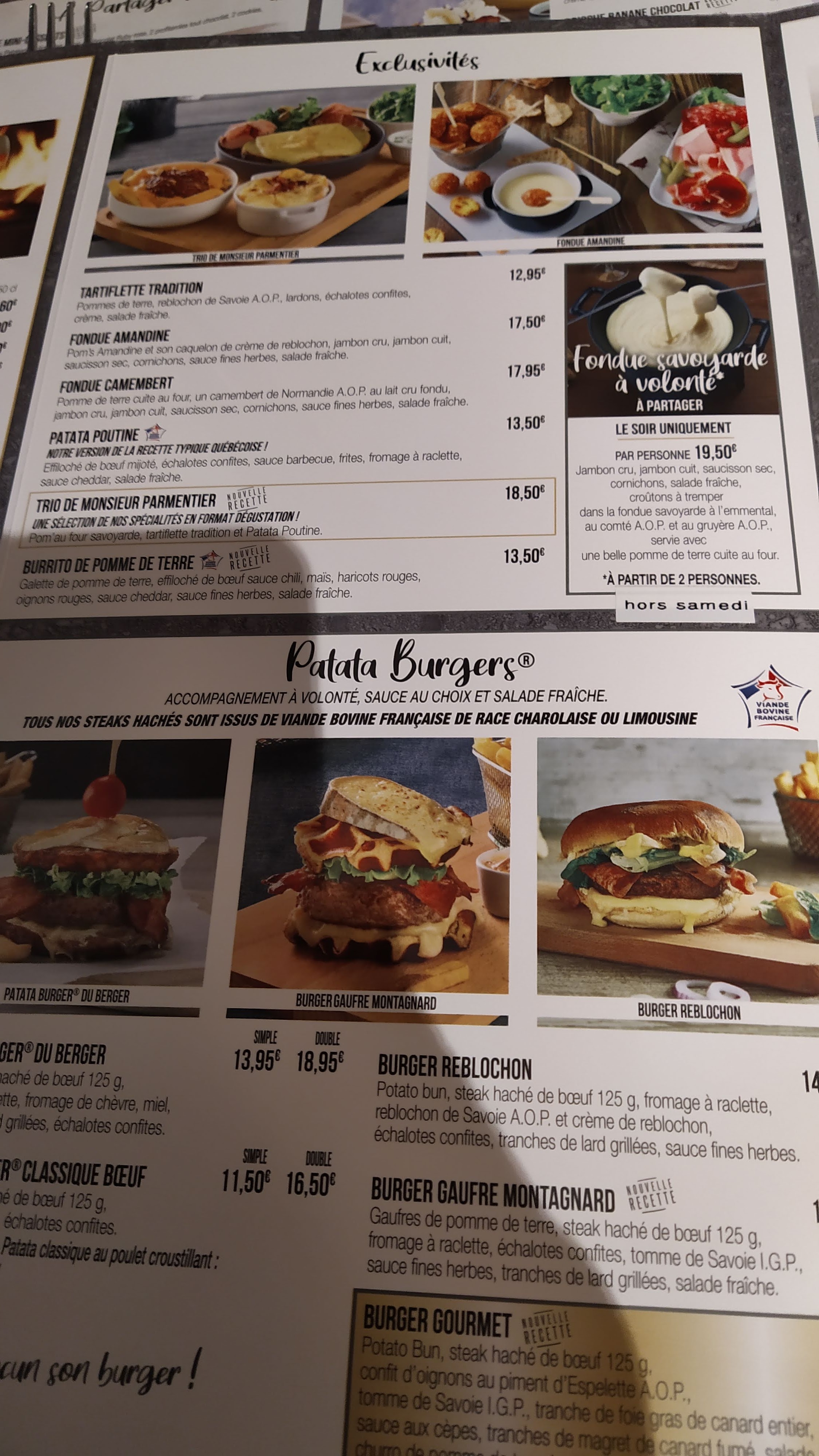 Une première pour nous et nous avons passé un bon moment. Un superbe accueil et des serveurs très agréables. Nous nous sommes retrouvés avec 2/3 aliments encore congelés dans notre plateau d’apéritif et le serveur nous a redonné un plateau complet pour s’excuser. N’ayant pas fini notre plateau à la fin du repas, nous avons pu repartir avec dans une boîte. En revanche, cela serait bien que le personnel de cuisine vérifie la cuisson de leurs aliments car avec un plateau d’apéritif en plus, nous n’avions plus de place pour un dessert qui nous donnait bien envie. Pour une pataterie, nous étions un peu déçu de ne pas avoir des frites maison, mais cela doit sûrement être dans tous les restaurants de la chaîne. Un gros + pour le personnel très chaleureux et souriant.