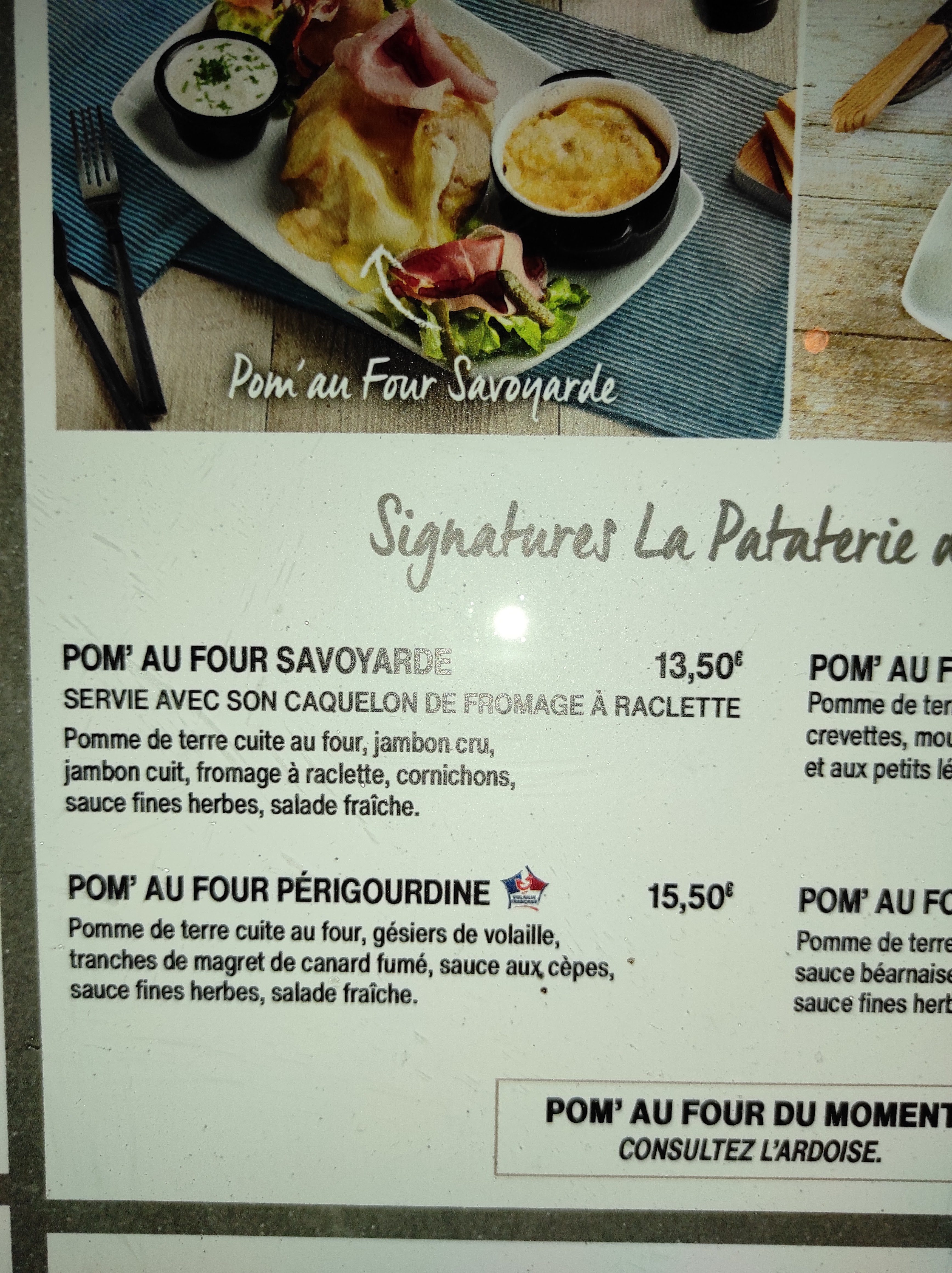 Des plats simples et variés autour de la patate. Un grand choix sans pour autant se perdre avec des produits compliqués hors sujet ou non préparé sur place. Très satisfait 9 repas sur 10, je trouve en revanche que les desserts comportant du caramel ne sont pas bien dosés le caramel est trop présent et efface toute la complexité les texture et le goût du reste du dessert.