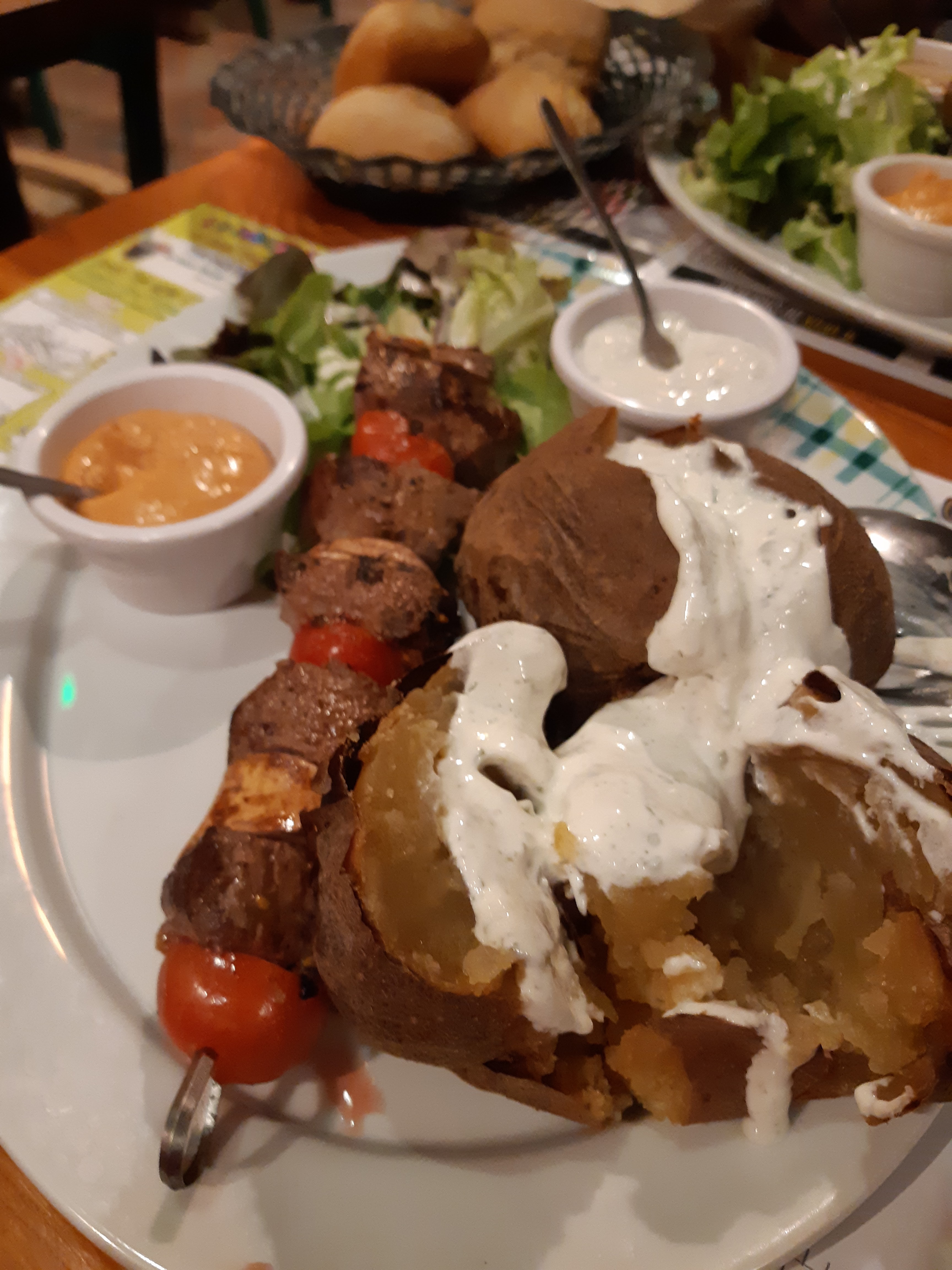 Le lieu est chaleureux, un décor champêtre agréable. Peut être un peu bruyant si la salle est complète. En été ou par beau temps , préférez la terrasse. L équipe ( le soir ou nous étions ) etait professionnel mais paraissait novice sur la connaissance du menu et la technicité du service. La carte des plats est bien garnies, tout tourne autour de la patate ( ce qui est bien normal me direz vous ). Les assiettes sont copieuses, personnellement les entrés ne sont pas nécessaires. Le rapport qualité prix est un peu élevé à mon goût vu la non complexité des plats proposés. Les desserts sont variés également, bien que moins consistants et volumineux que ce que l on se attendrais à recevoir. Ne vous attendez donc pas à de la grande gastronomie, mais cela fais bien son affaire pour un moment de détente entre ami ponctuellement. Je conseille pour le principe et la découverte du lieu et j y reviendrai.