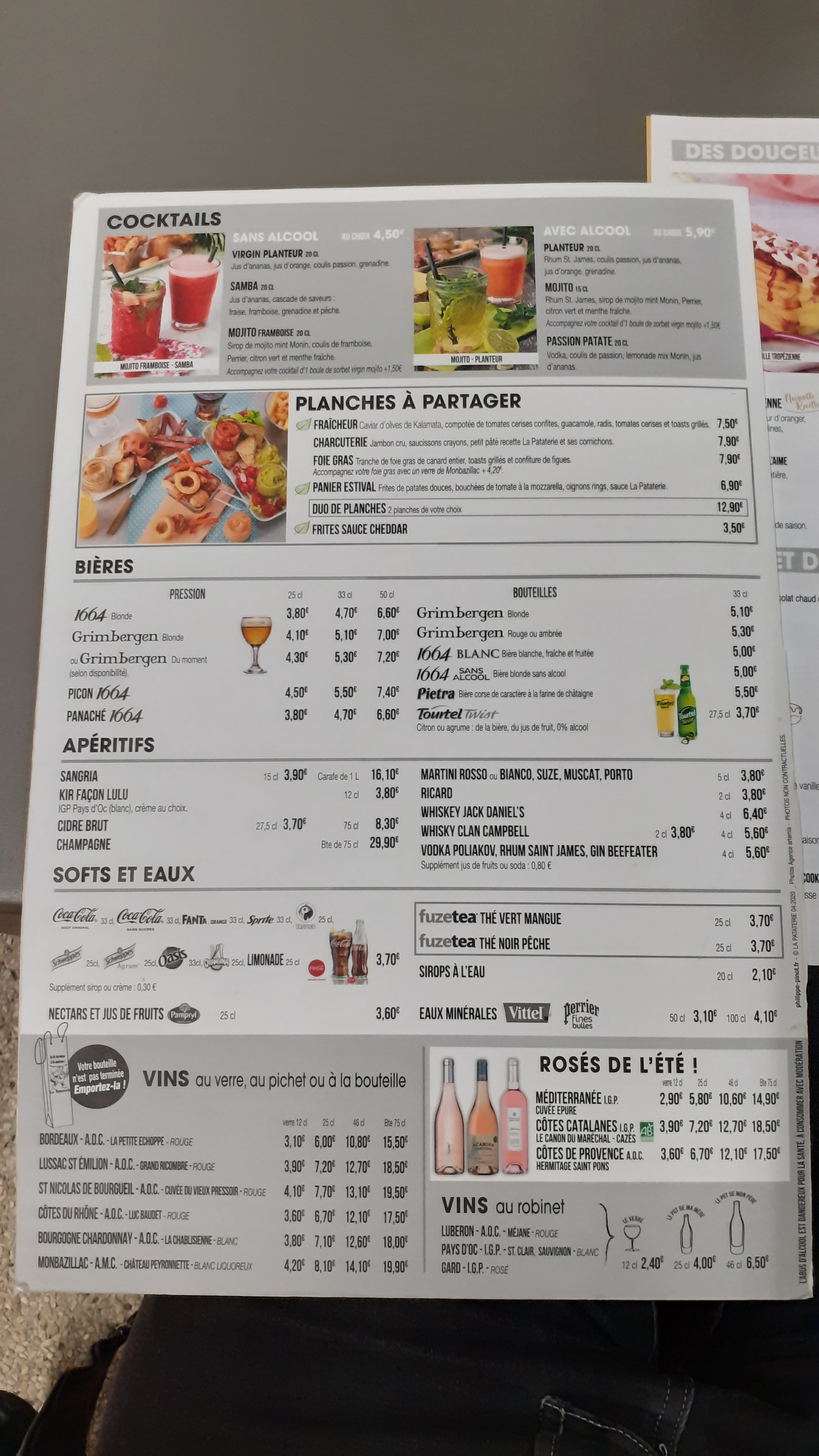 Accueil mitigé, serveuses sympathiques mais peu présentes. Des parasols qui ne fonctionnent pas donc le choix de manger soit en plein soleil soit à l'intérieur sans climatisation avec une chaleur étouffante. 25min pour la prise de commande puis 20 min avant d'être débarrassé pour les desserts, 1h30 passé au restaurant pour un apéritif et un plat. Des mojitos véritablement imbuvables. Les plats étaient bons sans être exceptionnels mais très déçus d'avoir des frites surgelées quand le restaurant s'appelle la pataterie, de plus servies presque froides.