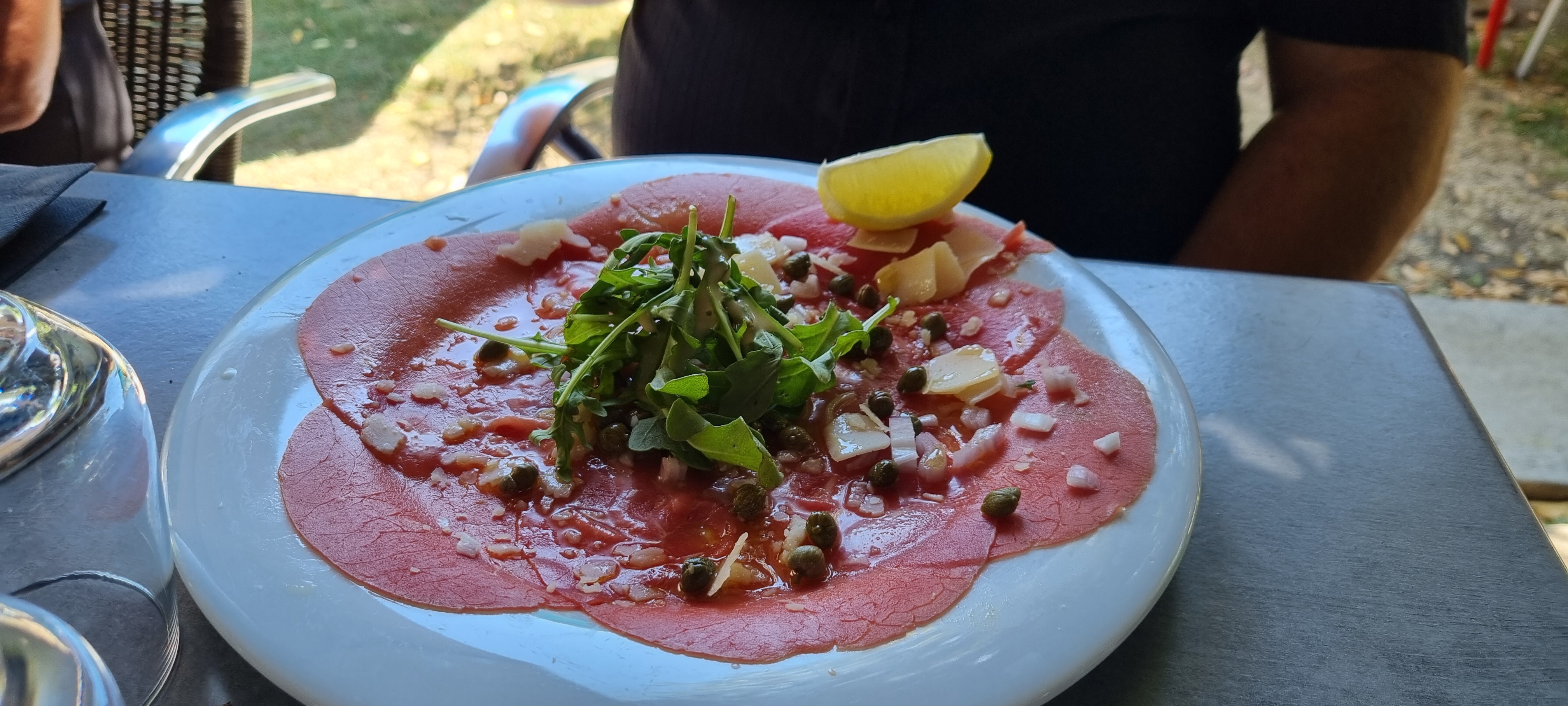 Délicieux carpaccio bien assaisonné suivi d'un risotto de gambas, tous les gestes barrieres sont respectés