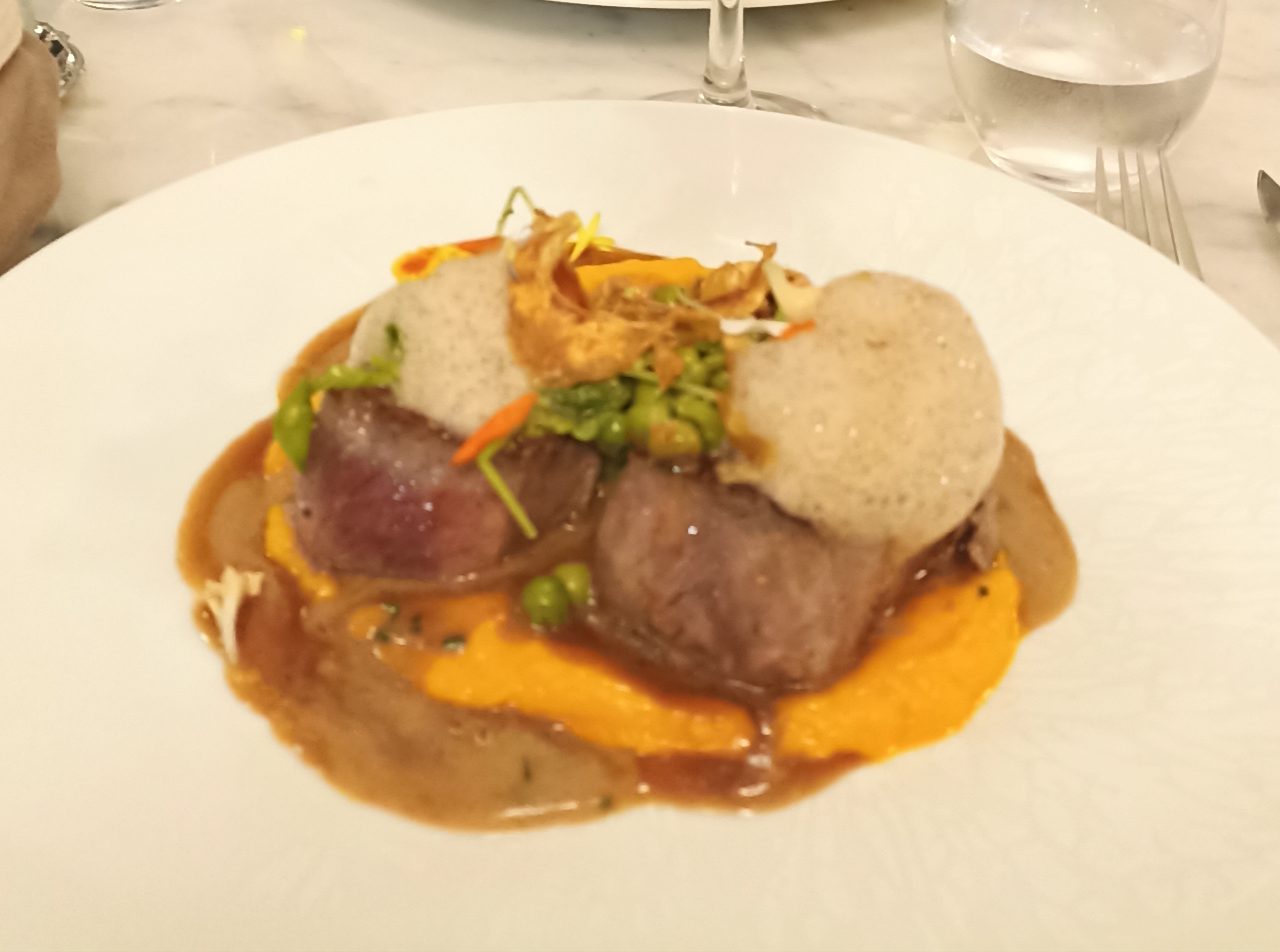 Belle salle de restaurant. Beaux et bons produits dans l assiette. Belle présentation des mets. Service attentionné. Petit bémol sur le boeuf, dur à la découpe et à la mâche. Ainsi que le niveau sonore du saxophoniste en live...