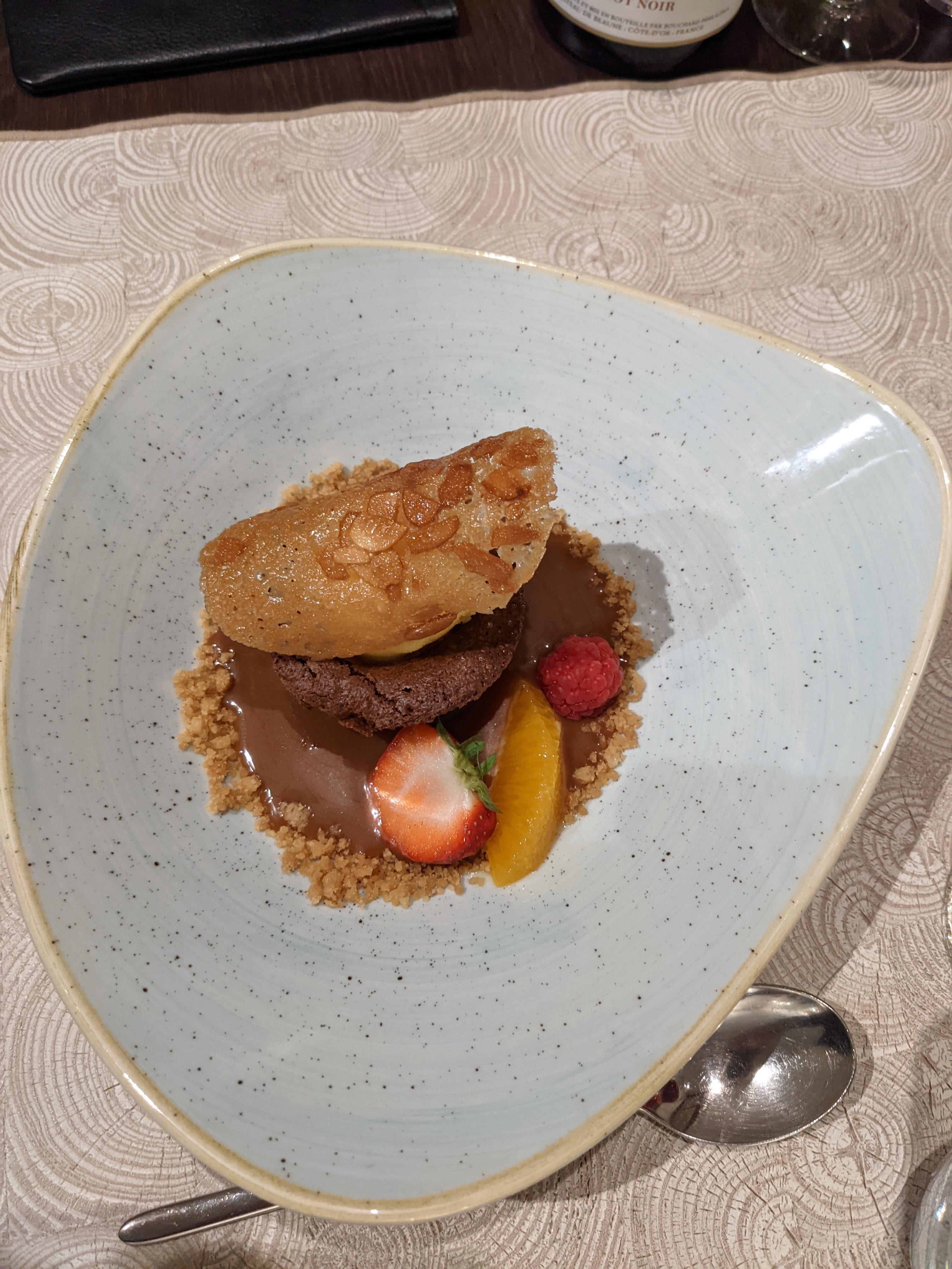 EXCEPTIONNEL !!!!!! j’ai eu un poisson avec des légumes et pomme de terre , un fondant chocolat avec une tuile EXCELLENTE REPAS !!!! L’accueil génial , le décor 🤩🤩🤩🤩