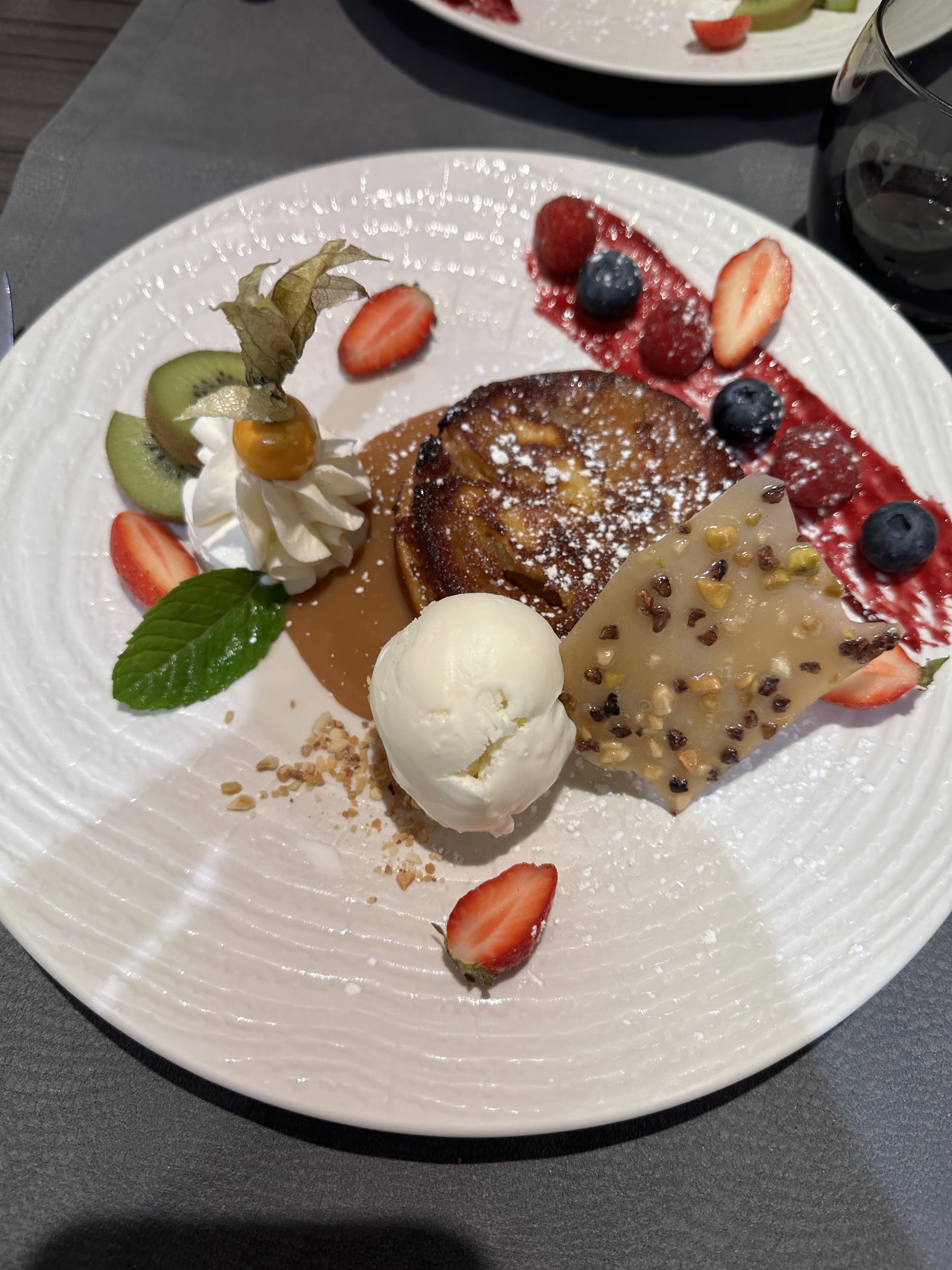 Très bonne soirée . Nous avons pris des plats à la carte, délicieux ainsi que les desserts tout aussi bons et copieux. Le service est parfait aussi. Nous recommandons avec grand plaisir.