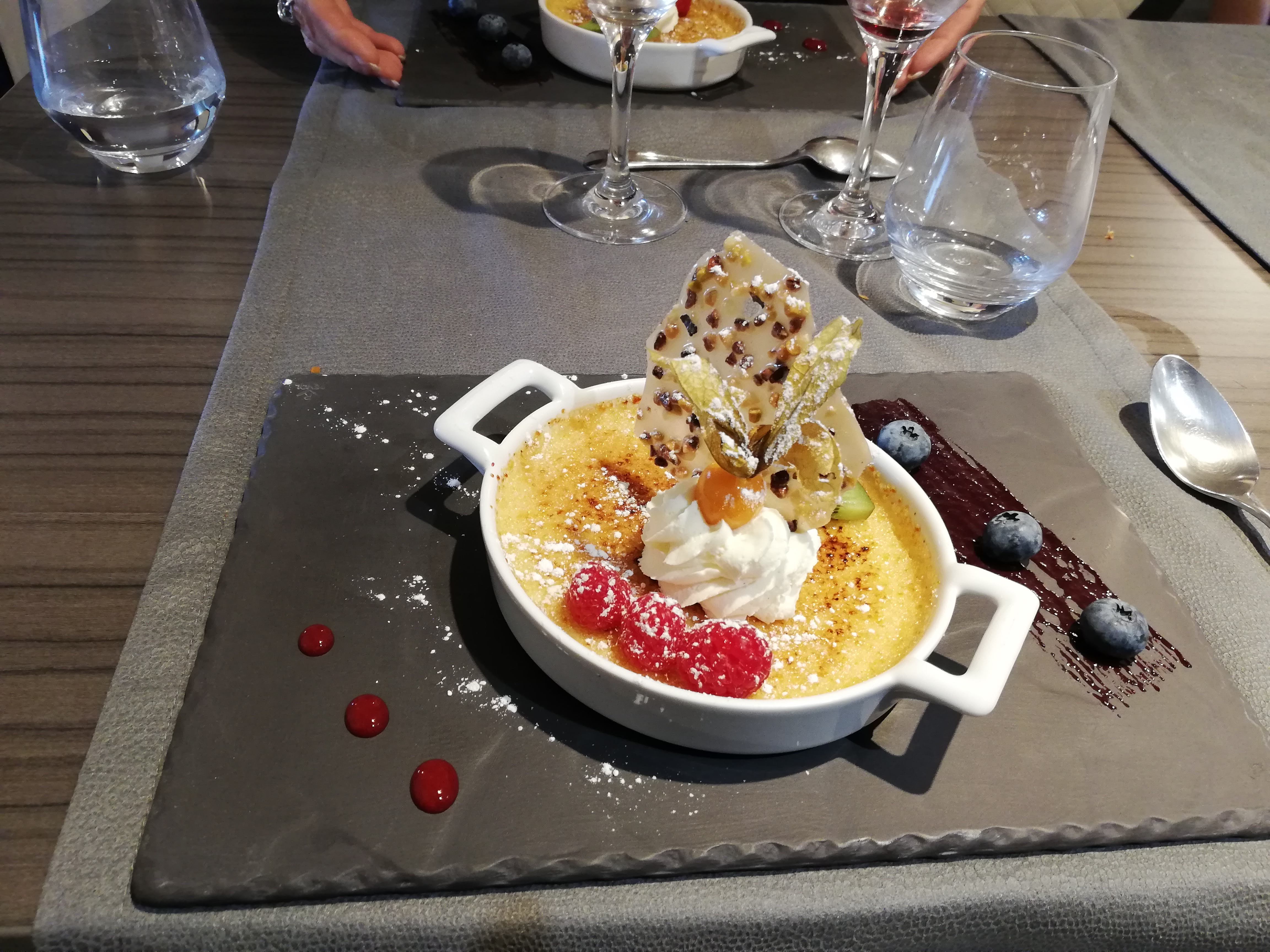 Repas excellent... Foie gras poêlé à la mangue délicieux Crème brûlée 😋