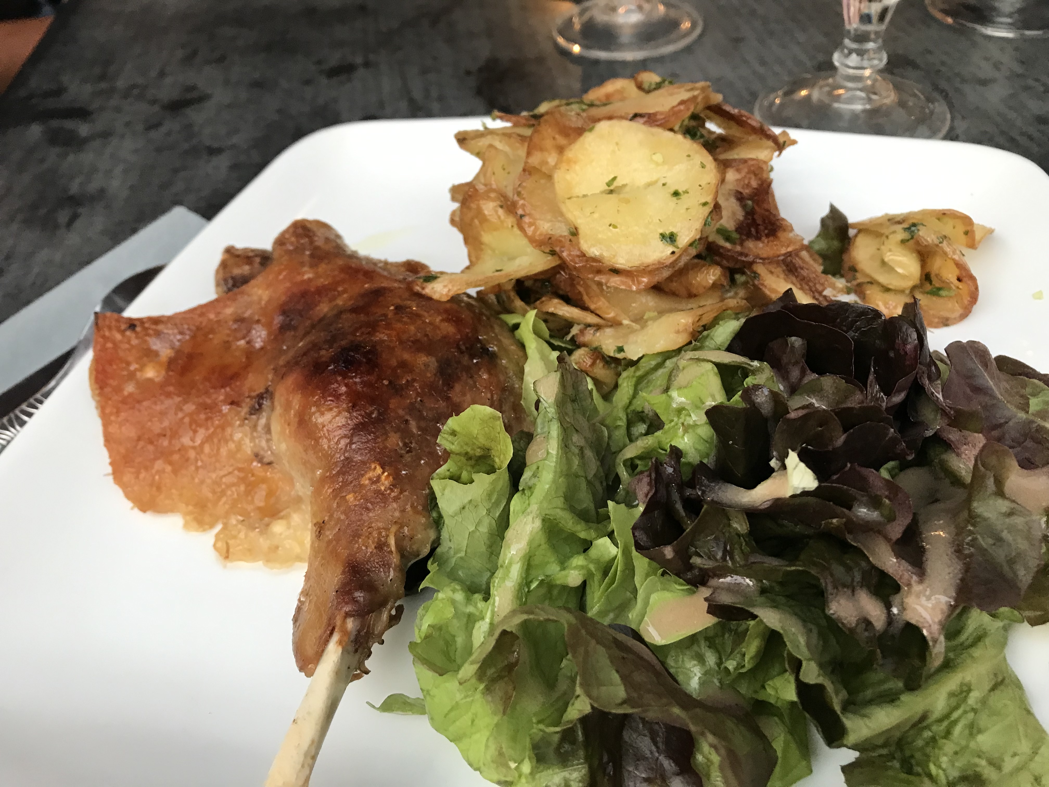 Le menu à 28 € à base de canard est correct sans être exceptionnel. Le foie gras dans la salade Périgourdine n'est pas des meilleurs que j'ai mangé, loin de là. La serveuse très agréable à regarder est par moment un peu à l'ouest. Ne semble pas vraiment maîtriser le contenu des menus et s'implique au minimum. A notamment refusé qu'un couple s'installe à une table sous prétexte qu'elle n'était pas dressée. Ce n'est pas le temps qu'elle aurait perdu pour déplacer deux couverts, d'autant plus qu'elle était loin d'être débordée avec le peu de monde présent. Le top des flops, elle m'a retiré la corbeille de pain, au demeurant pas du jour, quand elle m'a servi le fromage. Heureusement le cabecou était sur une petite rondelle de pain. Possibilité de manger en terrasse casée dans une arrière cour. Le cadre n'est pas des plus agréable.Globalement l'ensemble ne mérite pas ce prix là.