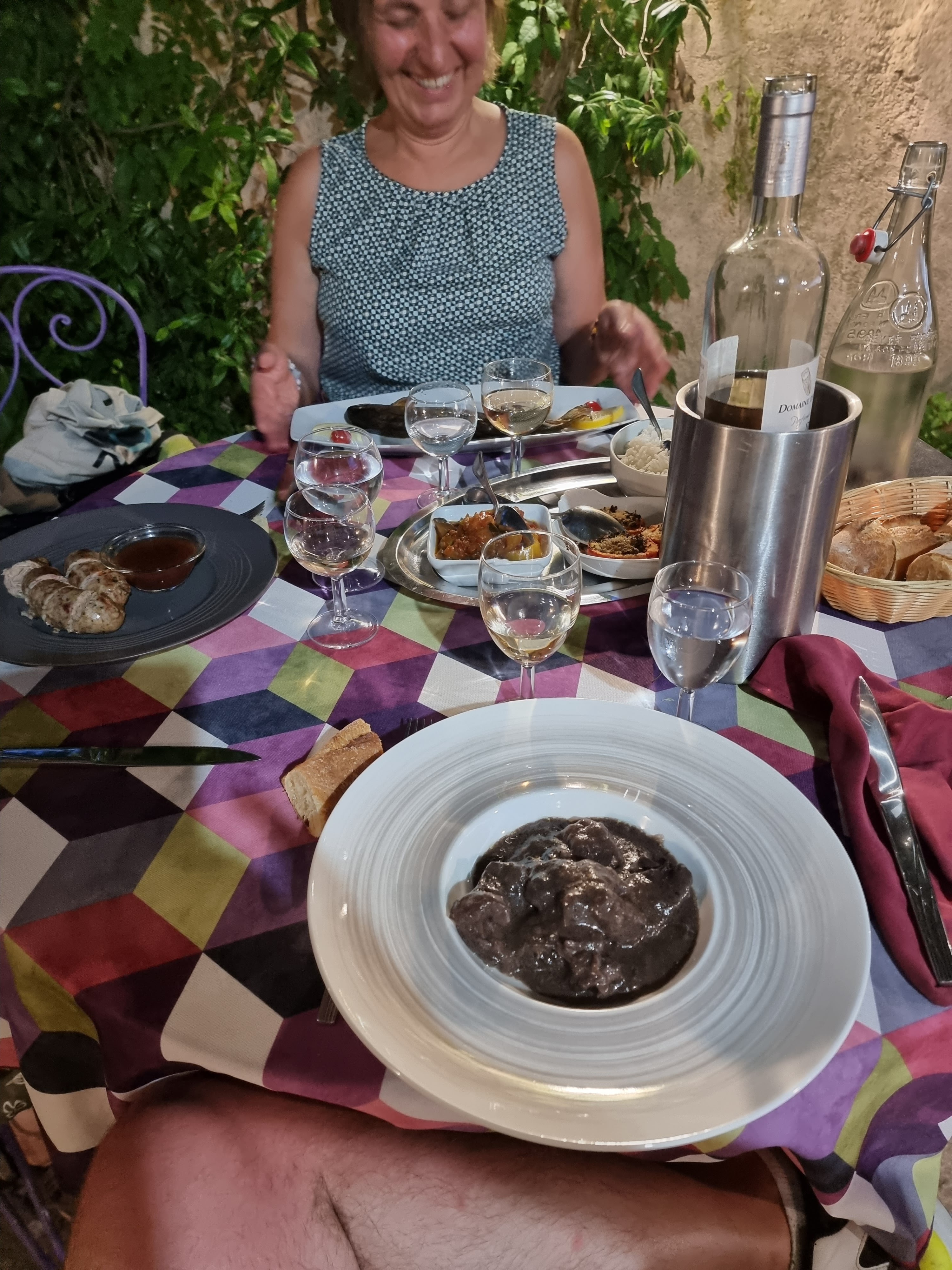 La cuisine provençale la plus authentique lorsque nous voyageons en France. Le petit restaurant dans la cour provençale semble discret de l'extérieur.Après notre entrée, le propriétaire a aménagé avec enthousiasme l'endroit dans la cour. Dînez dans le jardin à midi, un déjeuner tout à fait unique et somptueux. Un vin local riche en fruits, génial ! Le jardin est plein de verdure, avec des fleurs blanches parfumées, des fleurs à gousses et de la lavande. Le patron ne parlait pas anglais, mais il était très gentil ! J'ai commandé de la viande de chèvre mijotée dans du vin rouge, et c'était délicieux.