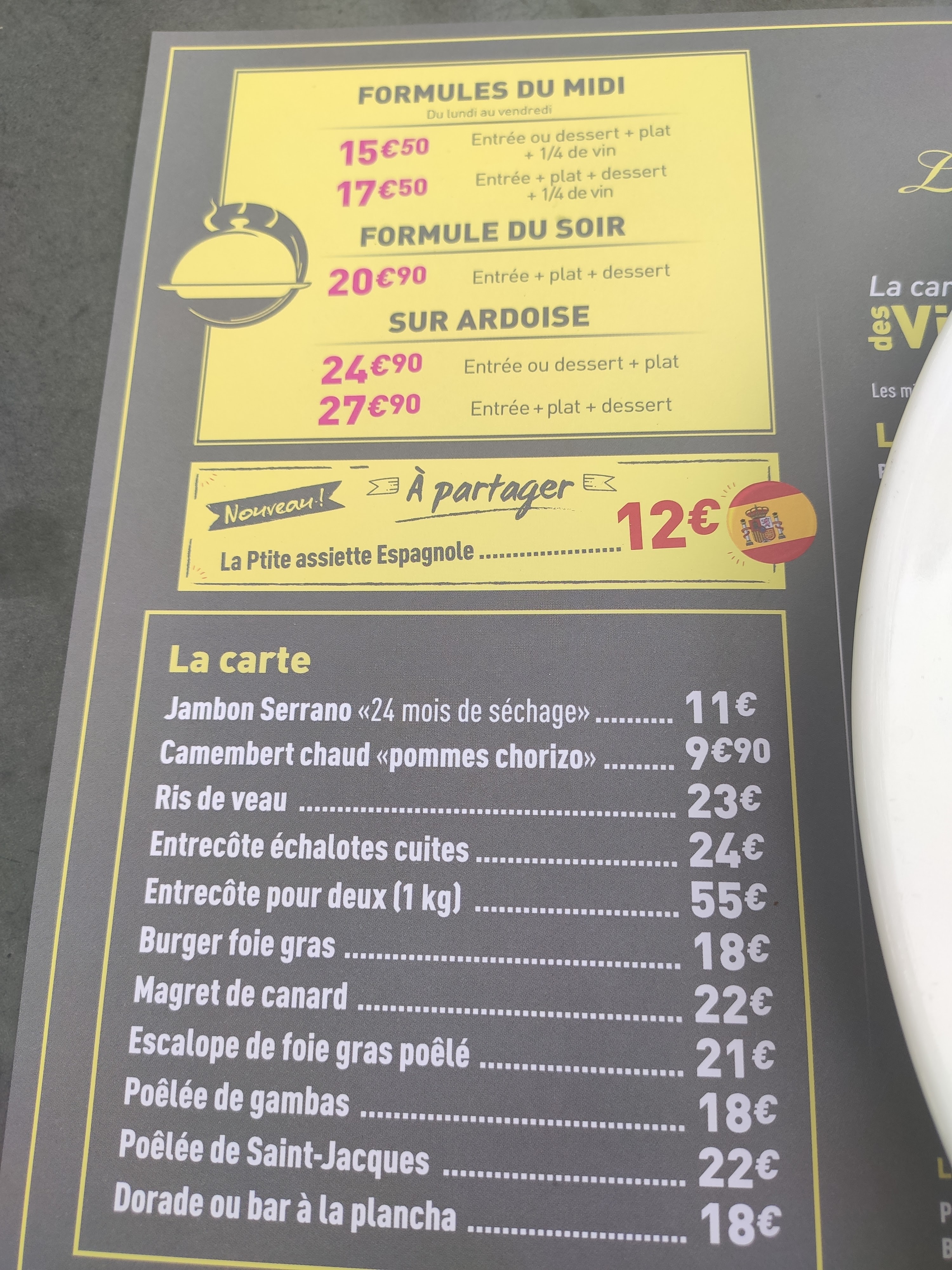 Des menus composables à des prix très abordables ! Les menus à l'ardoise. Le midi : entrée/plat ou plat/dessert pour 24,90€ Formule entrée/plat/dessert pour 27,90€ Supplément de 2,50€ pour les Saint Jacques. Et 3,50 pour les riz de veau ( pas assez cuits ) Bel assortiment de desserts.